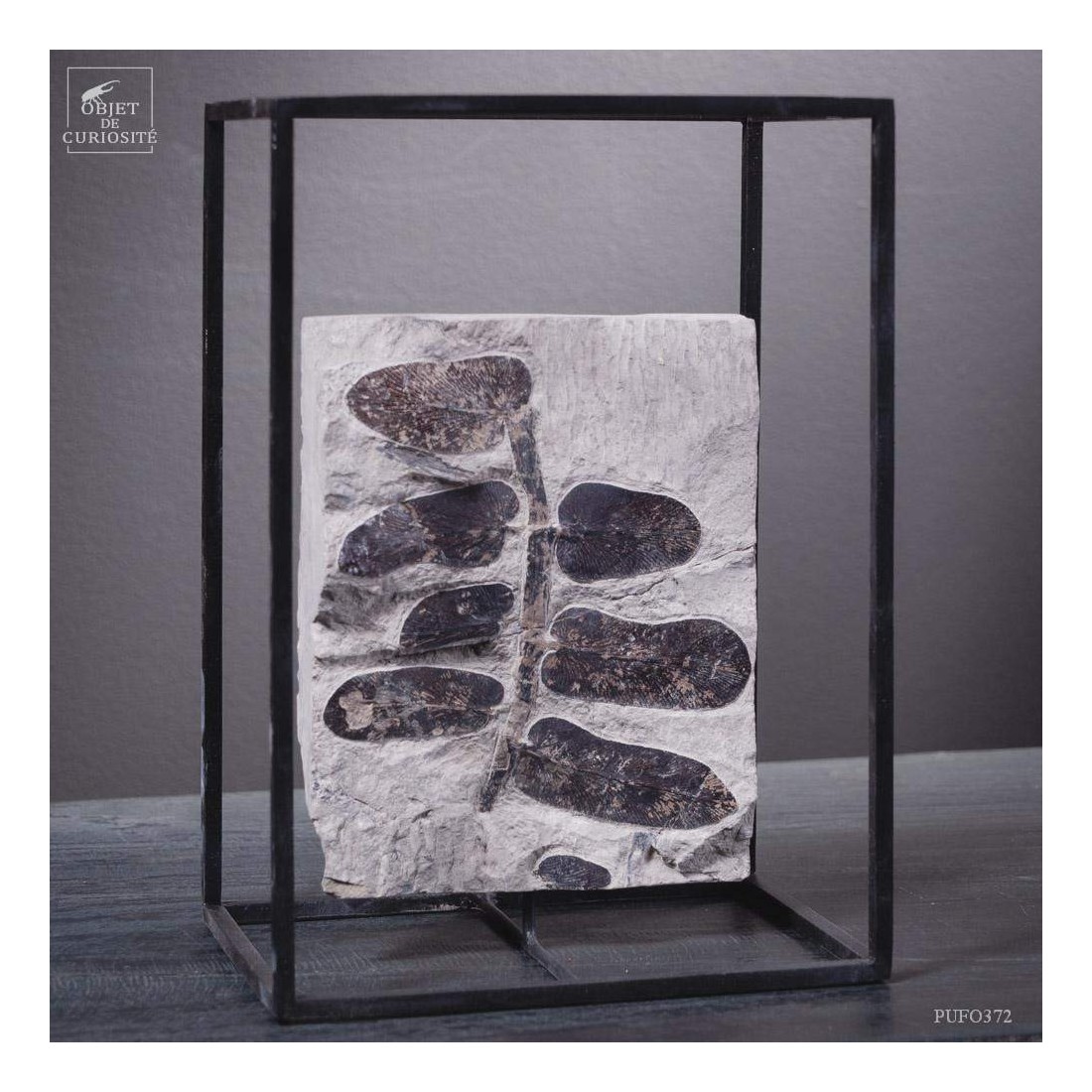 Cette curiosité n'est pas aussi contemporaine qu'elle en a l'air. Cette présentation très graphique a, en fait, 250 Millions d'années. Il s'agit de feuilles d'un arbre préhistorique de la fin du Carbonifère: Le Neuropteris Cordata. Ce fossile provient de Montceau les Mines, en France, où le charbon a été extrait pendant 160 ans, et définitivement arrêté en 2000. Ces spécimens font partie d’une ancienne collection datant de 1970.