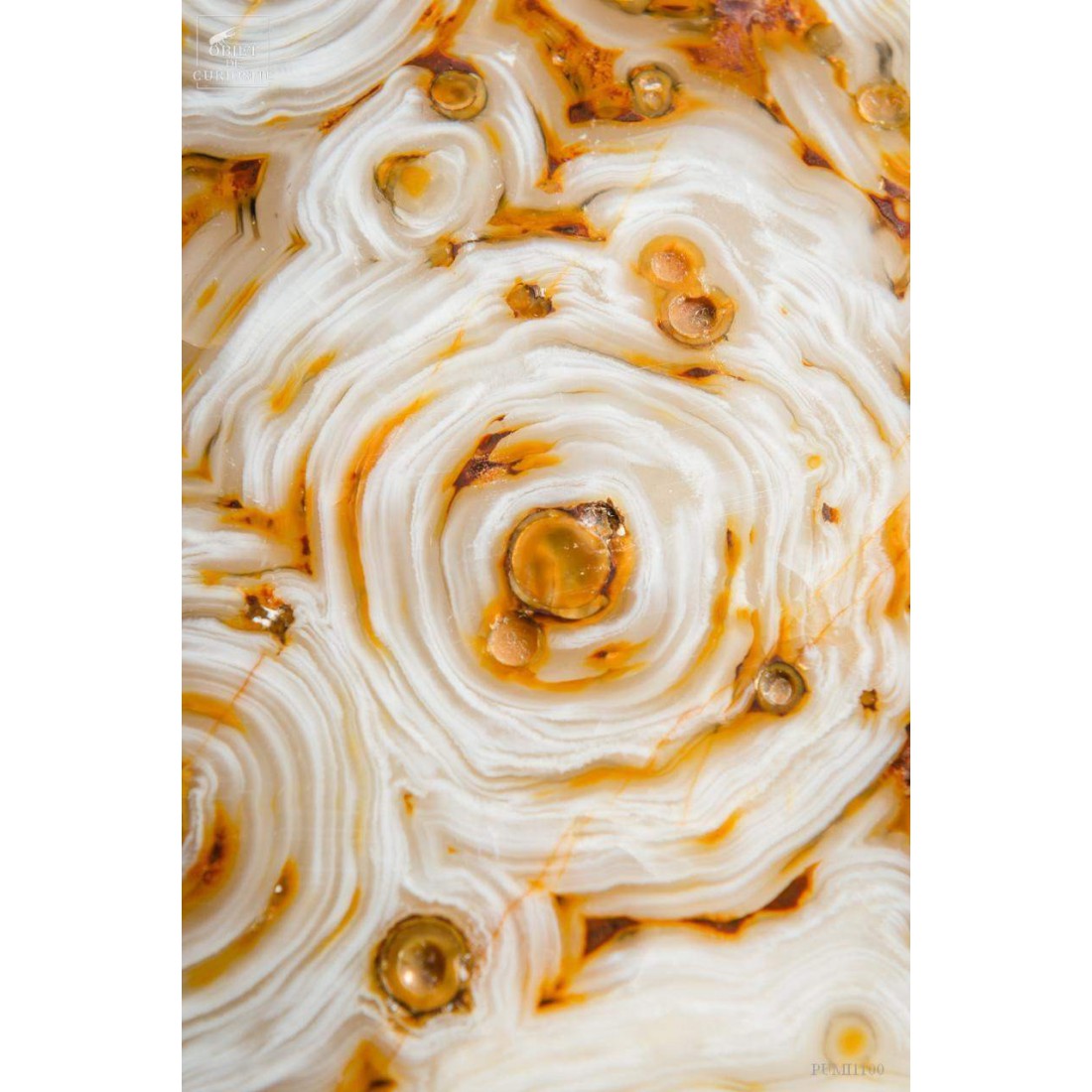 Avant d'être découpée en fines tranches, une Agate est un gros galet. Cette pièce est donc le galet entier. Trouvé à Rio do Grande do Sul, au Brésil près de la frontière Uruguayenne. La rivière lèche la colline de la formation basaltique de Parana , qui comprend beaucoup de poches d'Améthystes et d'Agates. Ce galet a fini par tomber dans la rivière et a été poli pendant des années. Les hommes ont juste continué le travail de la nature, en donnant à ce minéral un éclat incomparable. De plus cette agate présente de très nombreux nodules serrés, comme autant d'yeux ouverts. Vous ne pourrez vous empêcher de la caresser!