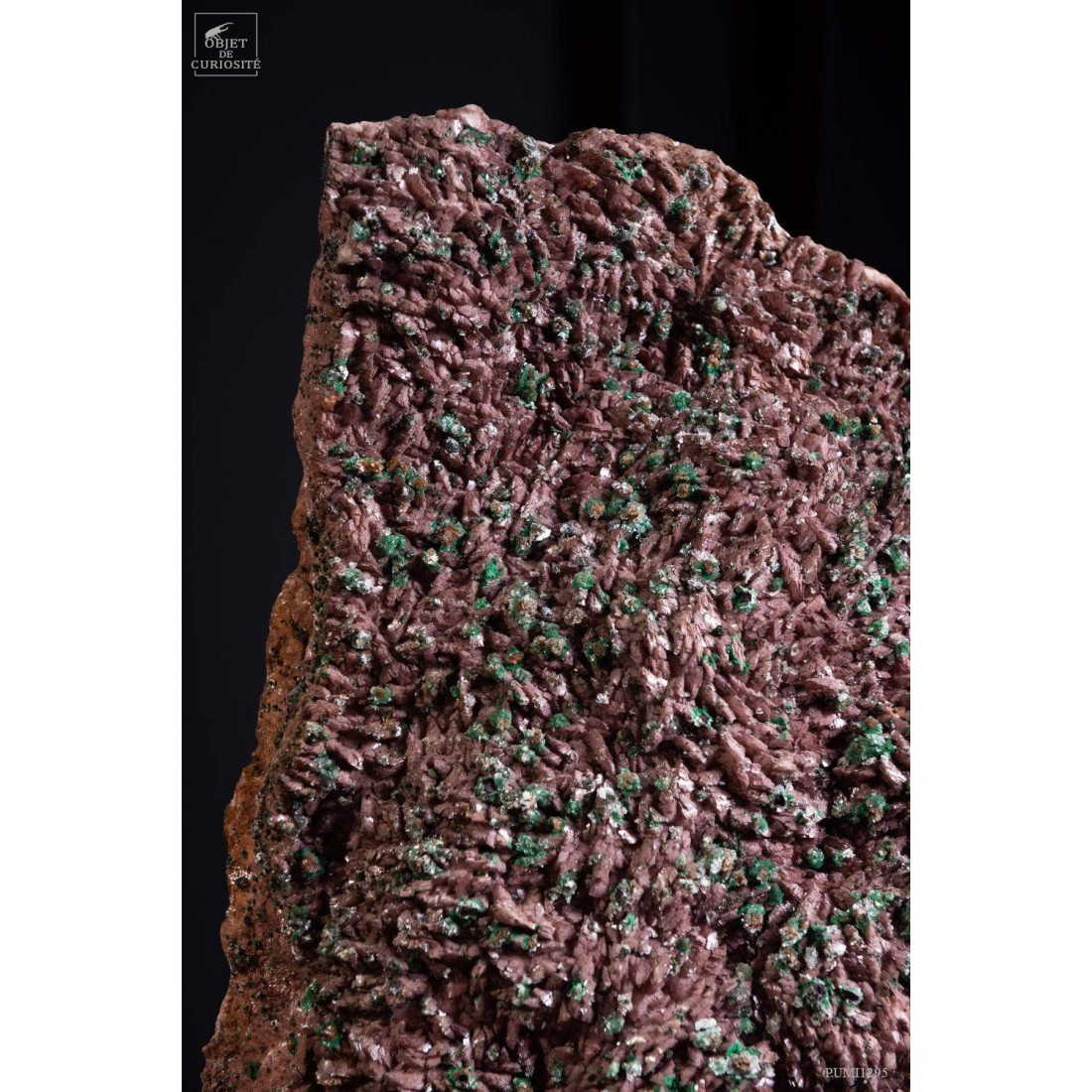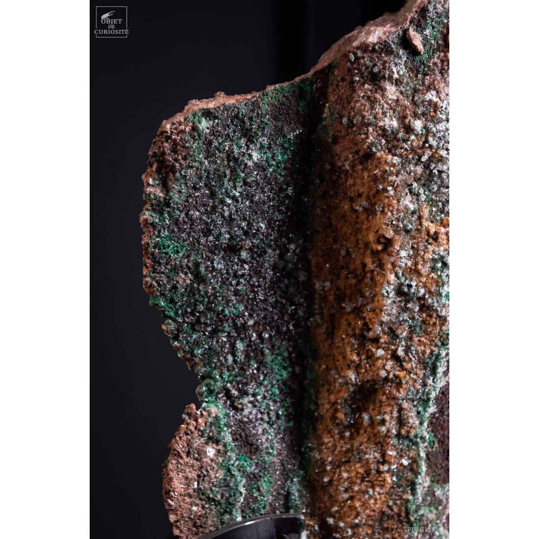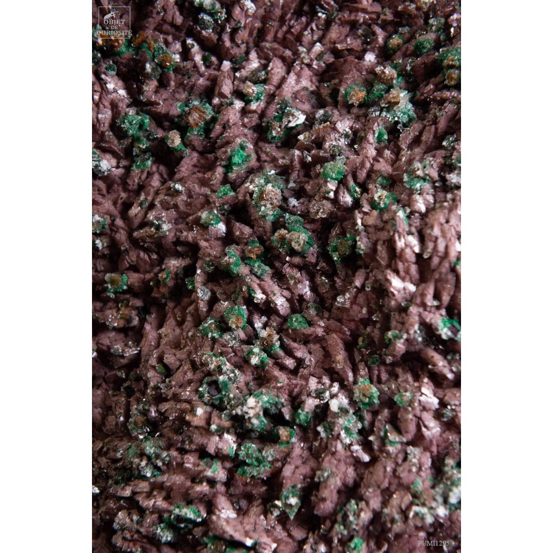 Ces petits cristaux verts ont un drôle de nom pour cette couleur: Rosasite! Ils se forment par oxidation à la périphérie des zones riches en zinc et cuivre. Cette impressionnante pièce vient de Bou Beker, à la frontière du Maroc et de l'Algérie. Ils ont poussé sur une cristallisation d'Ankerite. L'ankérite peut résulter de l'hydrothermalisme ou de la recristallisation métamorphique de roches sédimentaires riches en fer. L'ankérite n'est fréquente que dans les formations de fer d'âge Précambrien.