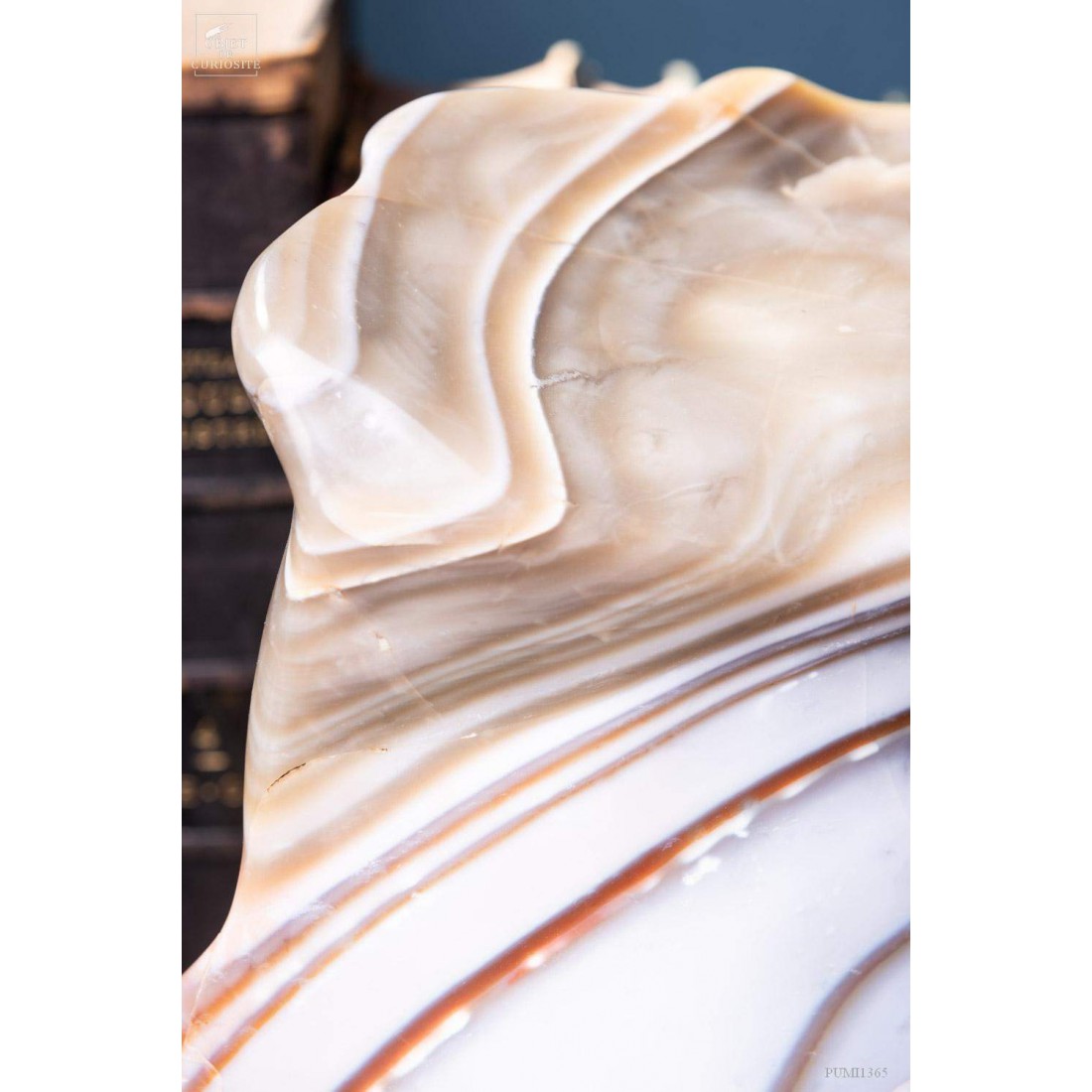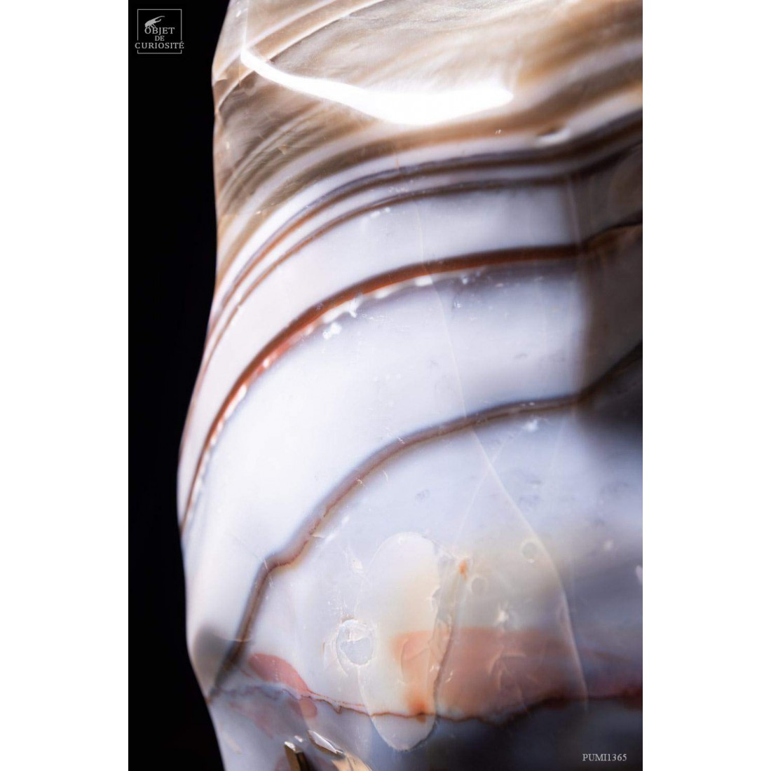 Jaspe zebré de Madagascar (11.4kg). Cet ensemble de rayures beiges et blanc-cassé est absolument naturel. Des nodules ont grossi côte à côte, alternant les couleurs selon les minéraux dissous dans l'eau, jusqu'à se percuter et s'interpénétrer. D'où l'harmonieux mélange de tons et de lignes.