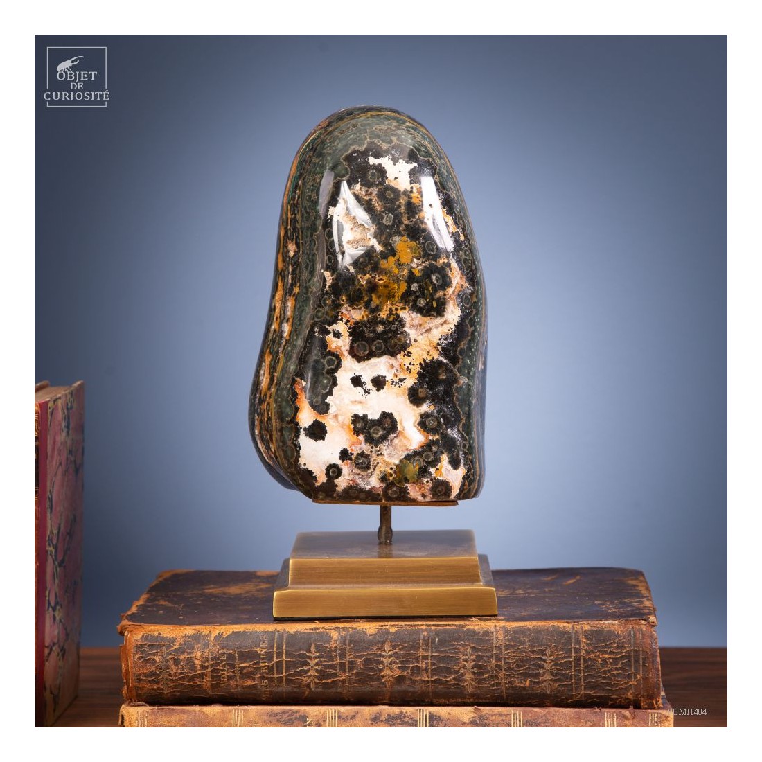 Le Jaspe orbiculaire est une variété de jaspe qui contient des inclusions sphériques de couleur variable . Dans la rhyolite hautement silicifiée (un minéral volcanique), le quartz et le feldspath cristallisent en sphères radiées de cristaux semblables à des aiguilles qui fournissent la base, l'origine, de la structure orbiculaire observée dans ce type de Jaspe. Ce minéral est spécialement attrayant lorsqu’il est poli et est utilisé comme pierre ornementale.