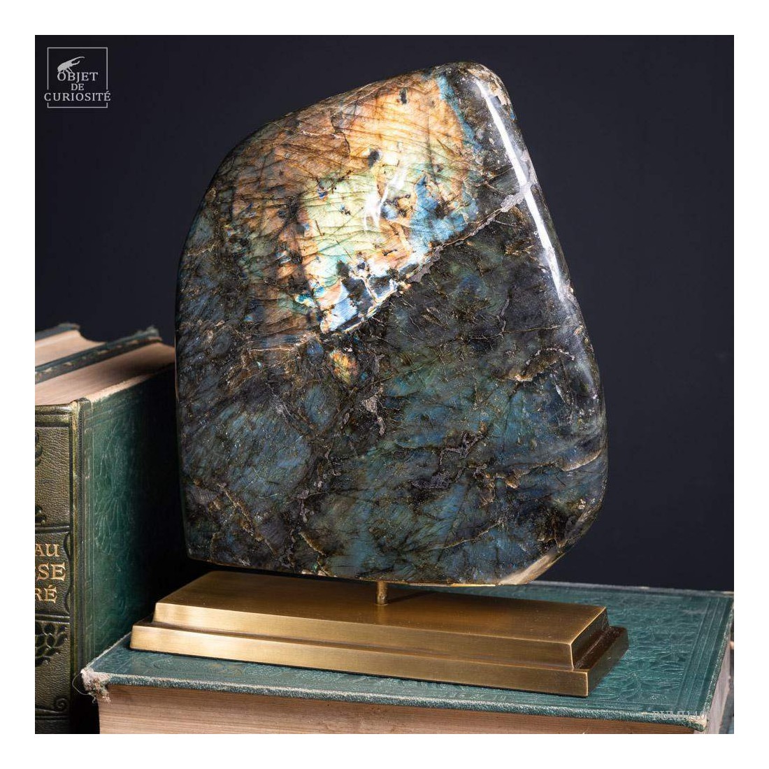 Ce très beau bloc de Madagascar présente un cristal aux reflets dorés sur la partie haute, et de très beaux cristaux bleus sur la partie basse. Les photos ne peuvent pas montrer les deux reflets en même temps, et ils se découvrent en se déplaçant devant ce minéral. Où que vous soyez dans la pièce, vous remarquerez cette Labradorite! Et qualité supplémentaire, ce minéral est souvent recherché pour ses vertus protectrices.