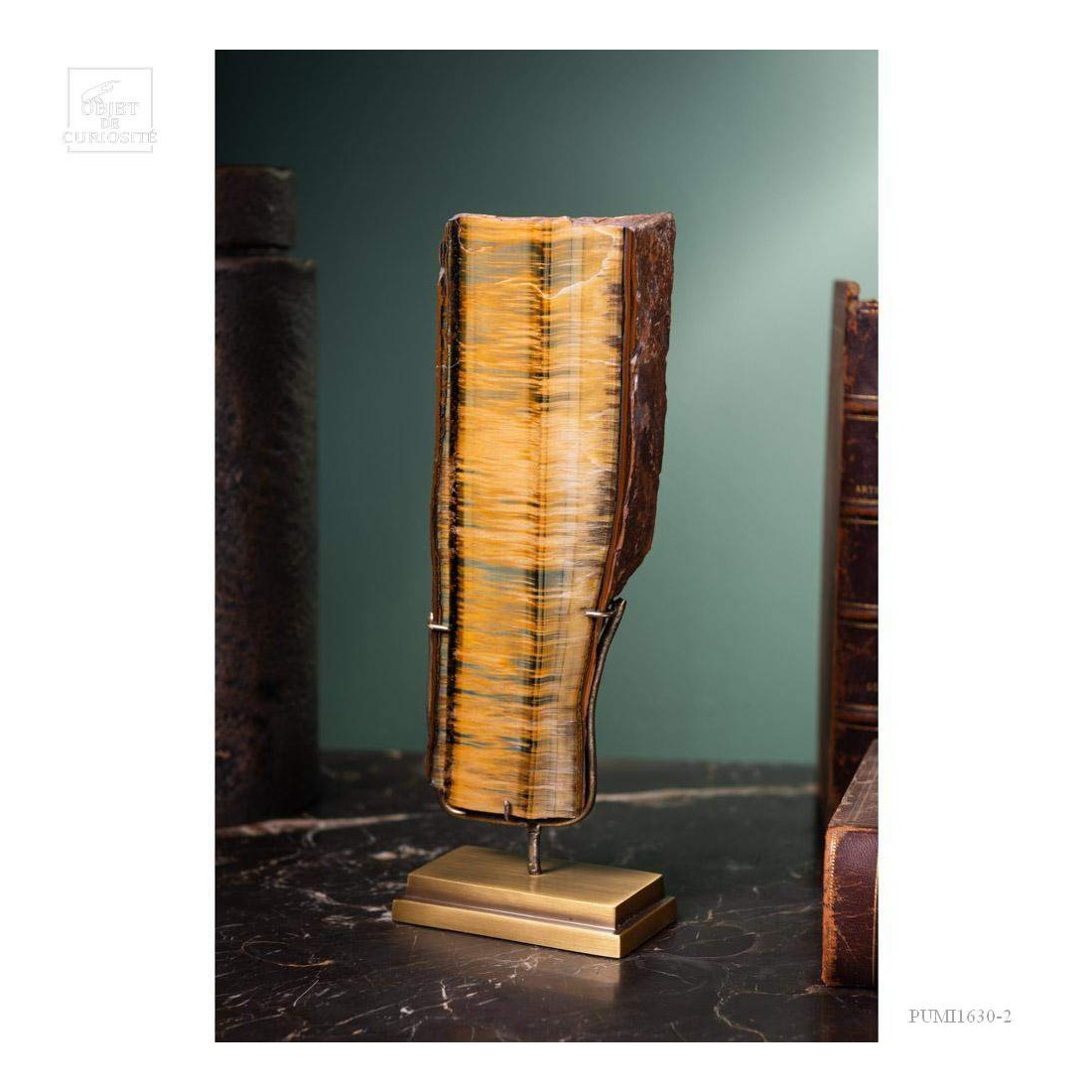 Oeil de Faucon poli sur une face. Cette pierre vient d'Afrique du Sud et a la caractéristique de réfléchir la lumière un peu comme un oeil de chat. Ceci est du à des fibres de Crocidolite (une variété d'amiante), mais dont les fibres ont été remplacées naturellement par de la Silice. Ce type de minéral est utilisé en bijouterie. Quand les fibres sont dans les tons de jaune plutât que bleu, on l'appelle Oeil de Tigre (MI076)