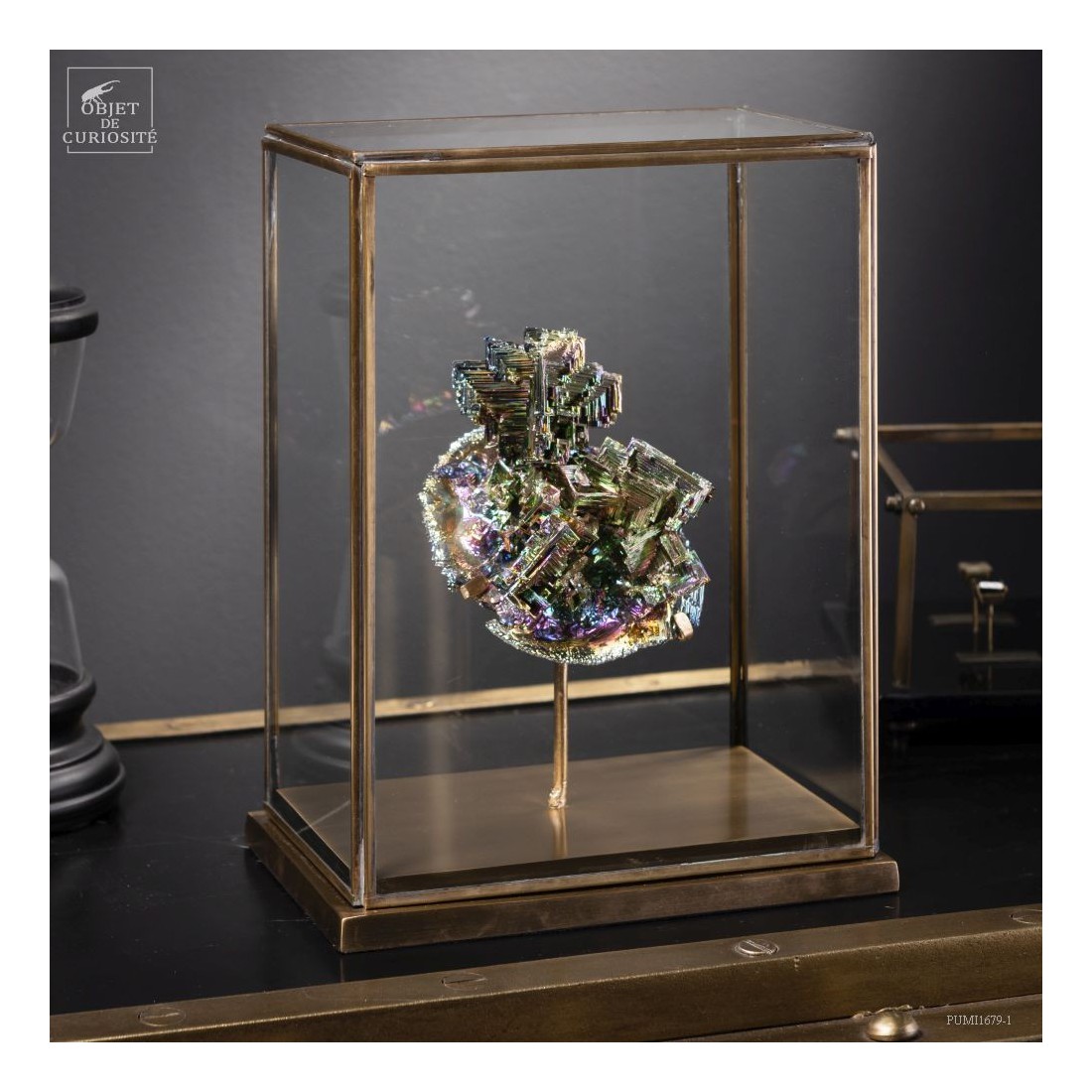 Cette présentation sous un globe en laiton donne envie de plonger dans cette construction obtenue par l'homme à partir d'un minerai naturel, mais pas assez concentré dans la nature pour voir de tels cristaux. Ce cristal de Bismuth est obtenu en chauffant à 270 degrés celcius du minerai de Bismuth, puis en le laissant refroidir doucement. Naturellement les cristaux prendront ces formes de cité Inca aux couleurs irisées. C'est la plus grande dimension que l'on puisse obtenir en une seule cristallisation.