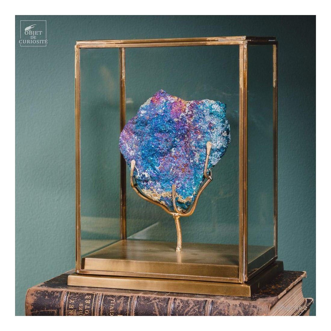 C'est un minéral d'origine hydrothermale, qui fait partie des sulfures de cuivre et qui est exploitée comme source de minerai de cuivre, particulièrement pour des alliages. Ce bloc massif provient du Mexique. Ses couleurs incroyables sont une oxydation de sa surface métallique, et elle s'est produite au cours de milliers d'années avec l'air et l'eau qui ont fini par pénétrer le minéral. Mais le résultat est magnifique!