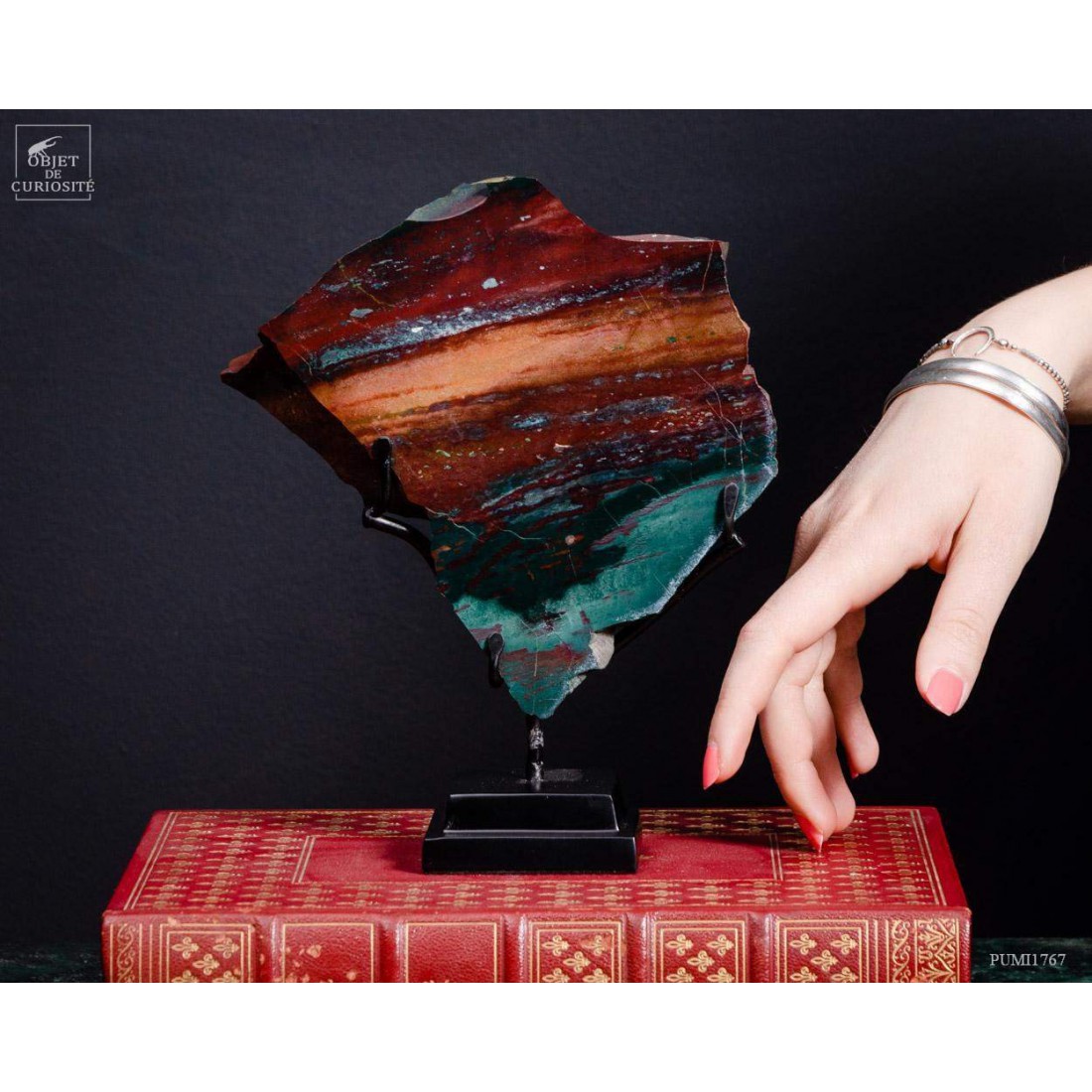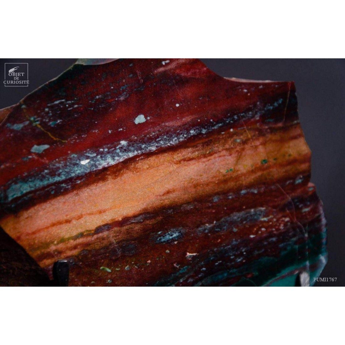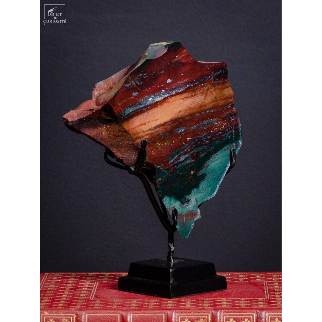 Cette pierre multicolore est unique et provient de la partie Ouest de Java, en Indonésie, dans une partie volcanique de Java en sommeil pour l'instant, mais avec des fumées qui s'échappent en permanence et de nombreuses sources chaudes. Surnommée "Akik Pancawarna Rubah", ce qui veut dire "Agate aux couleurs de renard". Cette forme de Calcédoine comprend normalement 5 couleurs, et elle est unique dans le monde. Ce mélange de couleurs fortes est habituellement utilisé pour faire des bijoux. Vous avez donc de quoi tailler au moins 30 cabochons...
