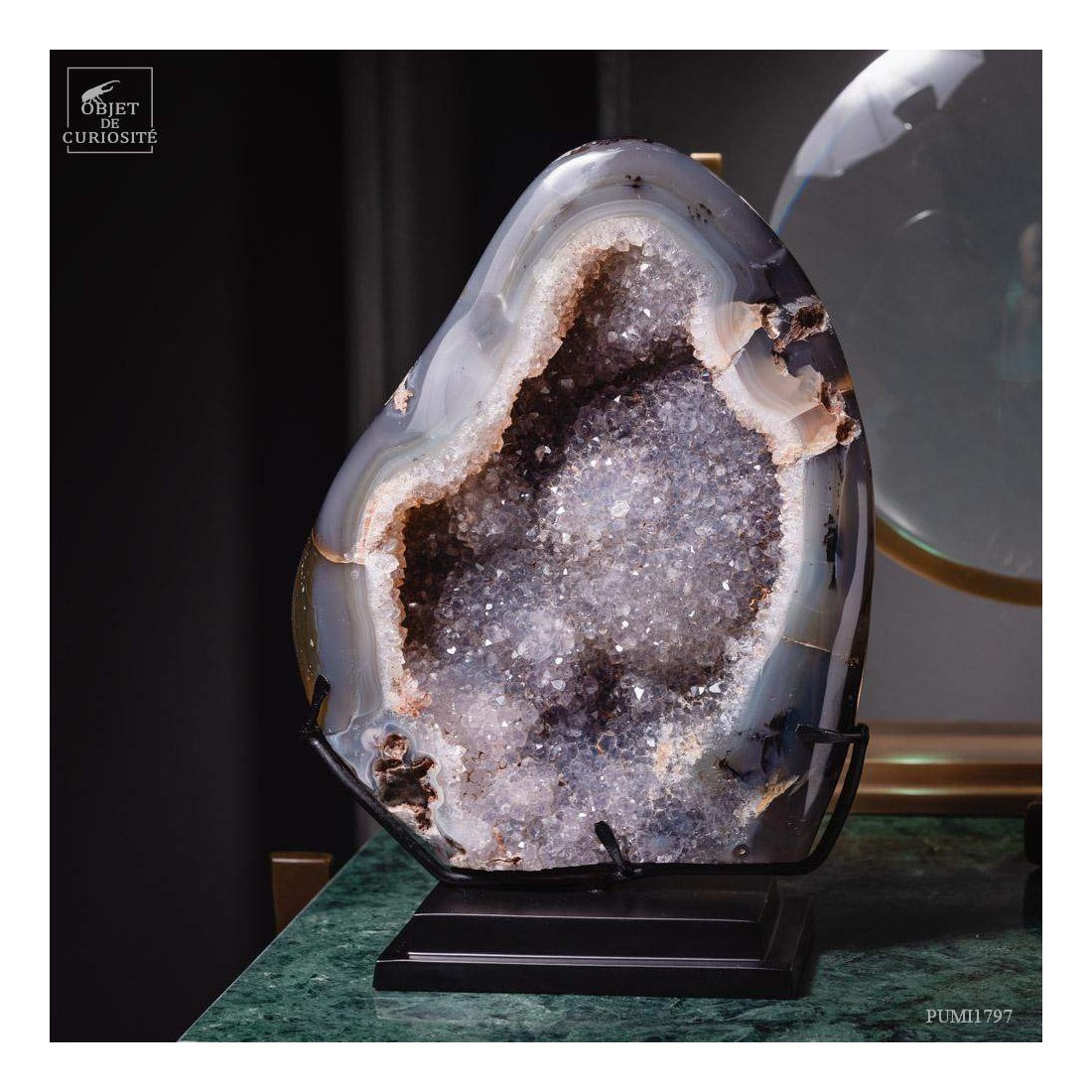 Géode ouverte d'Améthyste de Madagascar dans sa gangue d' Agate repolie. Cette géode a la couleur typique des Améthystes de la région de Antsohihy (Nord Ouest de Madagascar): un très léger parme.