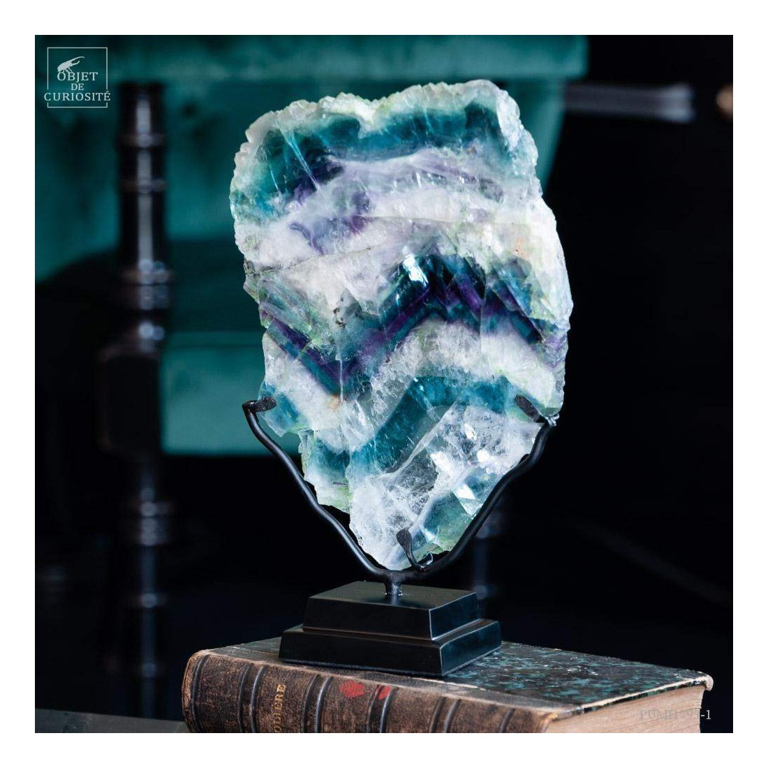 La Fluorite à bandes la plus célèbre au monde a été exploitée au 19ème siècle dans le Derbyshire en Angleterre: Blue John. Elle était récoltée pour sa valeur ornementale et les artisans arrivaient à creuser des saladiers et coupes que l'on trouve aujourd'hui dans les plus beaux châteaux Anglais. Mais une découverte récente a surclassé Blue John: La Fluorite Arc en Ciel de la mine Deqing fluorite, dans la province du Zhejiang en Chine. Cette pièce a des bandes parfaites de violet, vert, transparent... et très peu de pierres, y compris dans cette mine, ont un tel intérêt graphique.0.65Kg