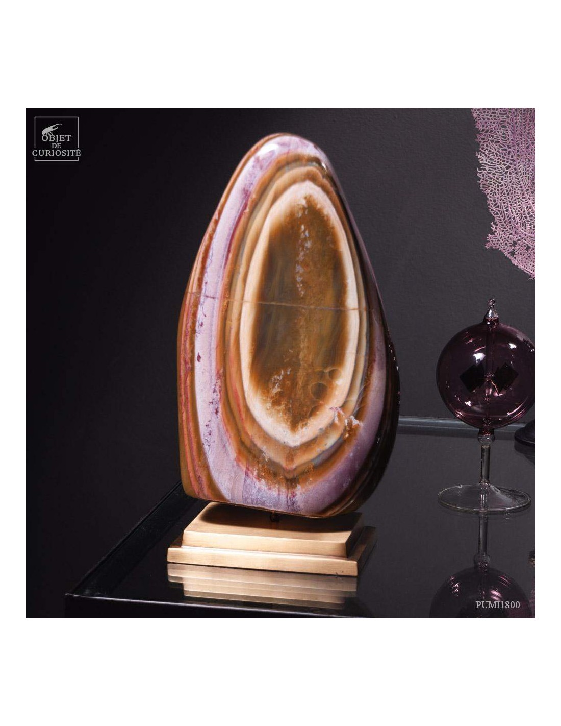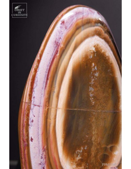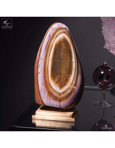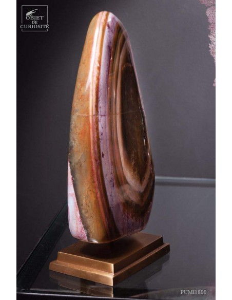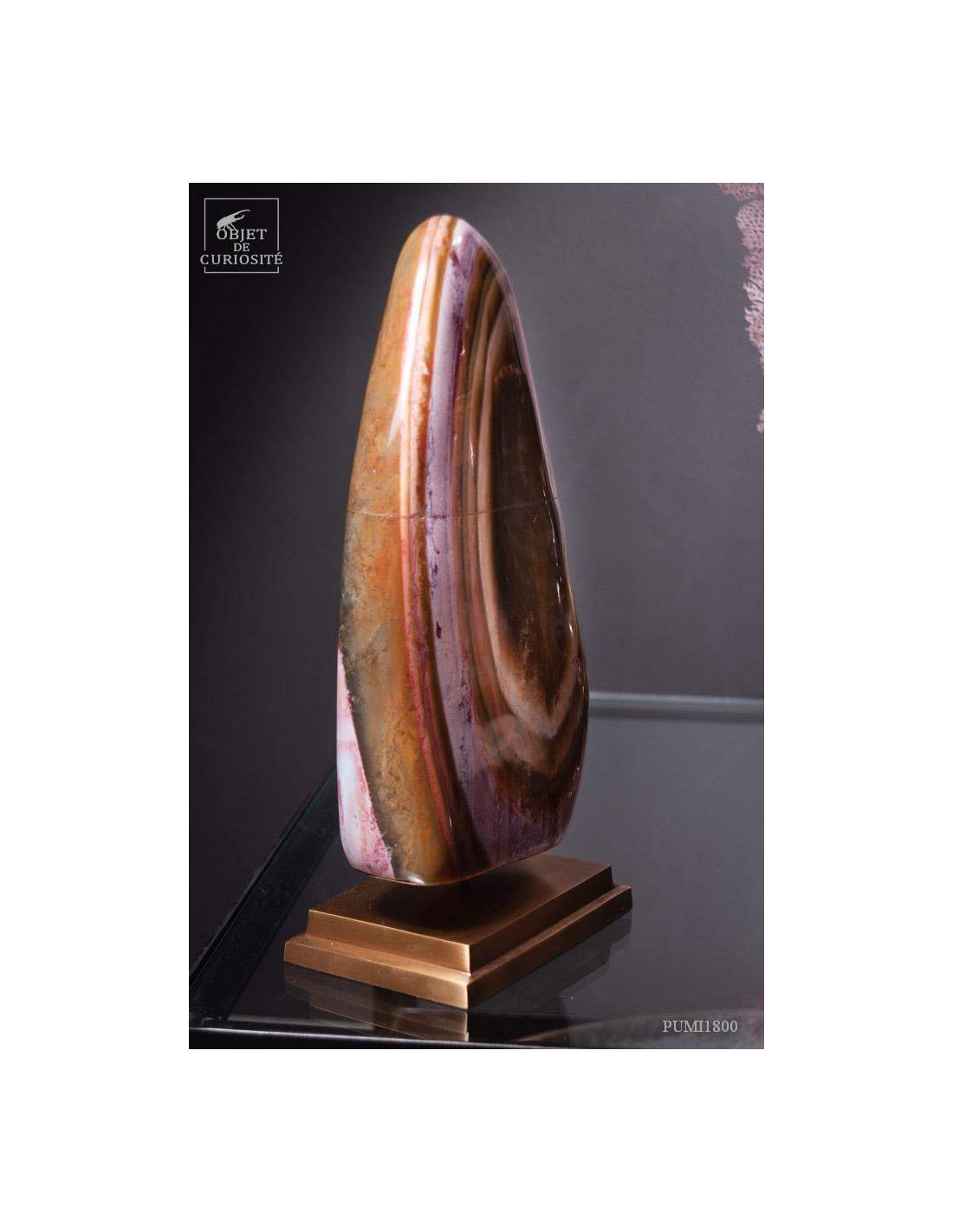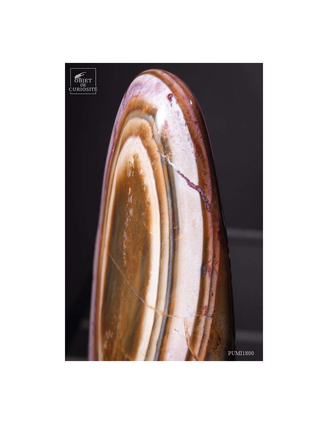 Ce minéral doux et sensuel est un Jaspe zebré de Madagascar. Depuis le temps que nous exploitons plusieurs filons à Madagascar, nous sommes toujours surpris de ce que la sédimentation, il y a 500 millions d'années, a pu produire...Ce minéral présente un ensemble de rayures très rares car il comprend du violet. C'est le résultat les des minéraux dissous dans l'eau. Et chaque mélange de couleurs est unique, il ne s'est peut-être produit qu'une fois, ou peut-être allons nous retrouver une veine de couleurs similaires. Mais jamais exactement semblable. C'est ce qui est beau. 4.2Kg