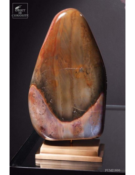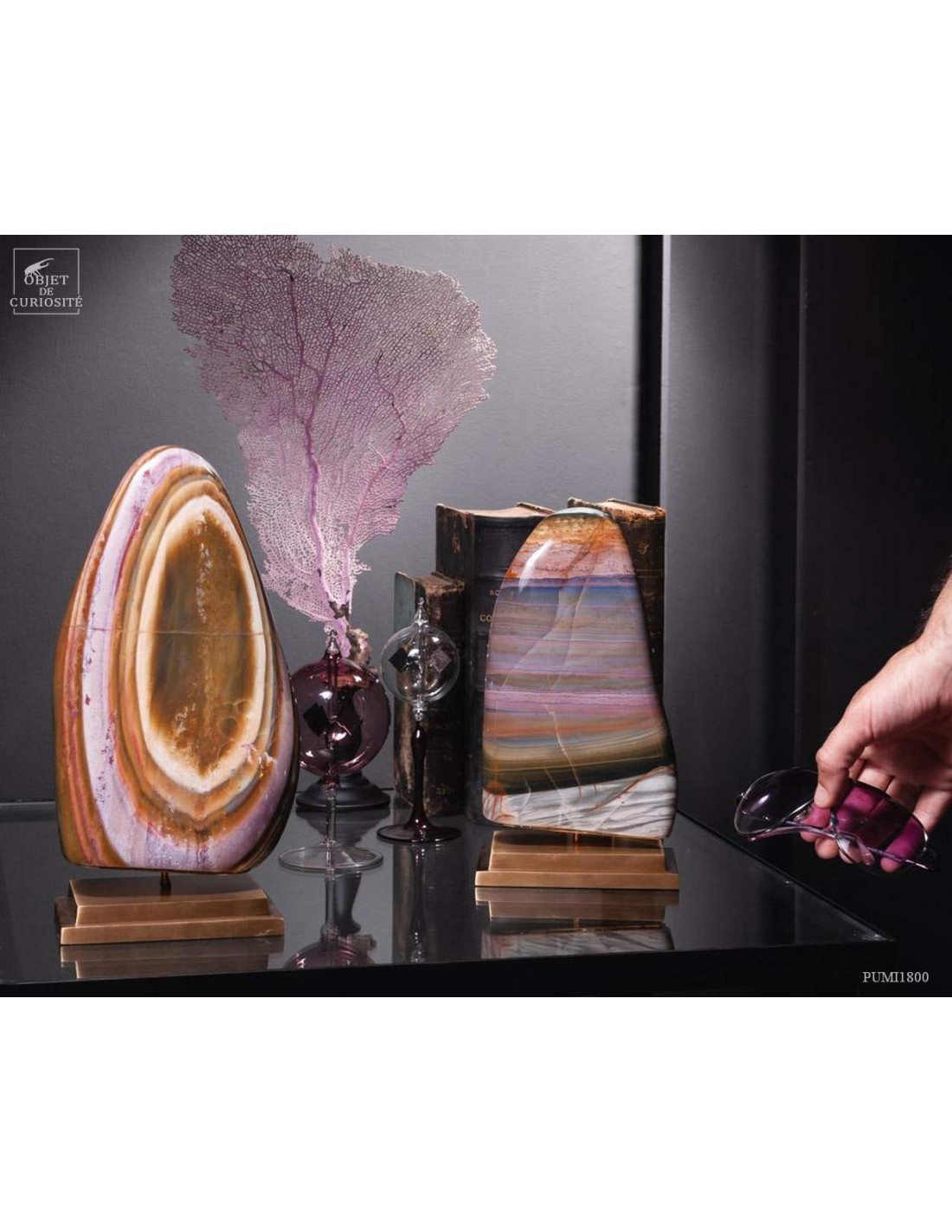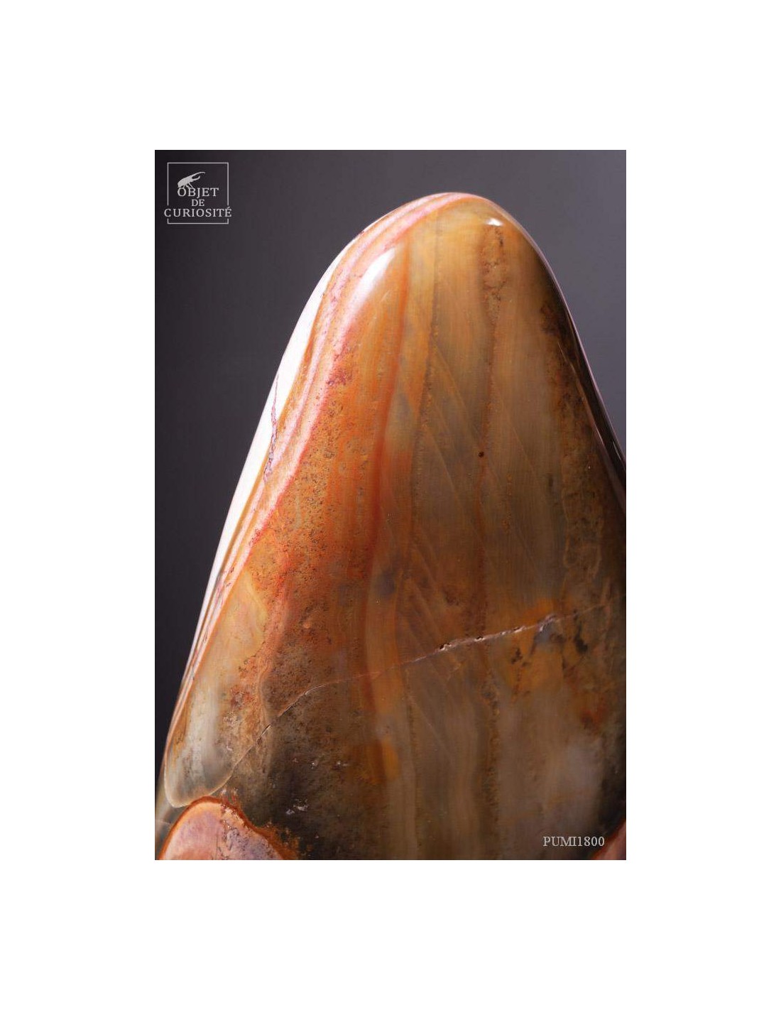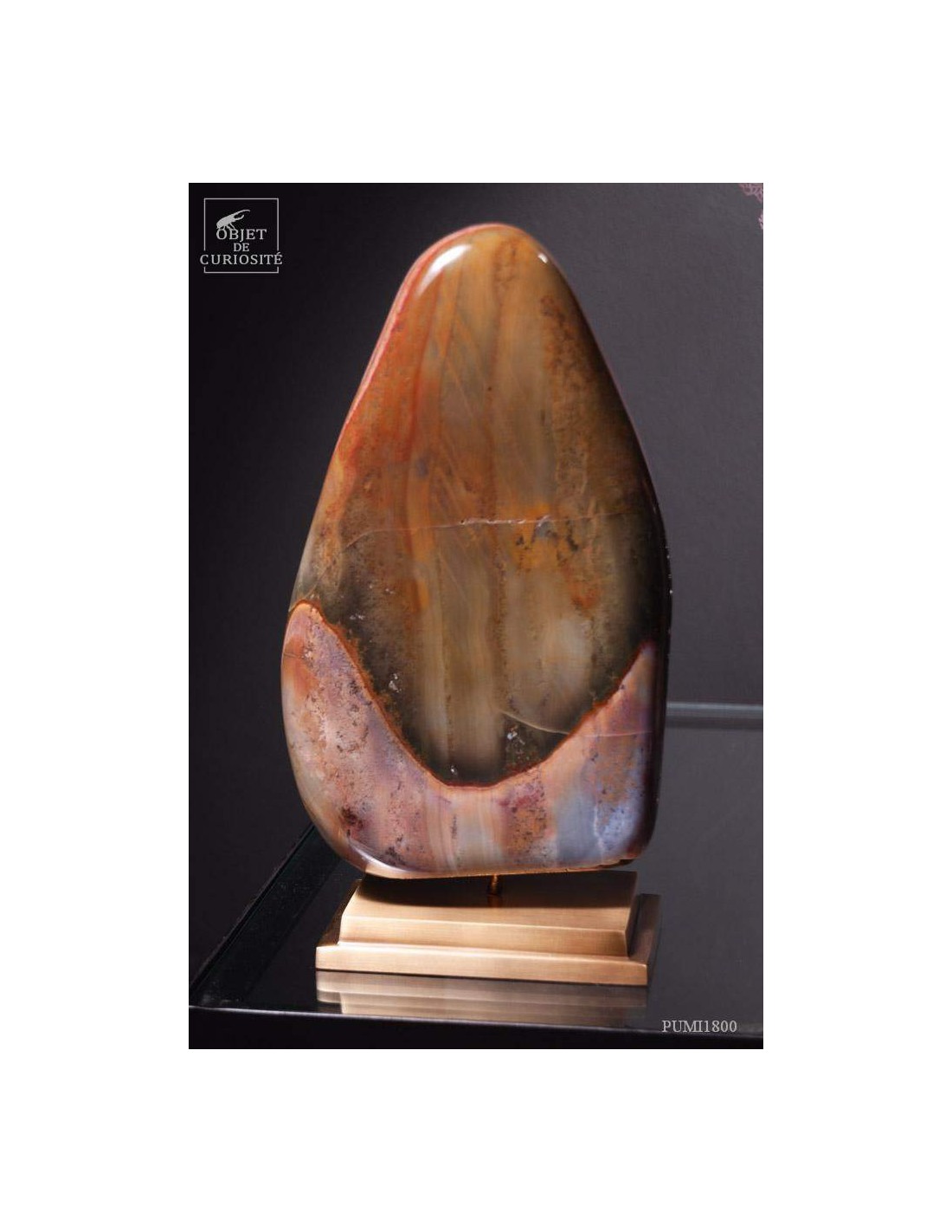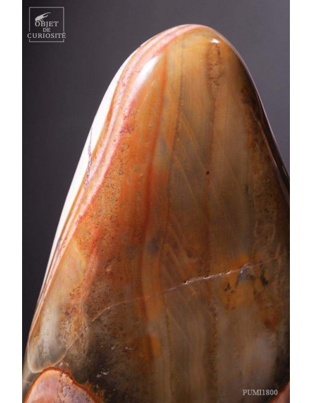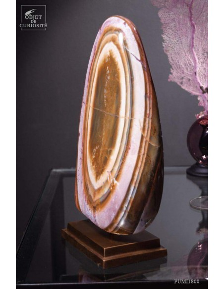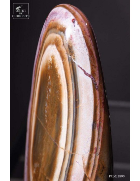 Ce minéral doux et sensuel est un Jaspe zebré de Madagascar. Depuis le temps que nous exploitons plusieurs filons à Madagascar, nous sommes toujours surpris de ce que la sédimentation, il y a 500 millions d'années, a pu produire...Ce minéral présente un ensemble de rayures très rares car il comprend du violet. C'est le résultat les des minéraux dissous dans l'eau. Et chaque mélange de couleurs est unique, il ne s'est peut-être produit qu'une fois, ou peut-être allons nous retrouver une veine de couleurs similaires. Mais jamais exactement semblable. C'est ce qui est beau. 4.2Kg