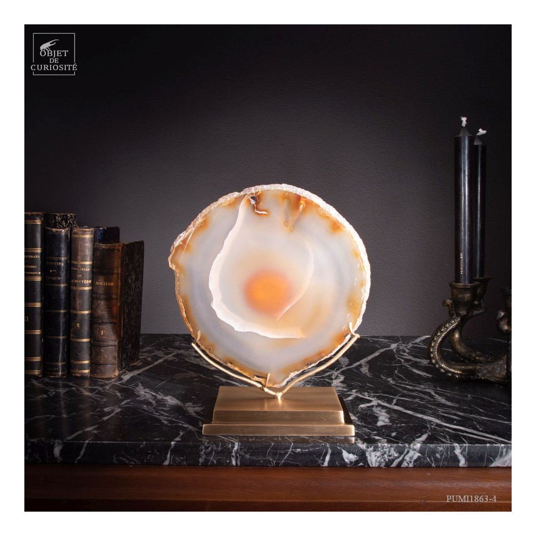 Agate dorée du brésil, grande taille. Taillée en fine tranche, elle devient translucide et laisse passer la lumière. C'est d'ailleurs assez remarquable sur la 3ème photo: imaginez cet effet si elles se trouvait devant une fenêtre ou une autre source lumineuse...