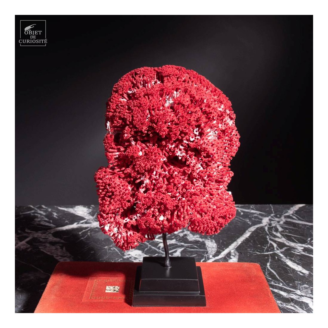 Cette belle couleur rouge est naturelle. Mais sous l'eau vous ne verrez qu'un tapis de fleurs blanches: ce sont les polypes, petits animaux, qui habitent chacun des tuyaux de cette fine architecture. Il est étonnant que seul le squelette ait cette magnifique couleur. Ce corail vous sera livré avec son numéro de Cites, puisqu'il s'agit d'une espèce à commerce réglementé. Unique.