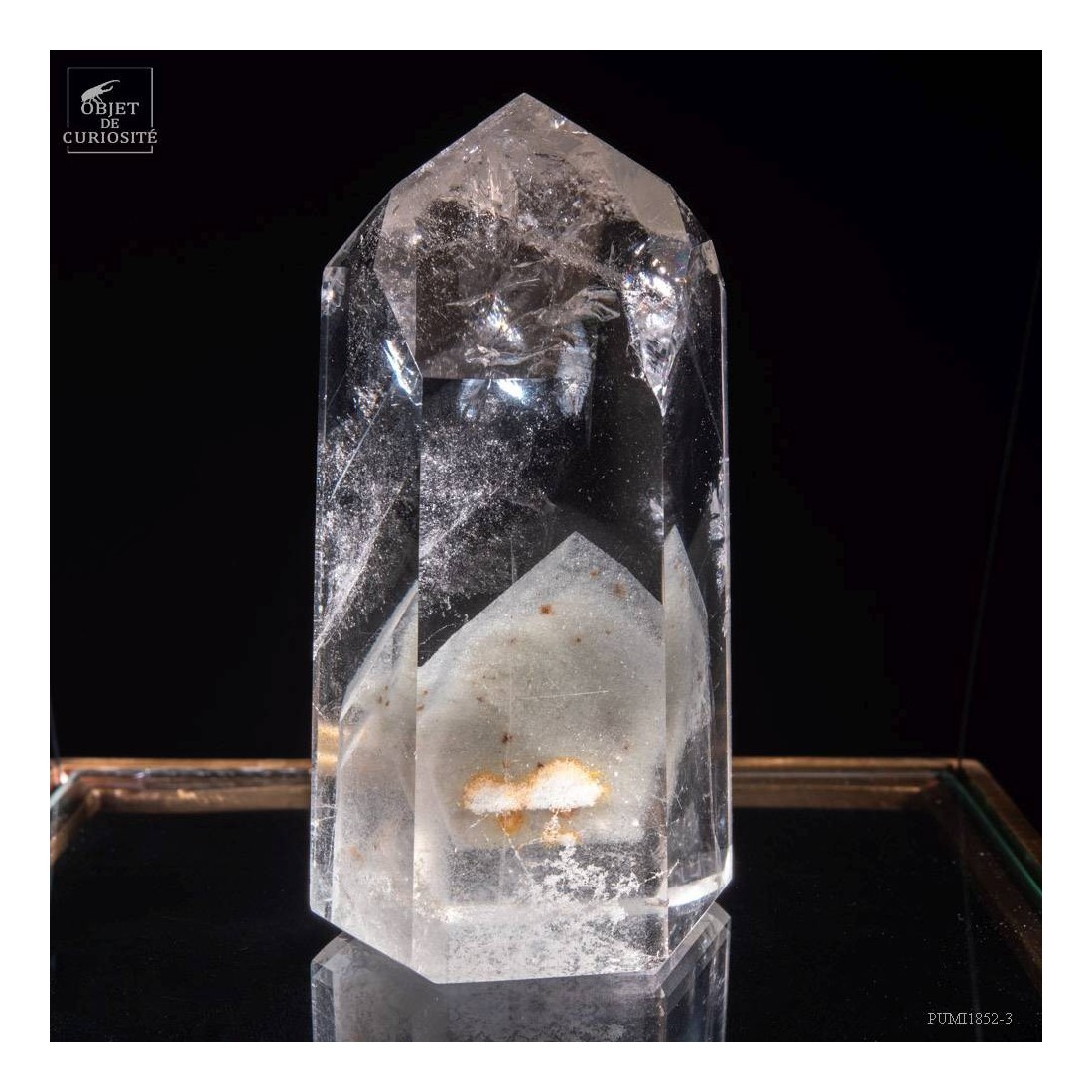 Cette cage de métal noir avec couvercle de laiton est la façon la plus épurée de mettre en valeur cette curiosité: un cristal qui a existé il y a plusieurs millions d'années, puis qui a disparu, absorbé par un magnifique cristal de roche ultra transparent. Ce fantôme de cristal est en fait le cristal qui a commencé sa croissance, s'est ensuite arrêté, et une fine cristallisation de Chlorite verte s'est déposée sur sa pointe. Plus tard, de l'eau a à nouveau envahie cette chambre, et le cristal a repris sa croissance. Le résultat est magnifiquement mis en évidence sous cet éclairage délicat.