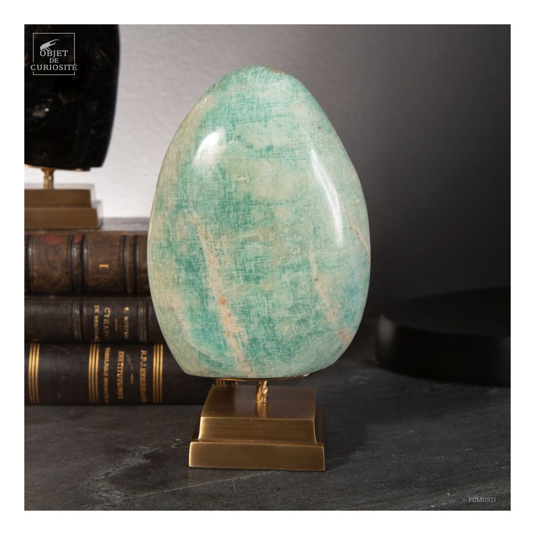 Pierre ornementale de couleur verte, bleu-vert translucide, presque la couleur d'une plage sur l'océan Atlantique. Cette couleur est susceptible d'être donnée par de petites quantités de plomb et d'eau particulièrement pour les feldspaths. Présentation sur une base en laiton pour cette pierre originaire de Madagascar. Pour voir arriver des vagues sur une plage imaginaire, encore et encore...