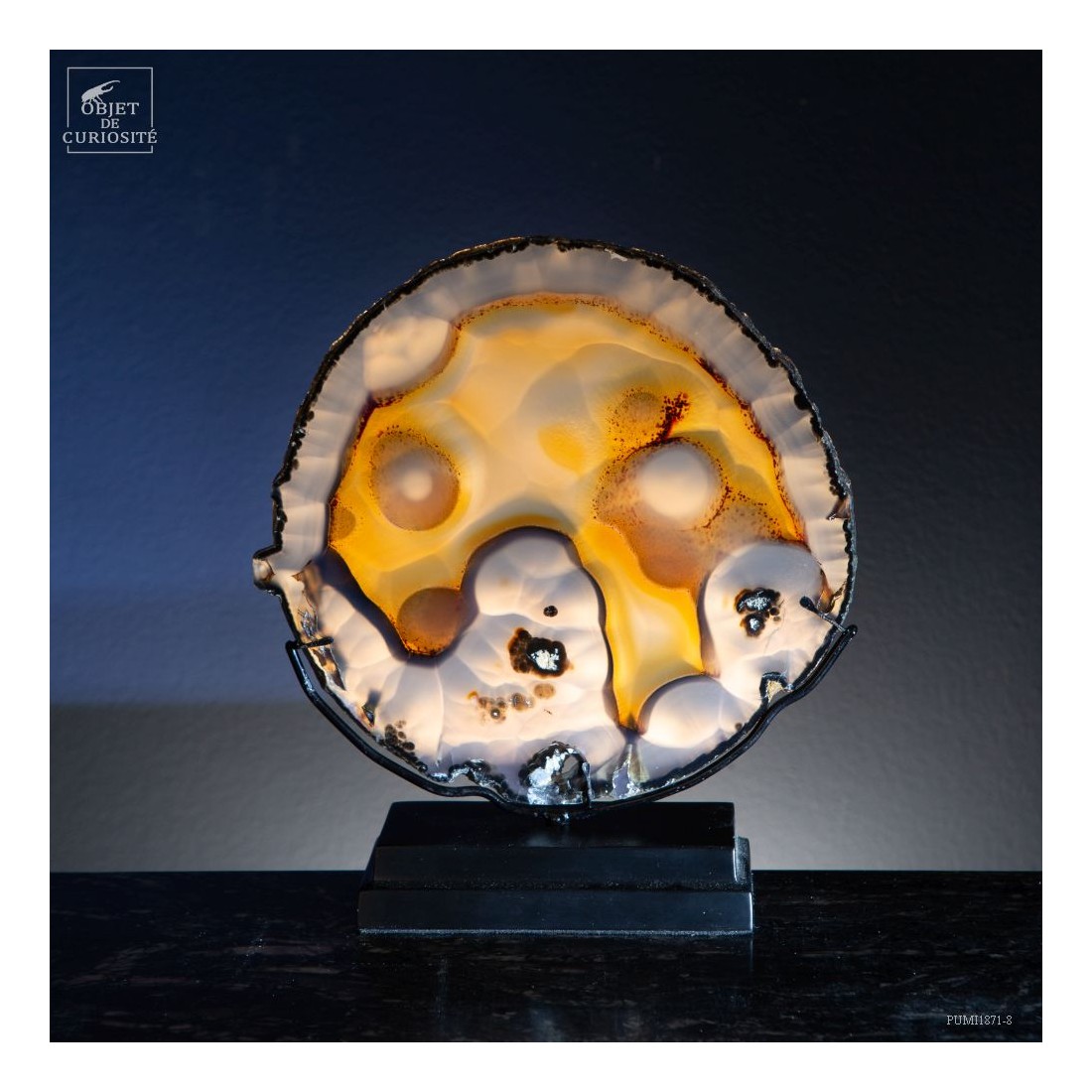 Agate noire du Brésil. Taillée en fine tranche, elle devient translucide et laisse passer la lumière.