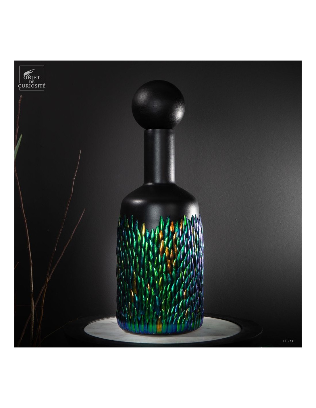 Une curieuse matière faite d'élytres (carapaces) d'insectes-bijoux de Thaïlande - Sternoceras Aequisignata- Iincroyables couleurs iridescentes allant du bleu au vert de ces scarabées de la famille des Buprestes. Ils passent leur vie larvaire ( 2 ans) dans les troncs d'arbre, et leur vie d'adultes est courte (3 semaines). Ils sont donc concentrés sur une reproduction rapide. C'est pourquoi les prélèvements des collectionneurs n'ont pas d'impact significatif, pour l'instant.