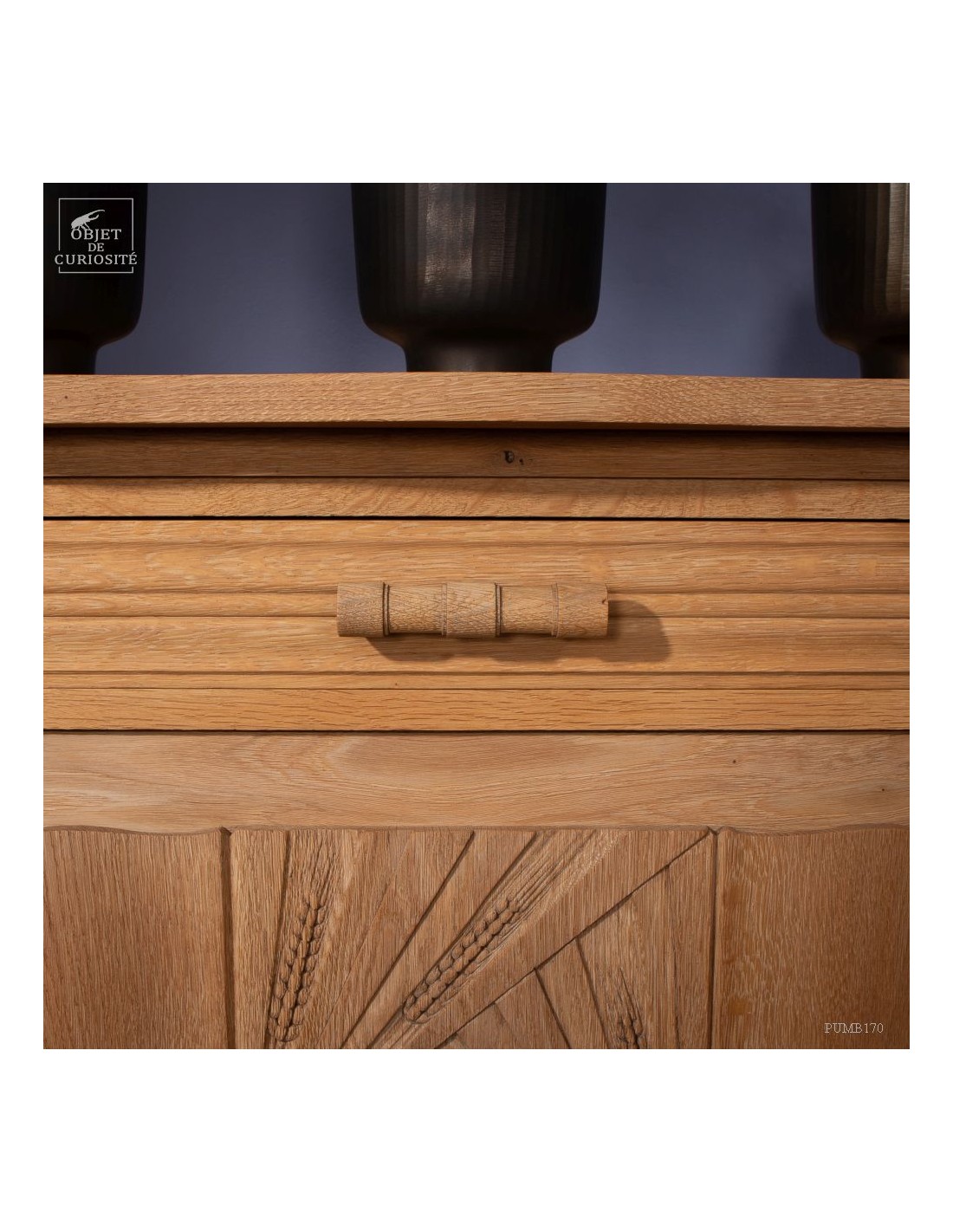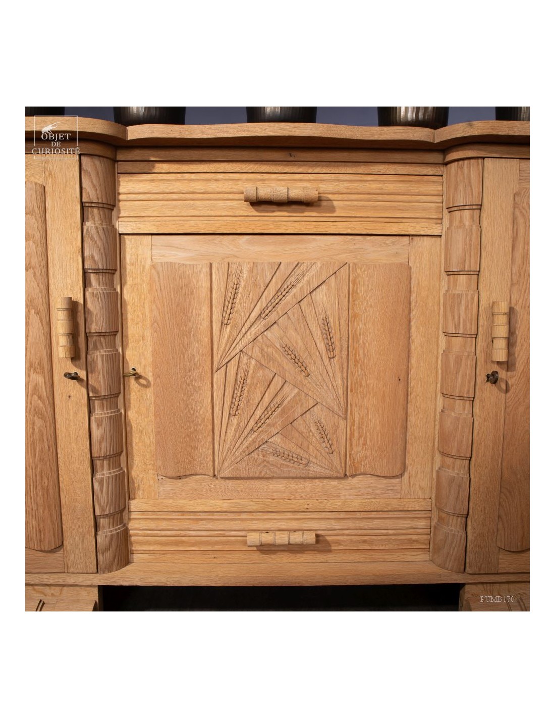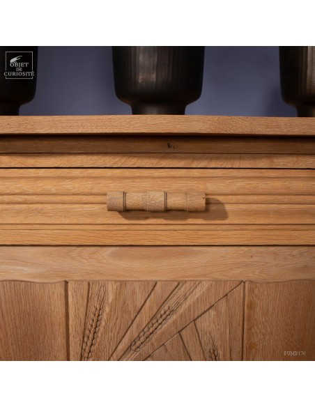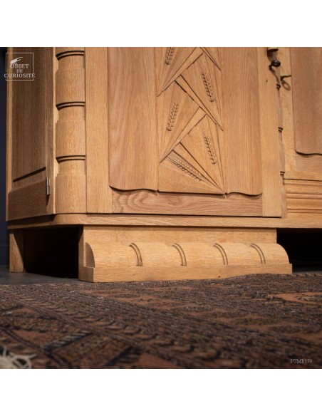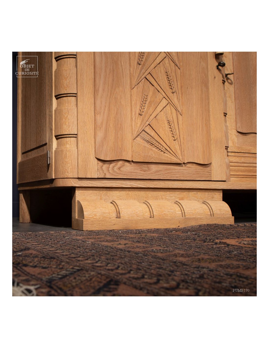 L'essence même des années 30/40 dans le design imprégné des symboles géométriques de cette enfilade de 220cm de long. La ligne puissante est inspirée de l'architecture en vogue à l'époque, comme le fameux palais de la porte dorée à Paris. La symbolique de fertilité et de productivité des gerbes de blé sculptées sur les 3 portes est magnifiquement mise en valeur par la nouvelle finition que nous venons de lui donner: un vernis mat qui préserve la couleur naturelle du chêne français.