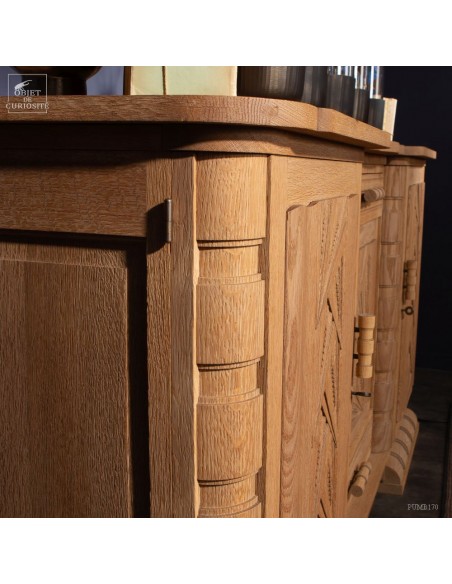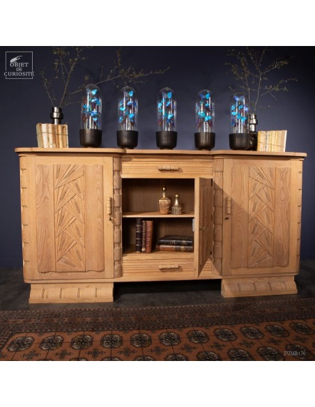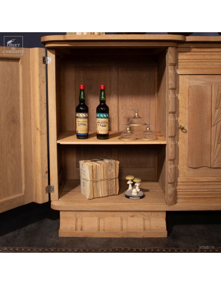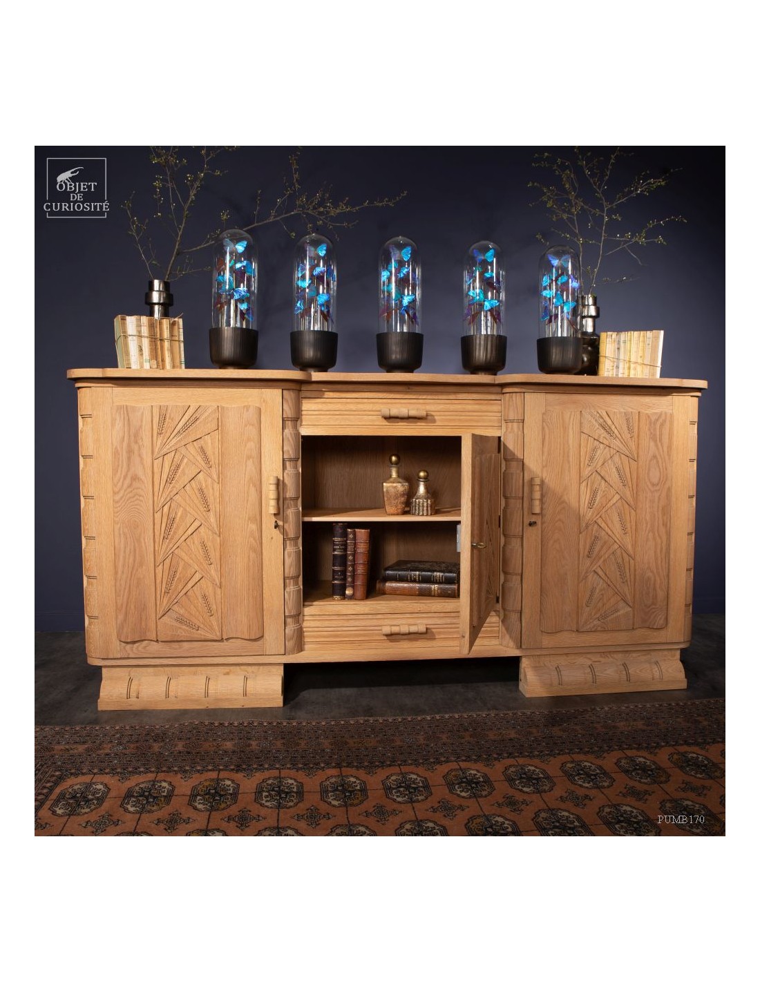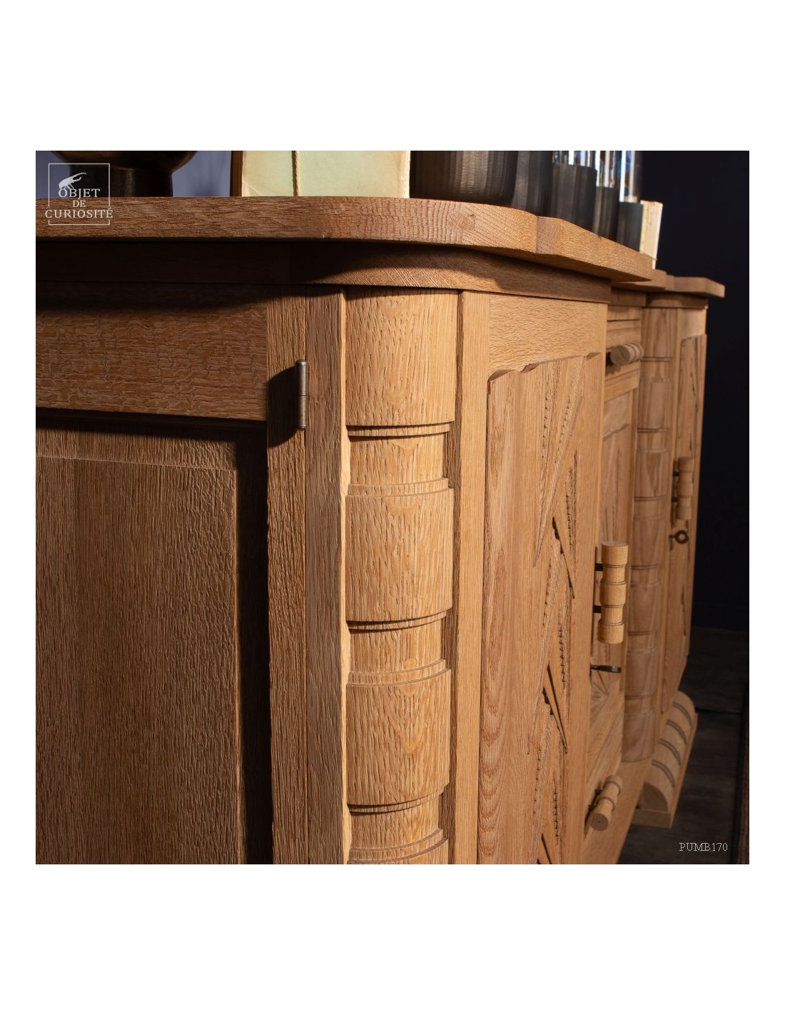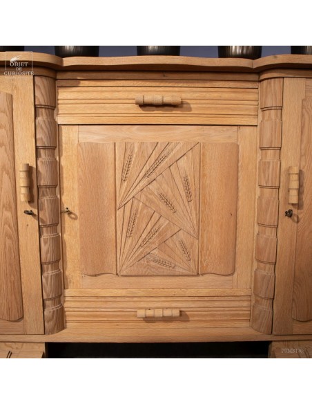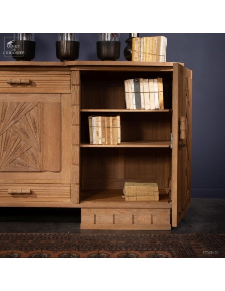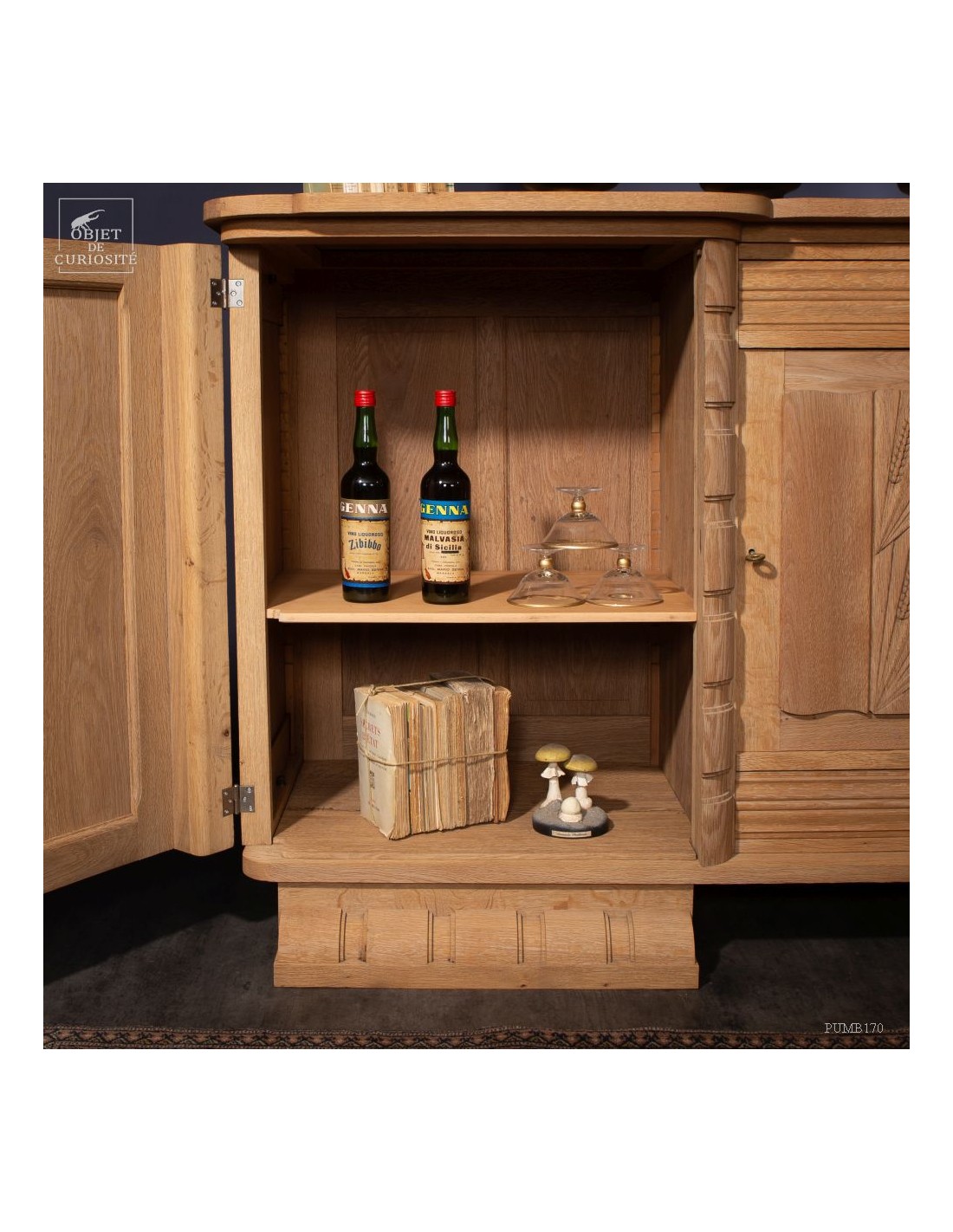 L'essence même des années 30/40 dans le design imprégné des symboles géométriques de cette enfilade de 220cm de long. La ligne puissante est inspirée de l'architecture en vogue à l'époque, comme le fameux palais de la porte dorée à Paris. La symbolique de fertilité et de productivité des gerbes de blé sculptées sur les 3 portes est magnifiquement mise en valeur par la nouvelle finition que nous venons de lui donner: un vernis mat qui préserve la couleur naturelle du chêne français.