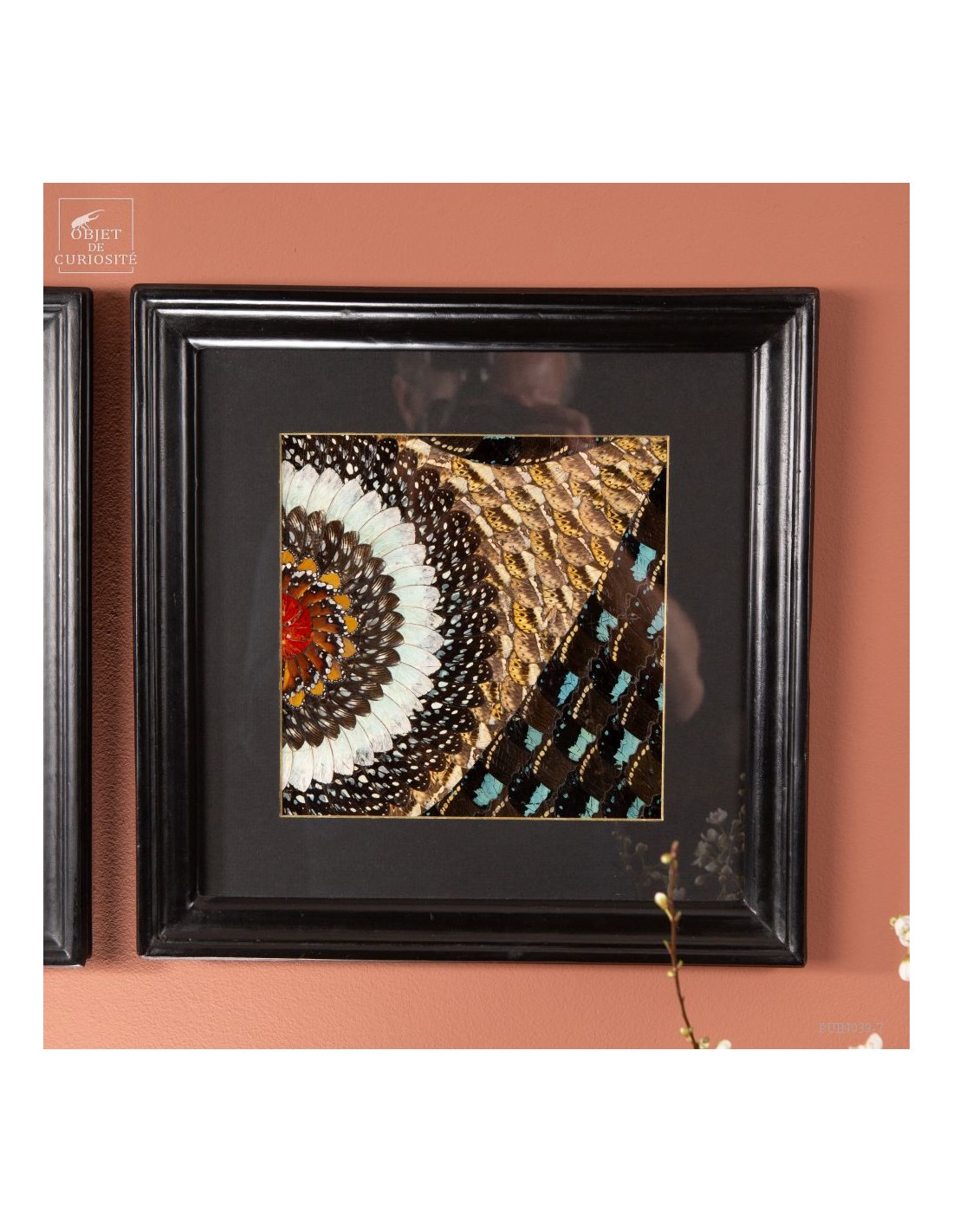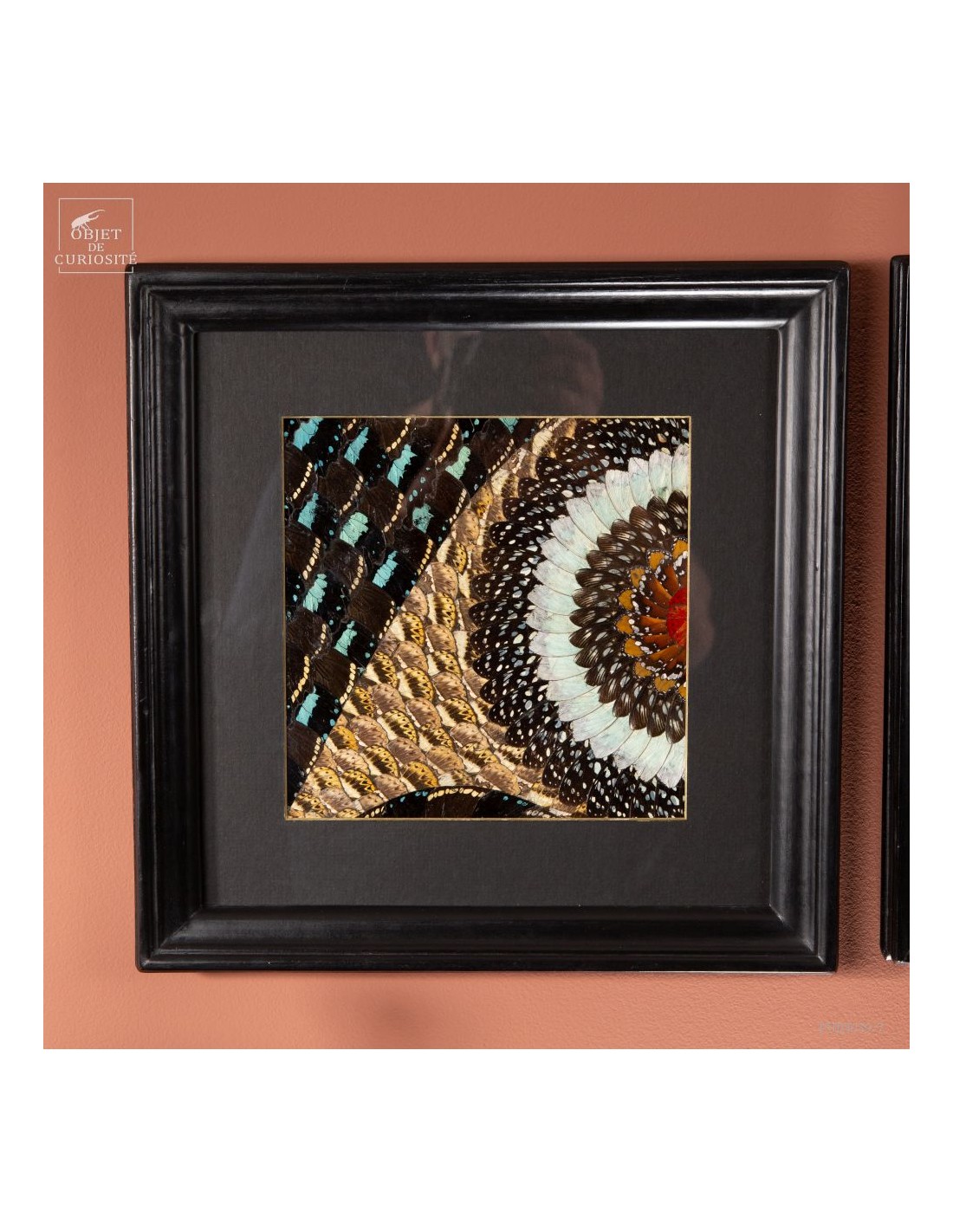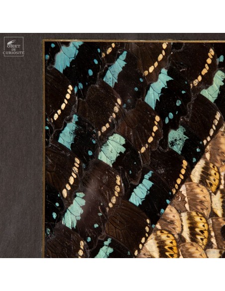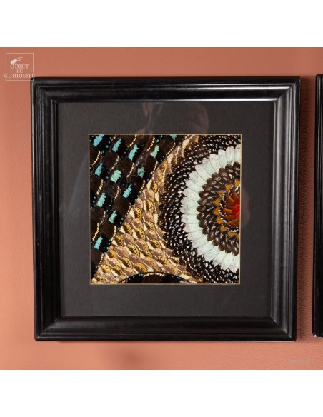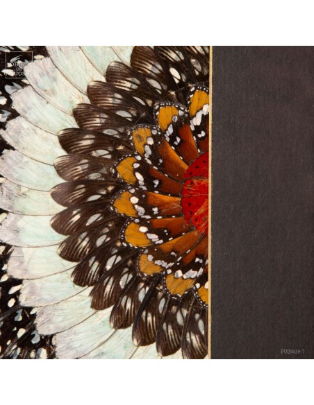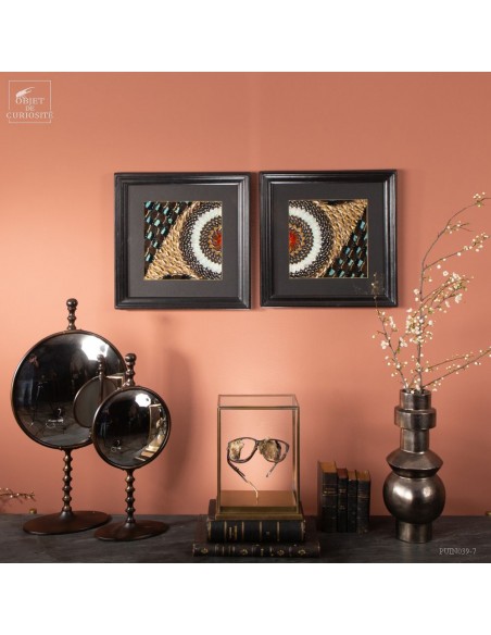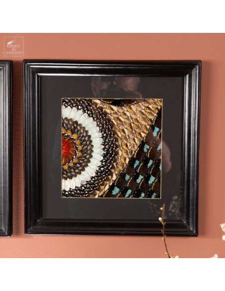 Deux tableaux composés uniquement d'ailes de papillons de Tanzanie. Une paire symétrique, mais inverse, qui peut être accrochée dans 2 sens. Le cadre est en Manguier massif. L'ensemble est unique.