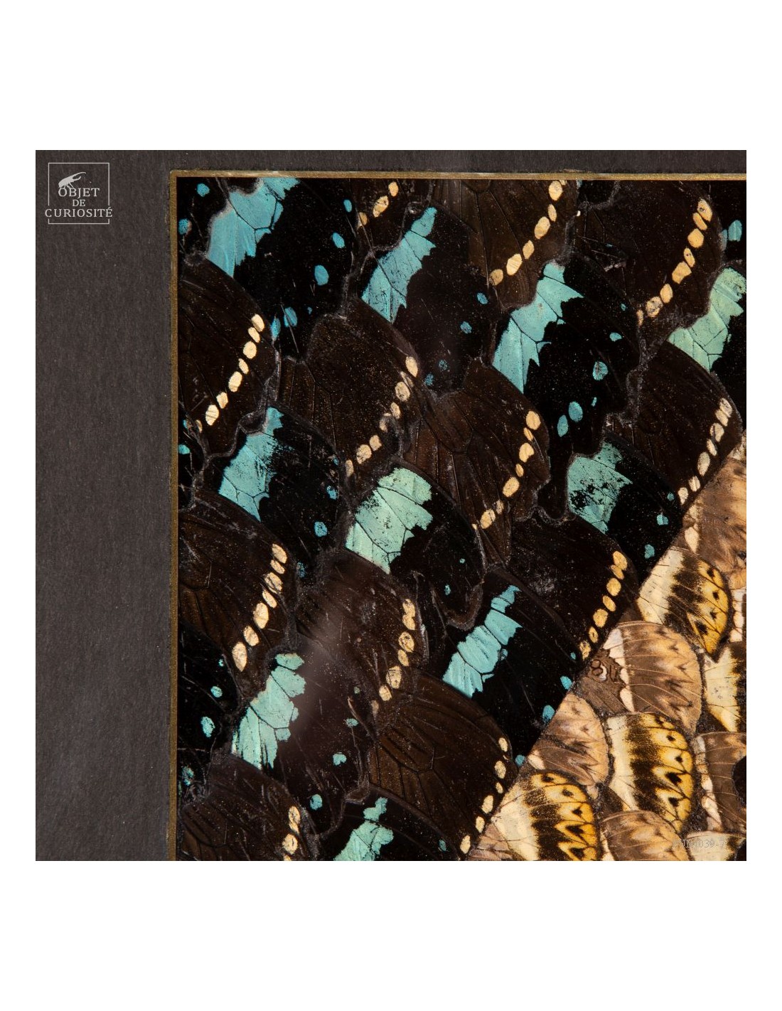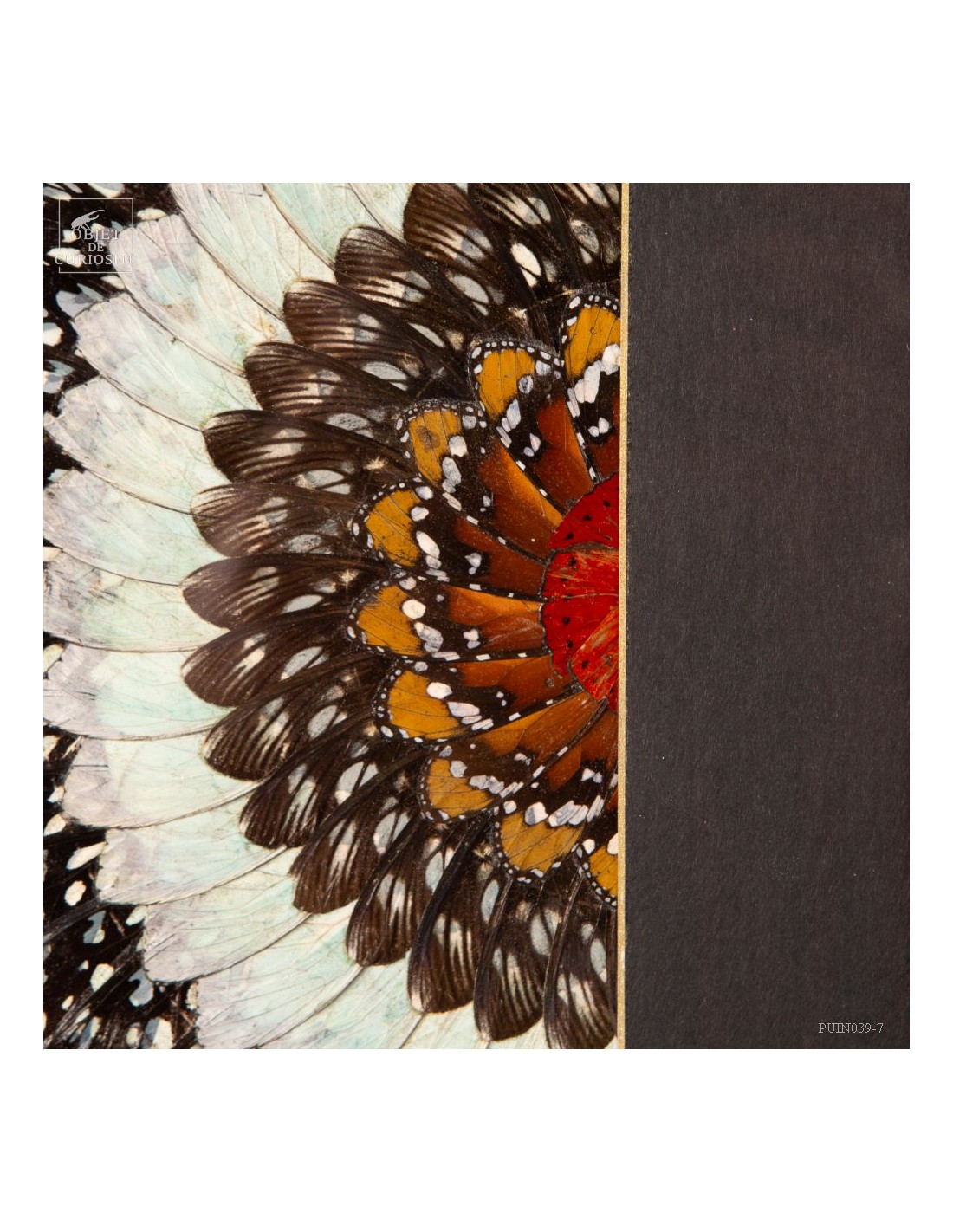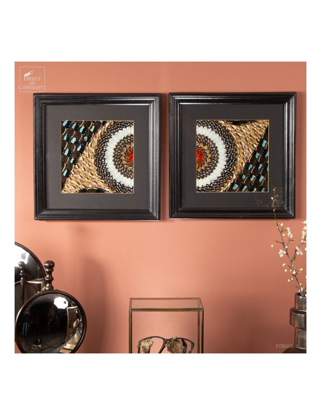 Deux tableaux composés uniquement d'ailes de papillons de Tanzanie. Une paire symétrique, mais inverse, qui peut être accrochée dans 2 sens. Le cadre est en Manguier massif. L'ensemble est unique.