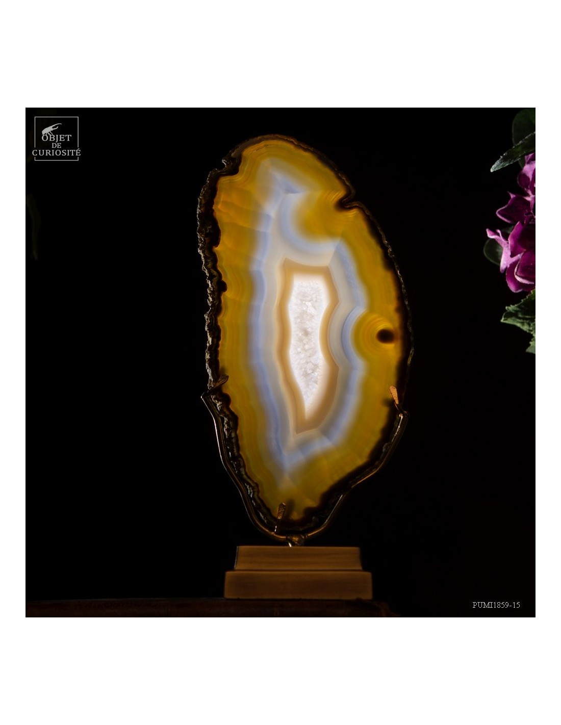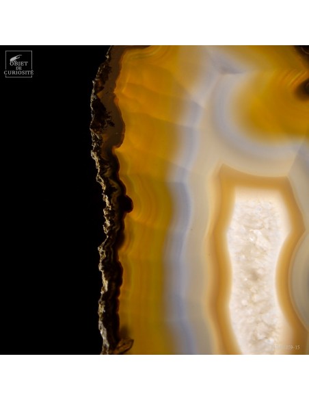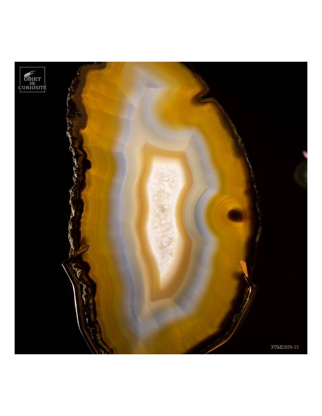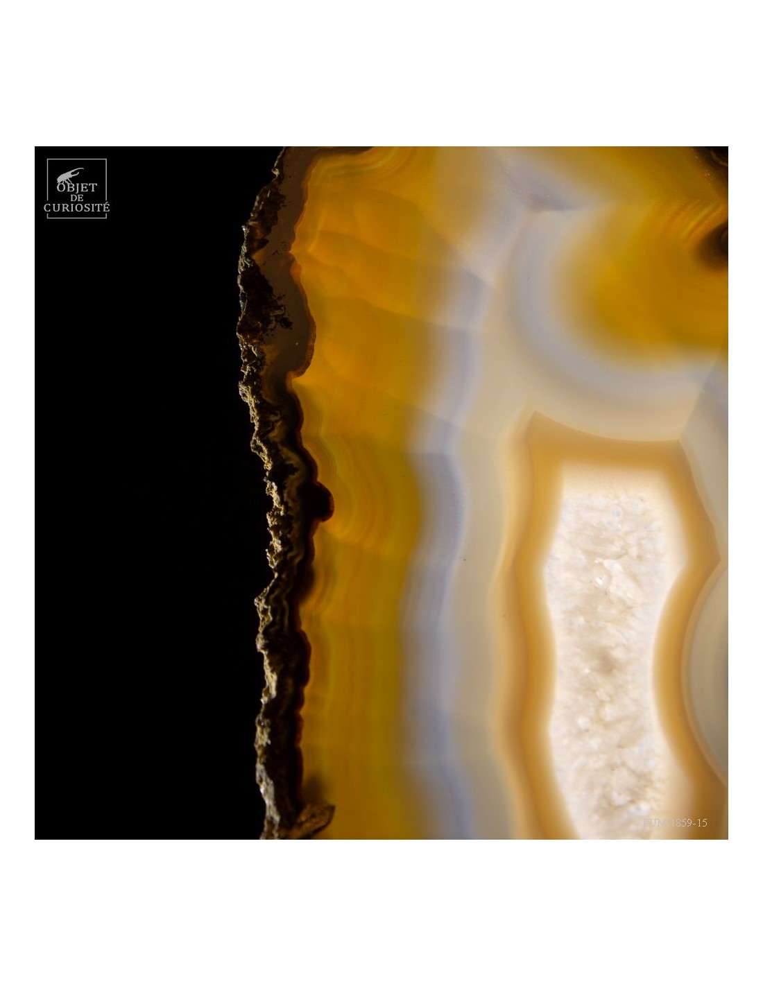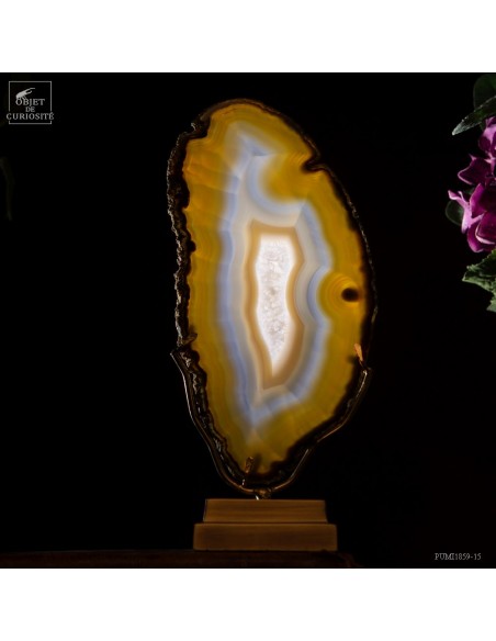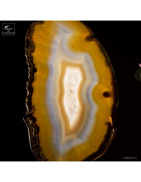 Agate du Brésil. Taillée en fine tranche, elle devient translucide et laisse passer la lumière.