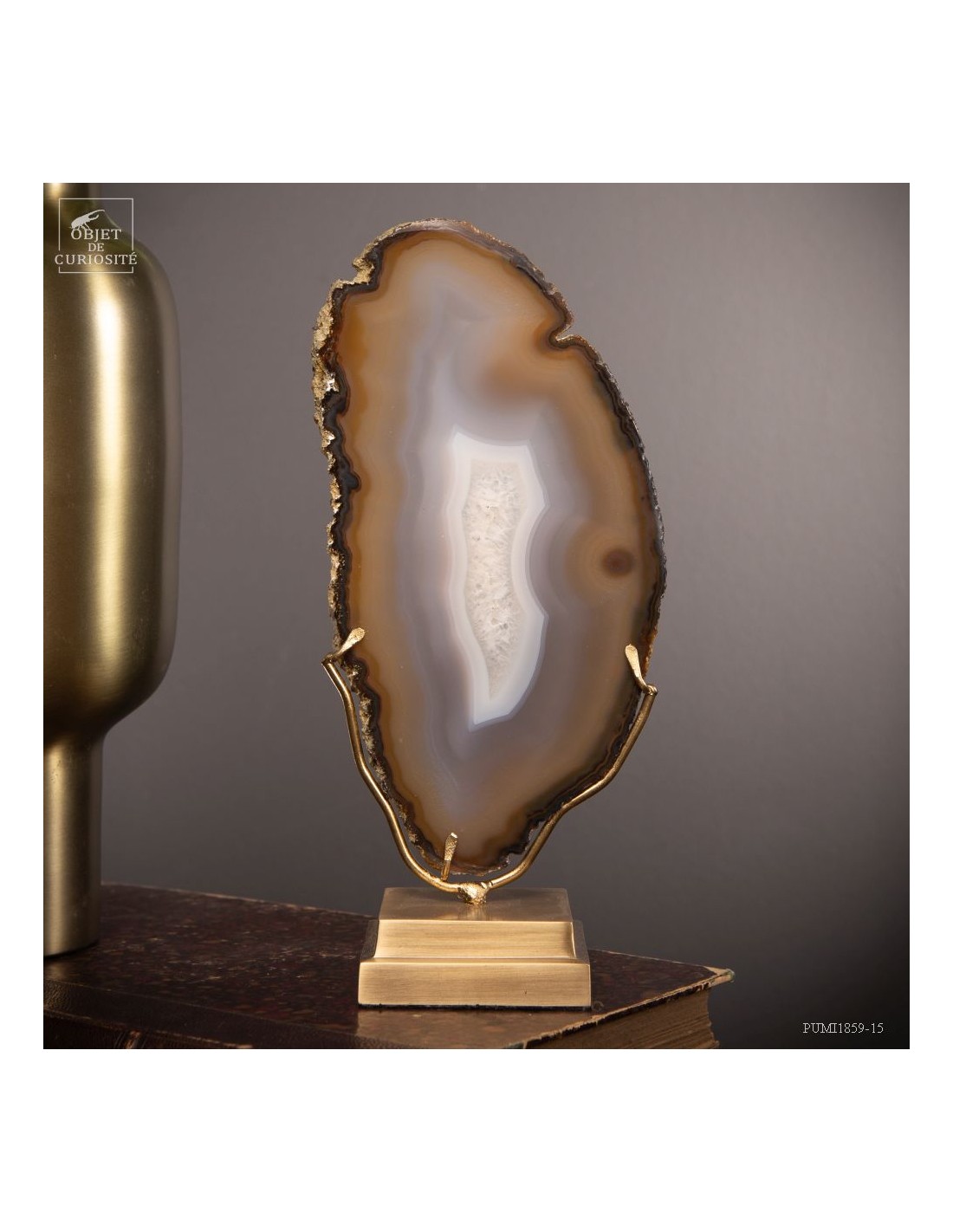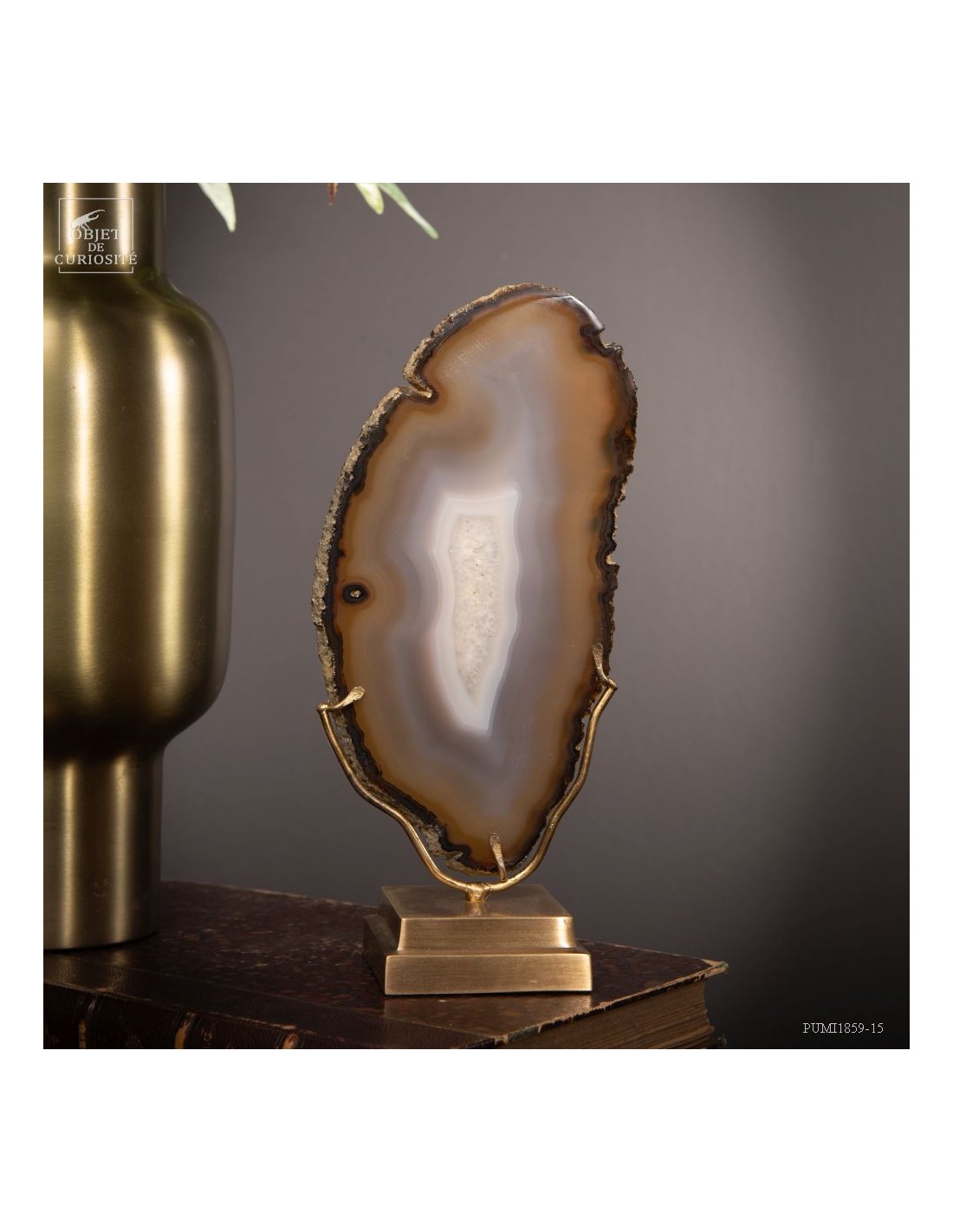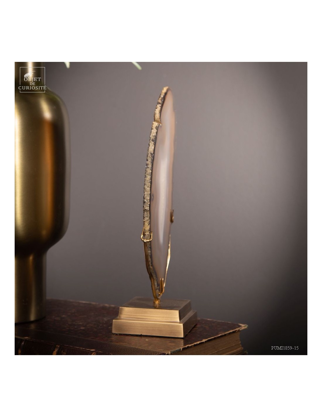 Agate du Brésil. Taillée en fine tranche, elle devient translucide et laisse passer la lumière.