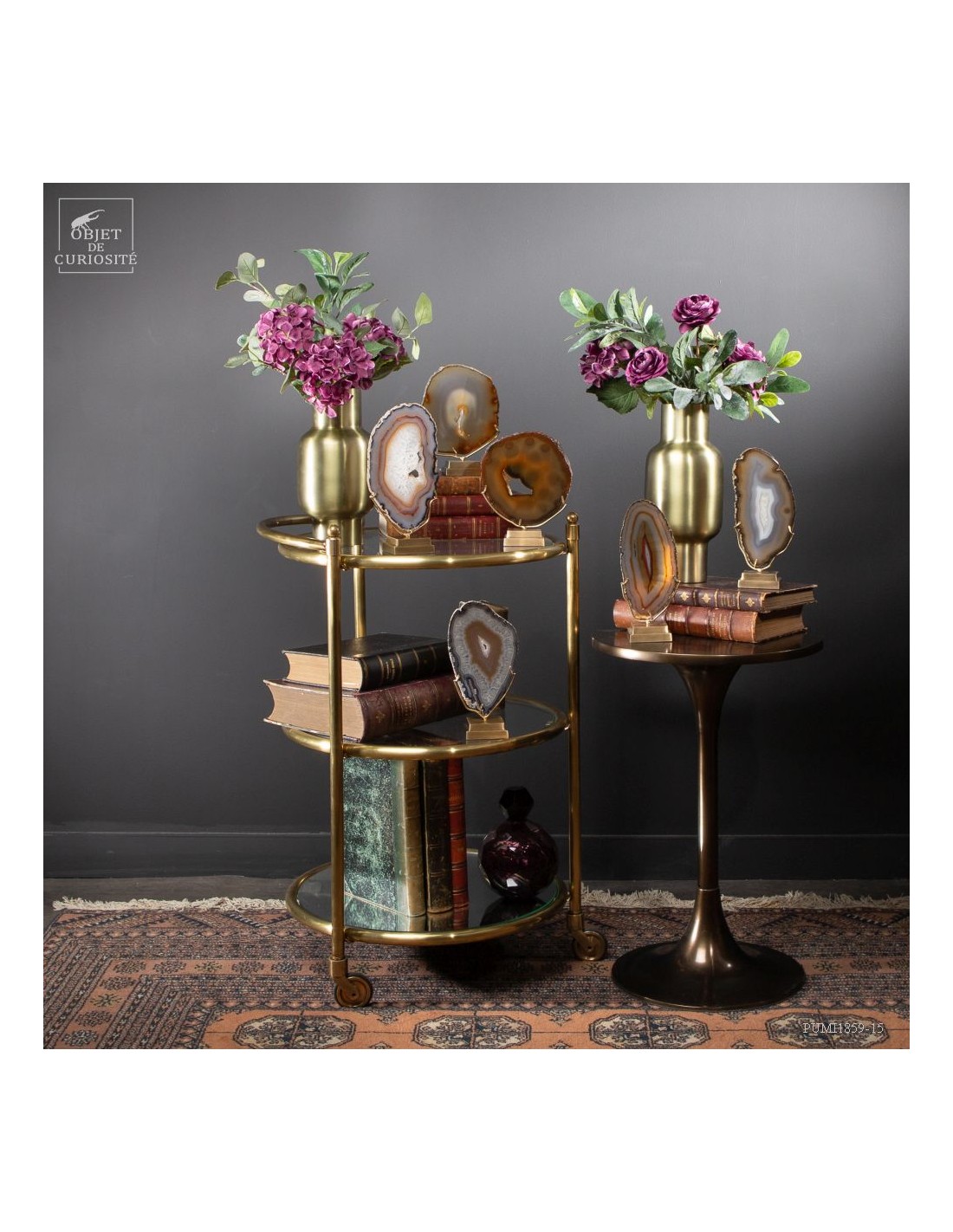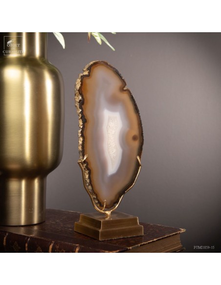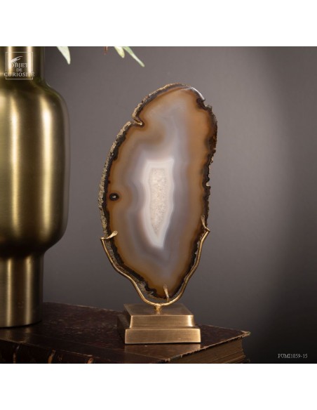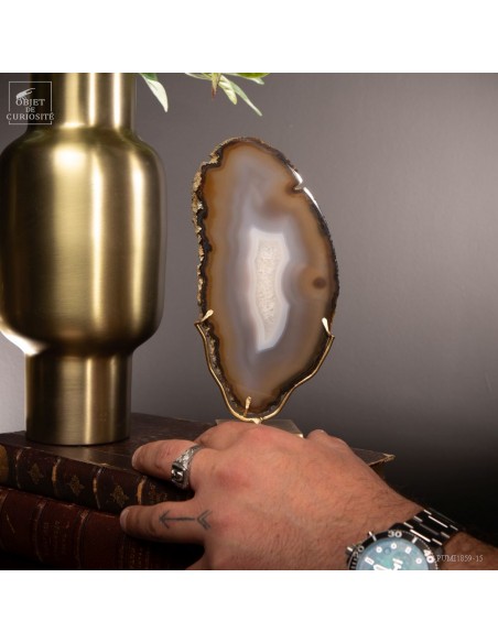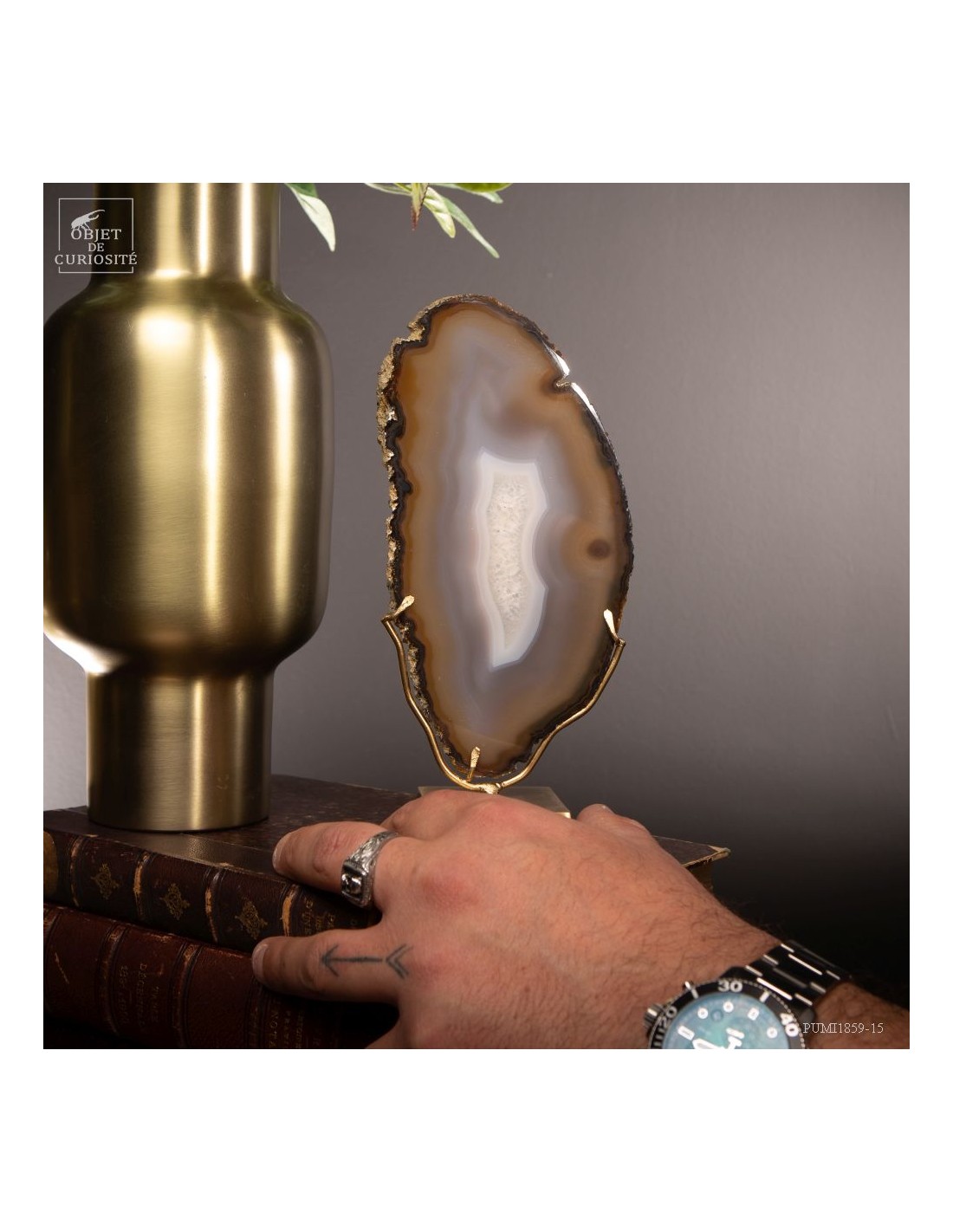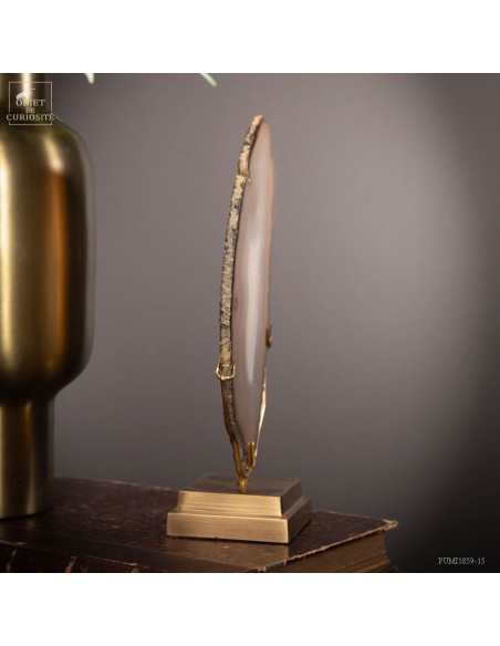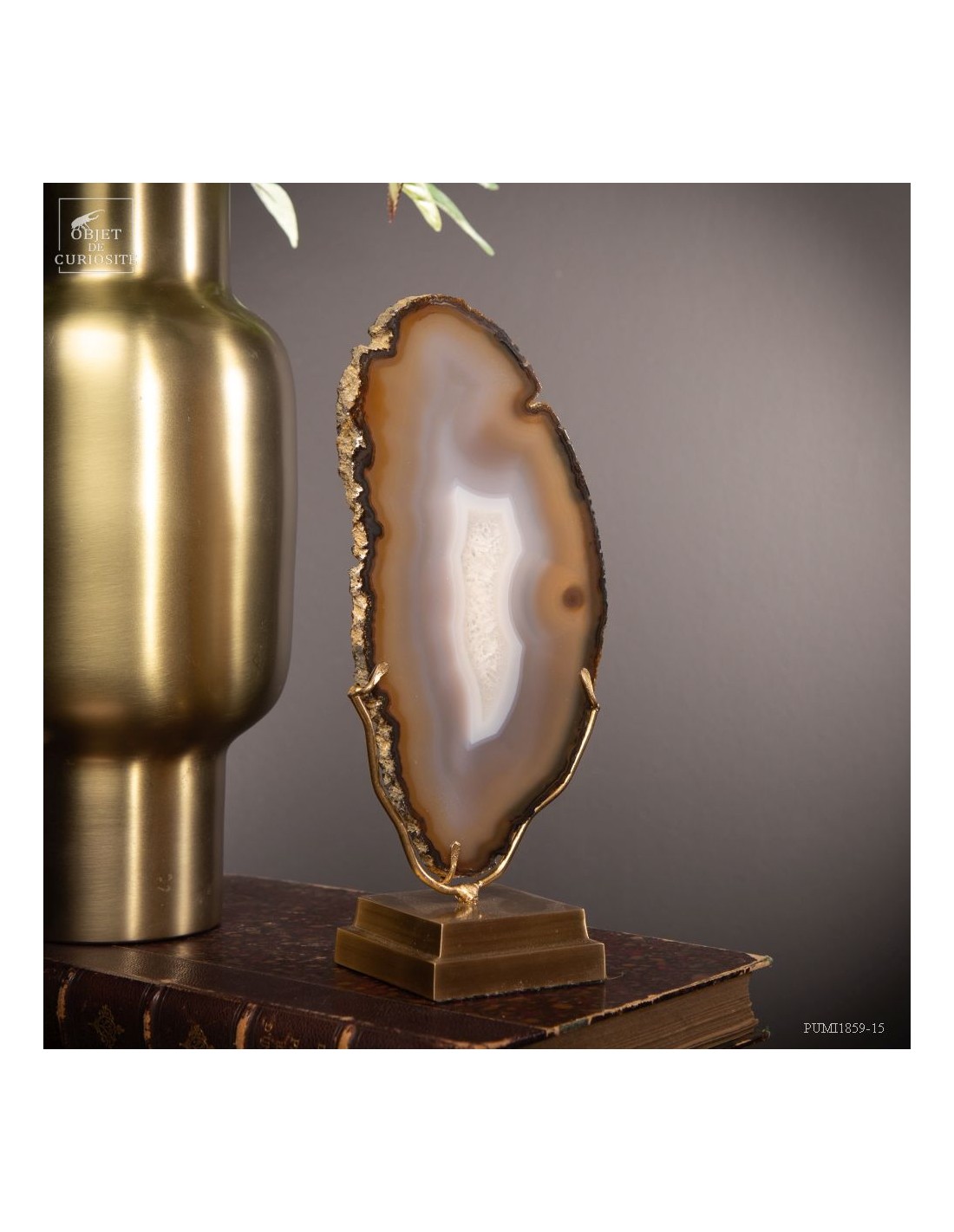 Agate du Brésil. Taillée en fine tranche, elle devient translucide et laisse passer la lumière.