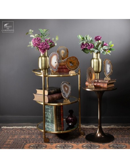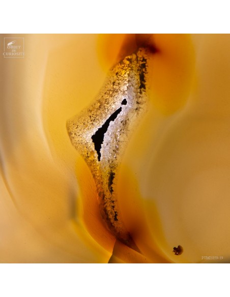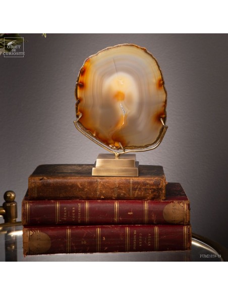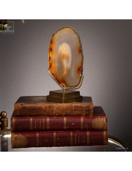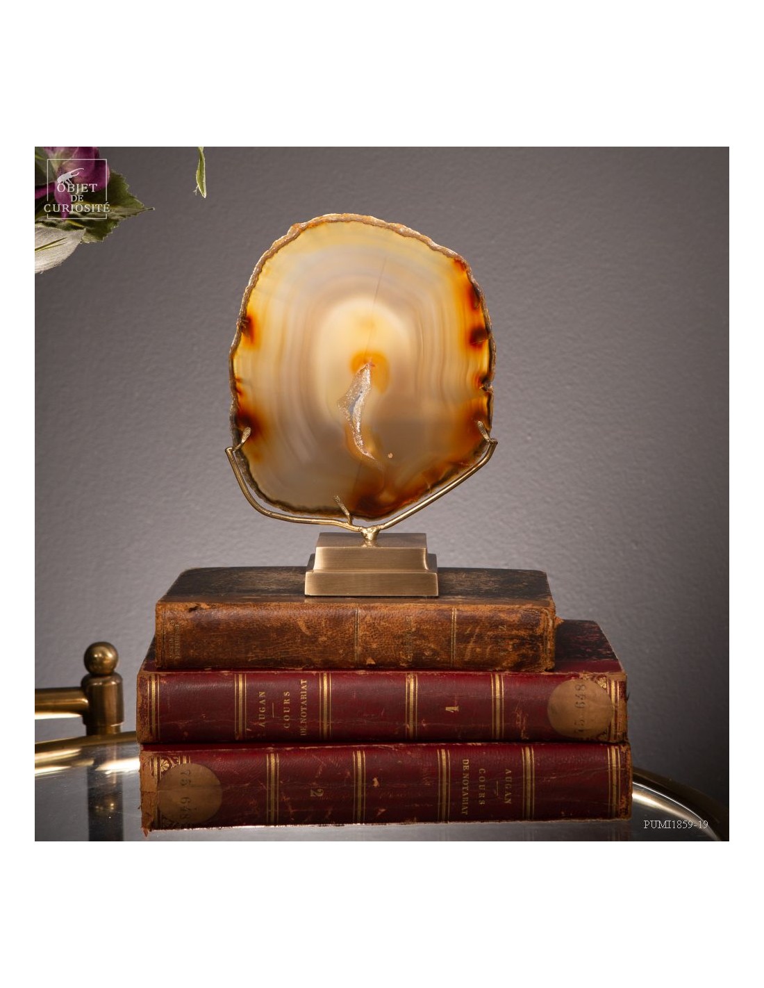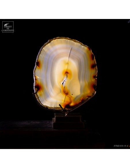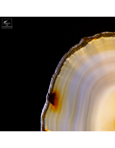 Agate du Brésil. Taillée en fine tranche, elle devient translucide et laisse passer la lumière;