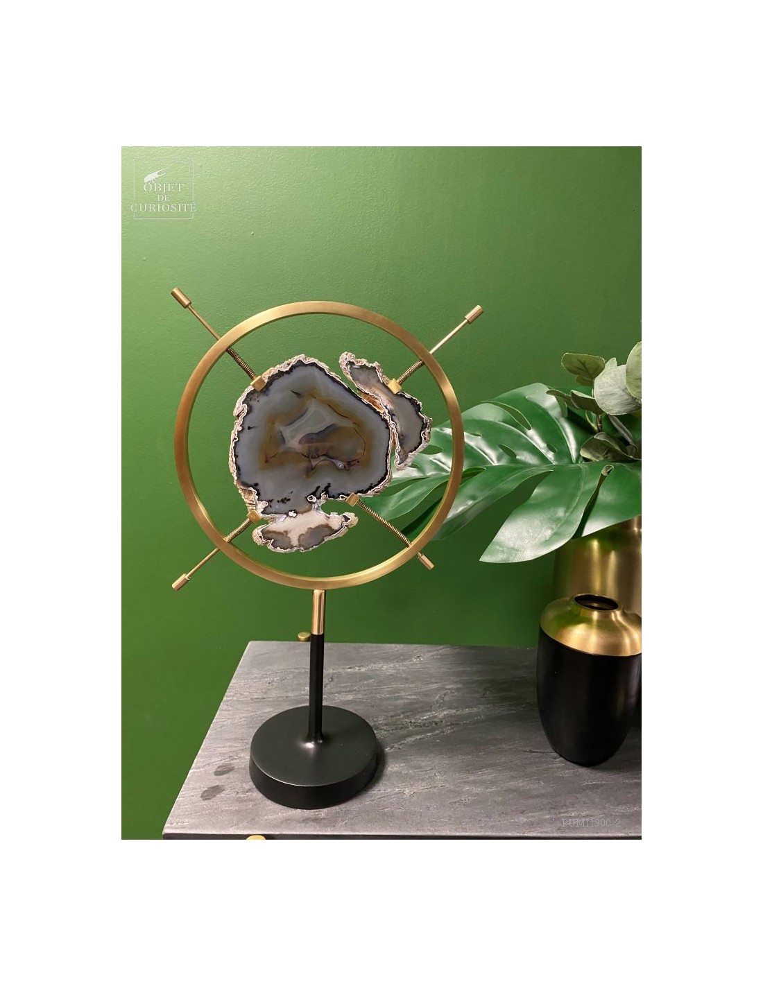 Tranche d'Agate naturelle à deux tons provenant de L'état de Rio Grande do sul, au Brésil, sur un élégant présentoir noir et laiton satiné. Et avant d'être cette pierre, c'était une bulle d'air dans la lave refroidie d'un volcan. La lave est devenue du basalte: une roche poreuse, et cette chambre a été successivement remplie, sur des millénaires, par de l'eau avec des minéraux dissous. Comme de l'oxyde de Manganèse qui a donné ces lignes noires tout autour. Chaque inondation a apporté une couche de densité et couleur différente...