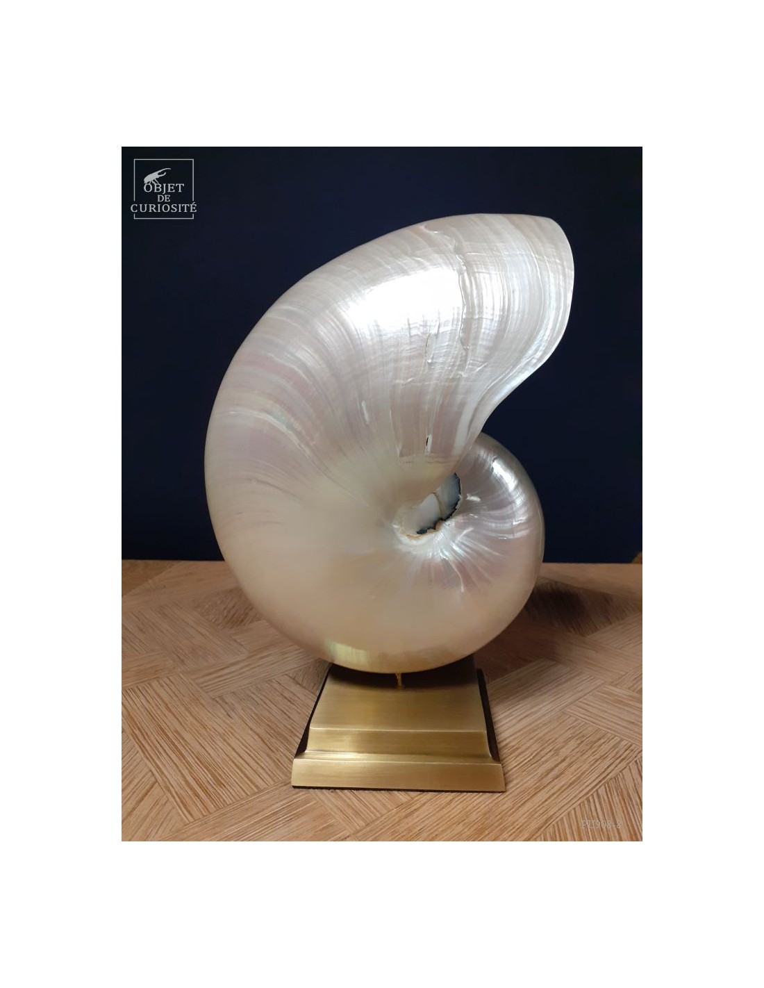 Nautile nacré. Ce coquillage, le Nautilus pompilius, est entièrement nacré car il a simplement été poli, et cette belle couleur est la couche inférieure de la coquille. Ce Nautile est exceptionnellement gros, et sur son socle de laiton, il se remarquera dans tous les décors. Espèce protégée par la convention de Washington.