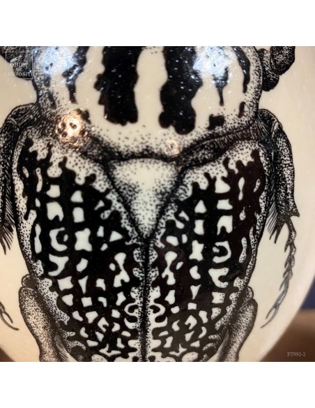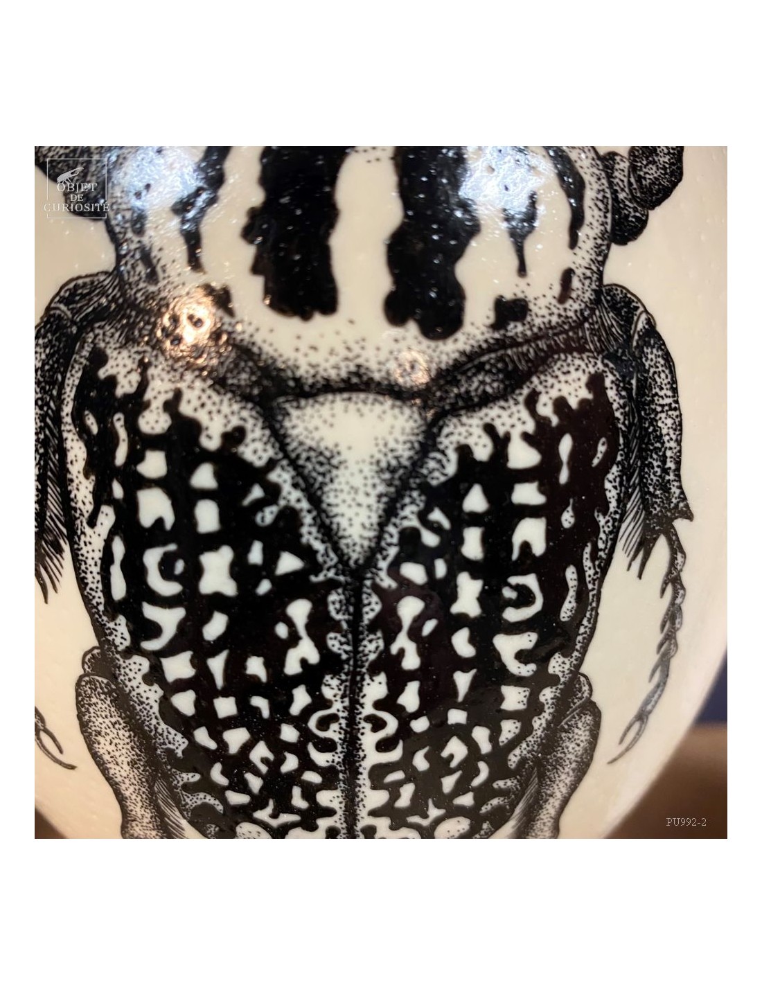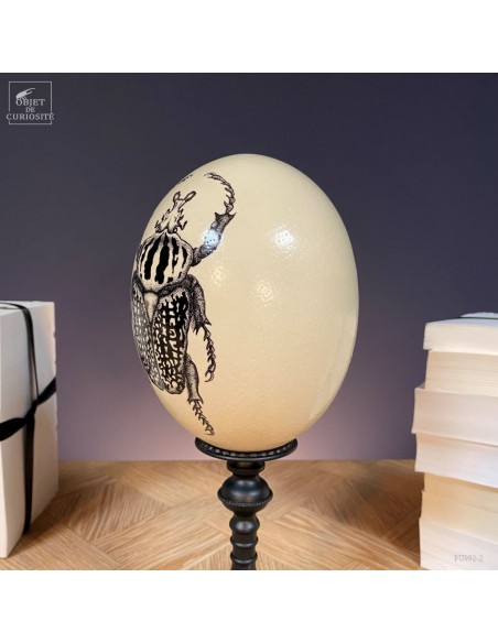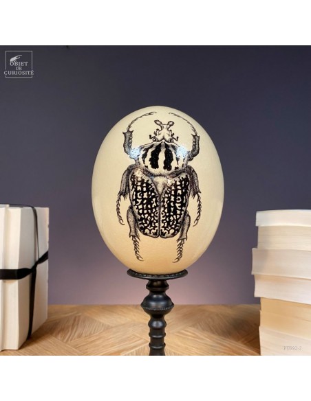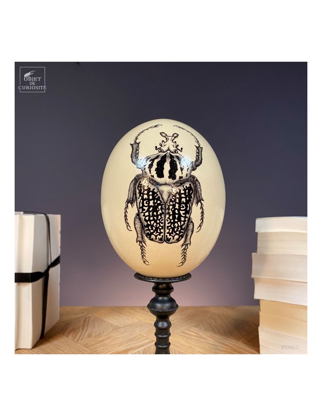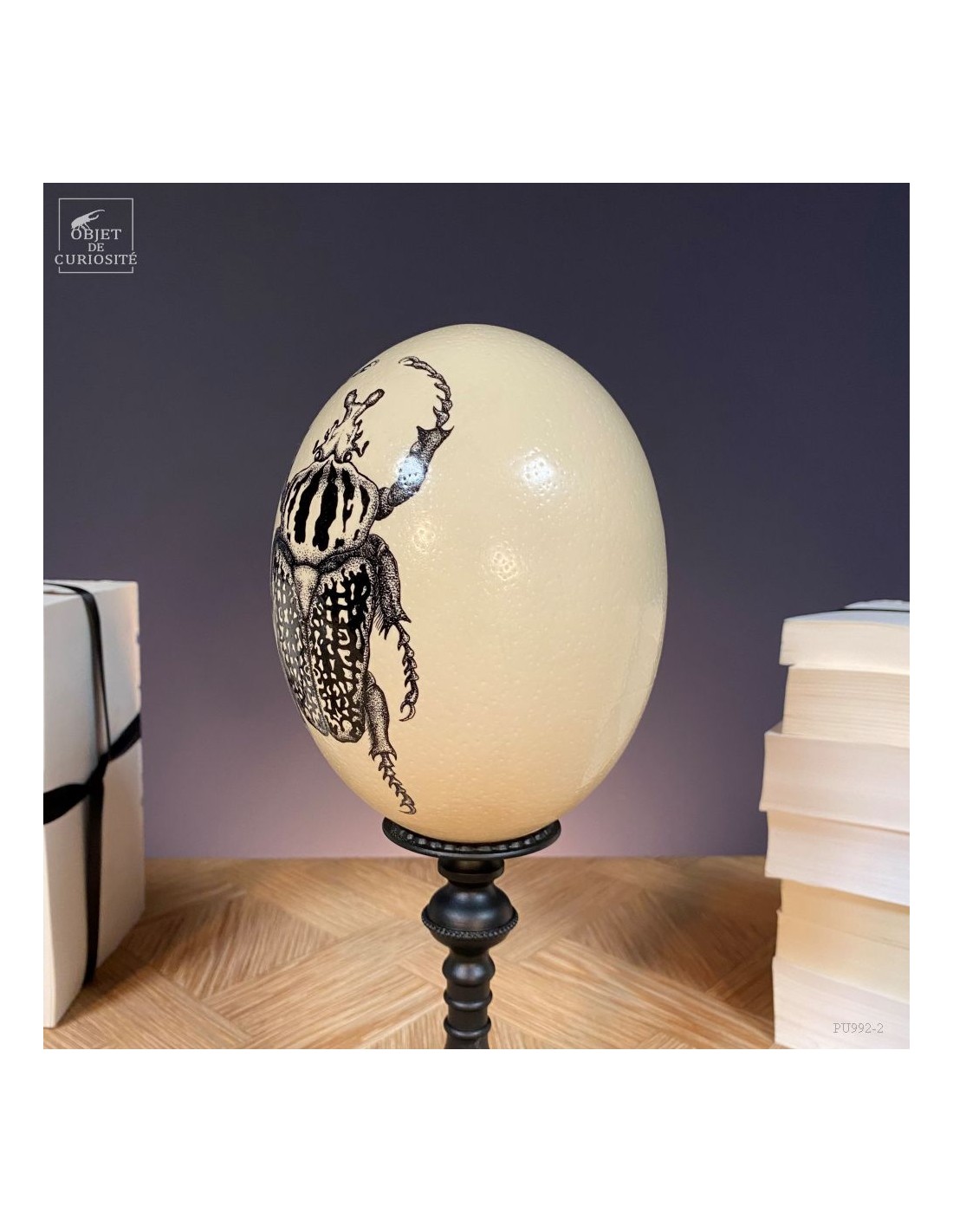 Le plus lourd insecte du monde, sur le plus gros oeuf du monde. Les motifs noirs et blancs de ce coléoptère du centre de l'Afrique -Goliathus Orientalis- semblent presque faits pour être dessinés sur un oeuf d'autruche. Pourtant c'est bien en France que l'artiste anatomiste Juliette Grange a dessiné à l'encre ce bel insecte très graphique, sur un oeuf pondu... lui aussi en France. Un résultat impressionnant de précision, sur son pied de laiton noir.