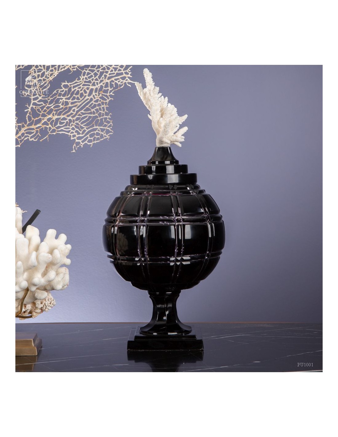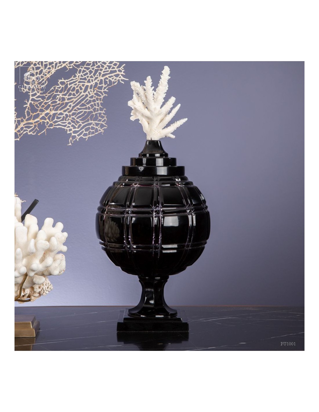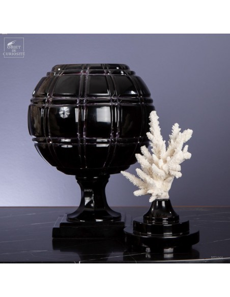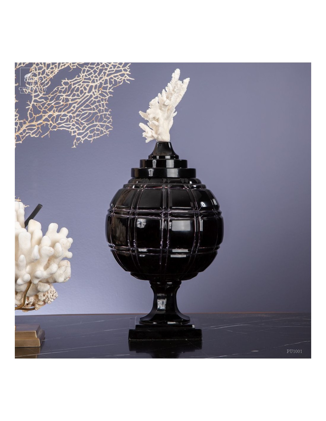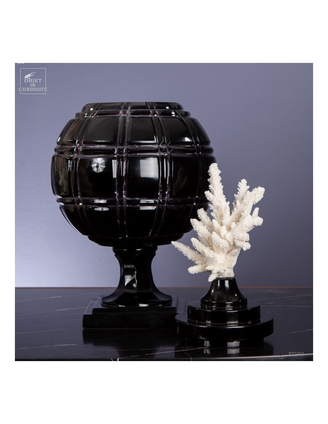 L'élégance classique d'un vase orné d'un corail blanc marié à la technique complexe du verre a double couche... mais que nous avons dessiné aujourd'hui. La couche transparente ne aperçois qu'avec les incisions qui dessinent ces motifs carrés. Noir et blanc, toujours élégant, ce vase mesure 45cm de haut et est unique.