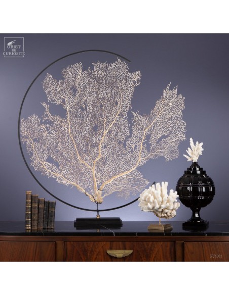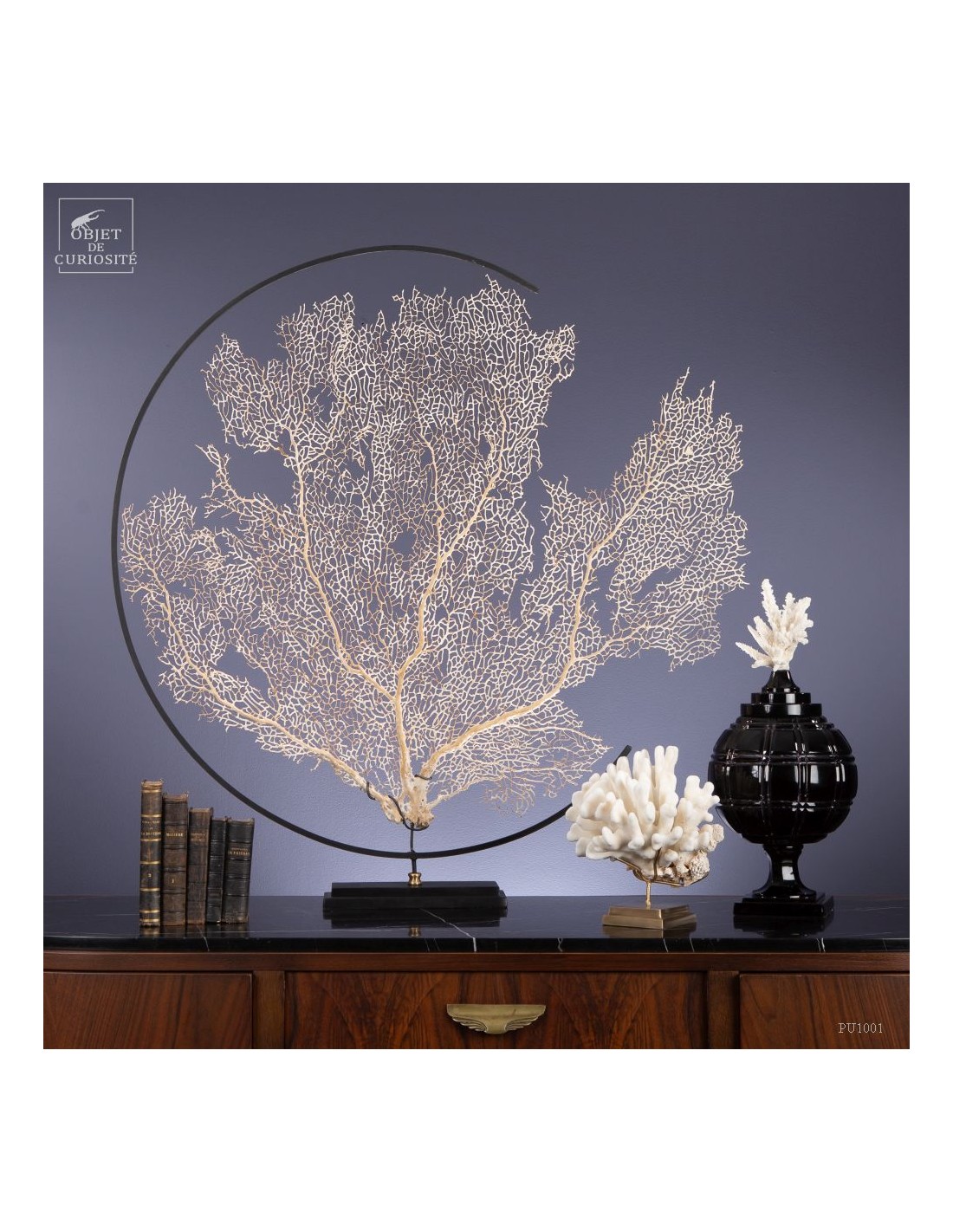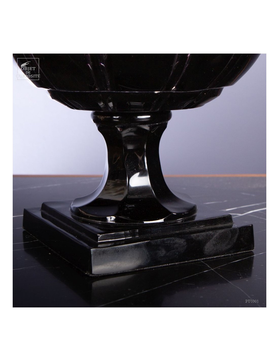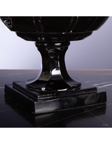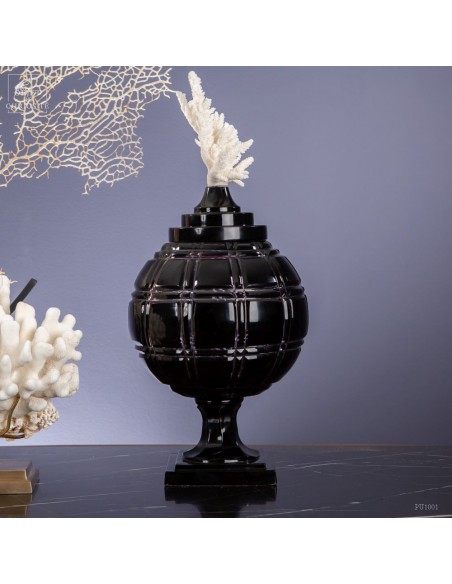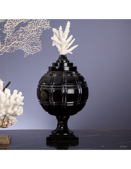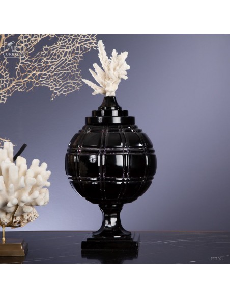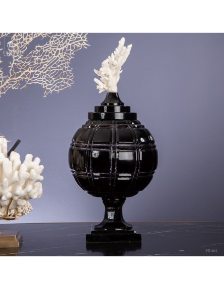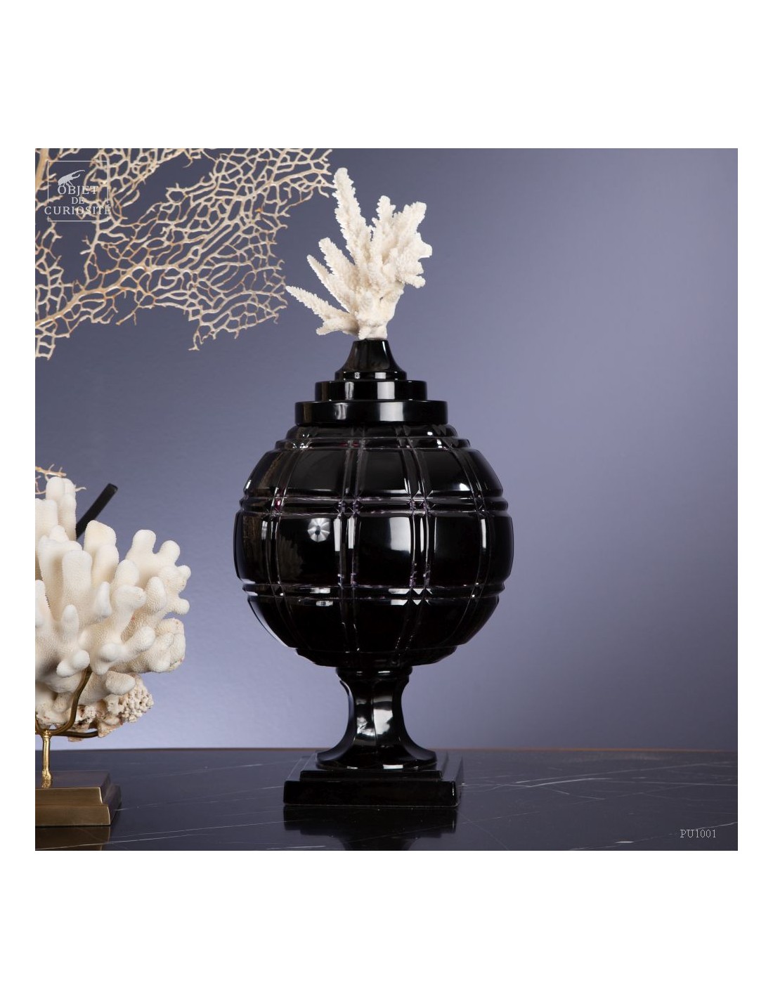 L'élégance classique d'un vase orné d'un corail blanc marié à la technique complexe du verre a double couche... mais que nous avons dessiné aujourd'hui. La couche transparente ne aperçois qu'avec les incisions qui dessinent ces motifs carrés. Noir et blanc, toujours élégant, ce vase mesure 45cm de haut et est unique.