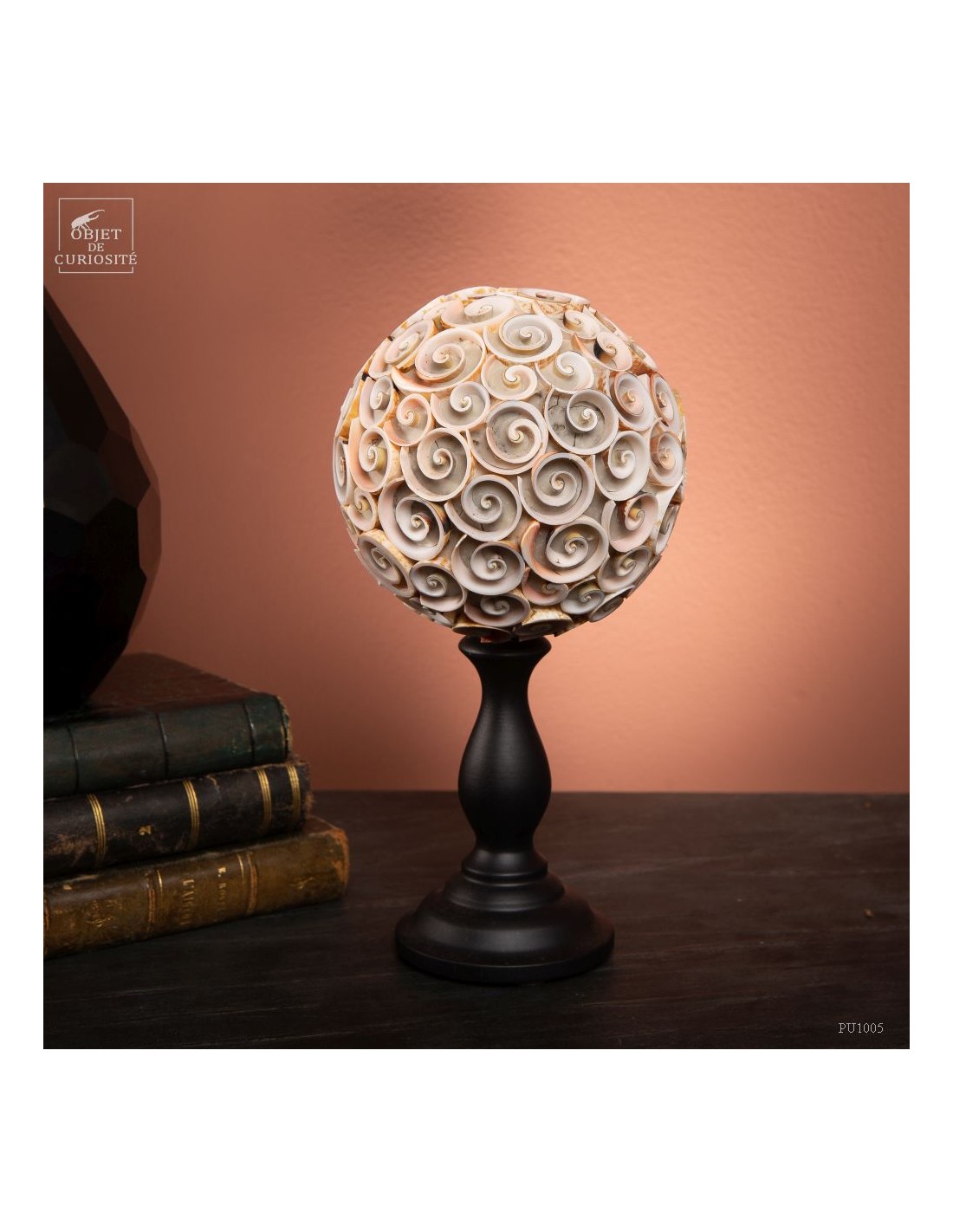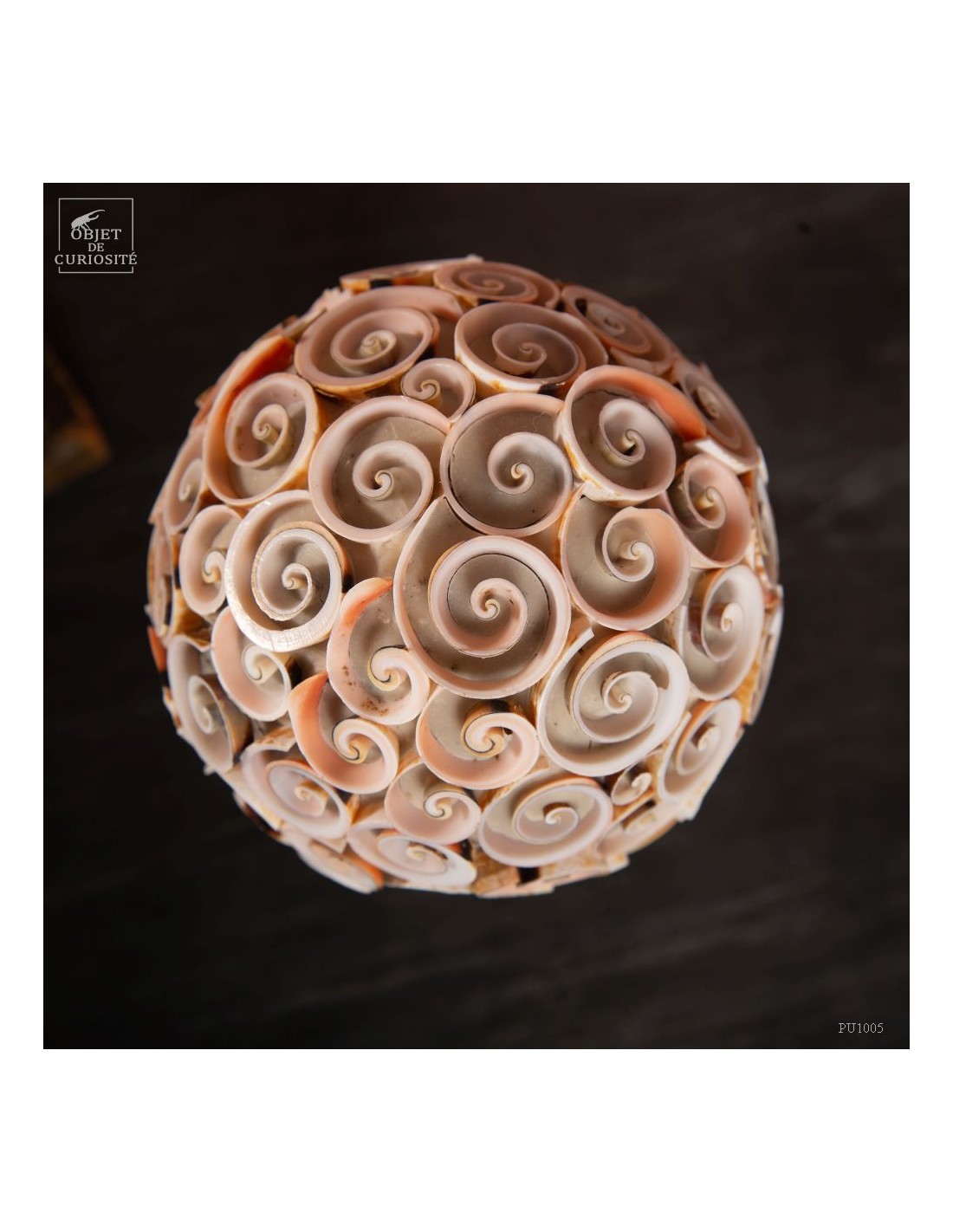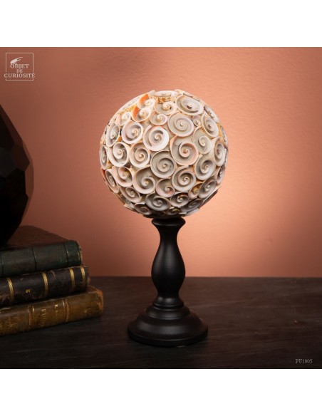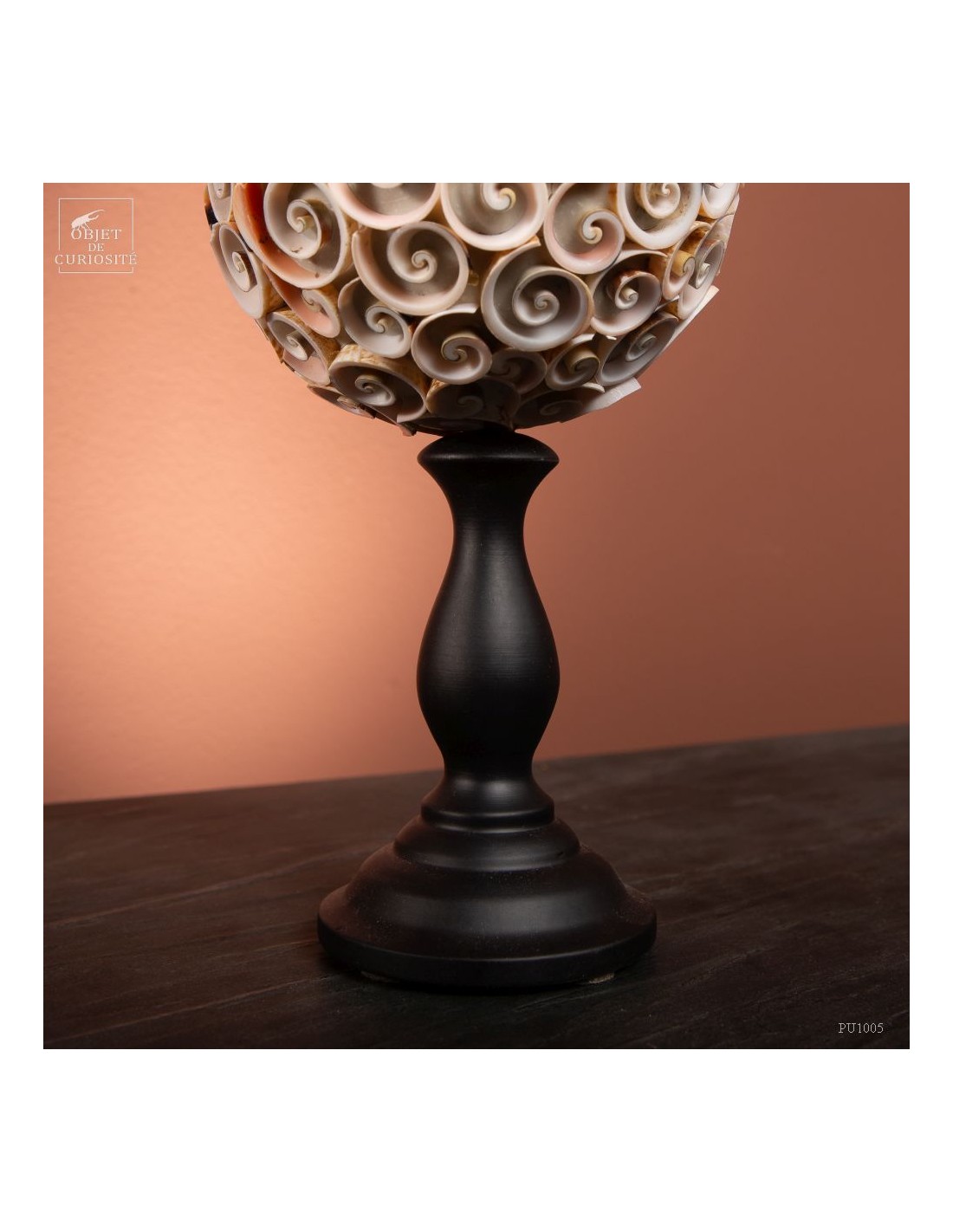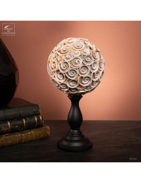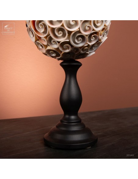 Cette jolie boule rosée est composée de tranches de la coquille d'un redoutable tueur: le Conus Géoraphus. Ce coquillage vivant sur les fonds de la zone Indo-Pacifique possède un dard puissament empoisonné avec lequel il paralyse ses proies (poissons et autres mollusques) avant de les dévorer. Mais il est aussi le seul coquillage mortel pour l'homme! Sous cette forme de sphere sur base en bois noir, il est surtout redoutablement attirant!