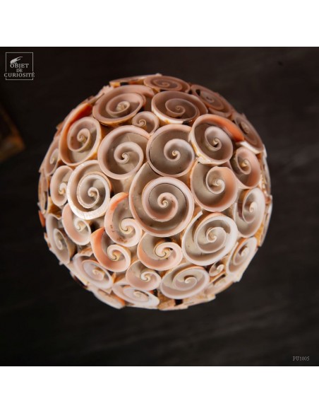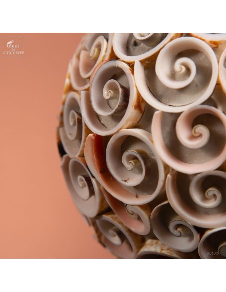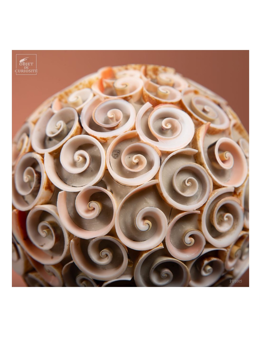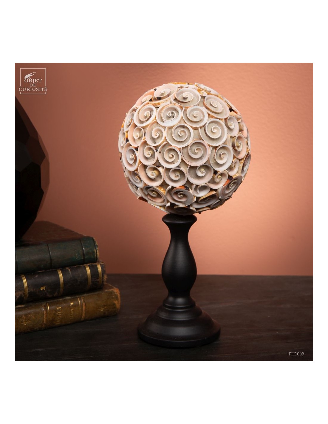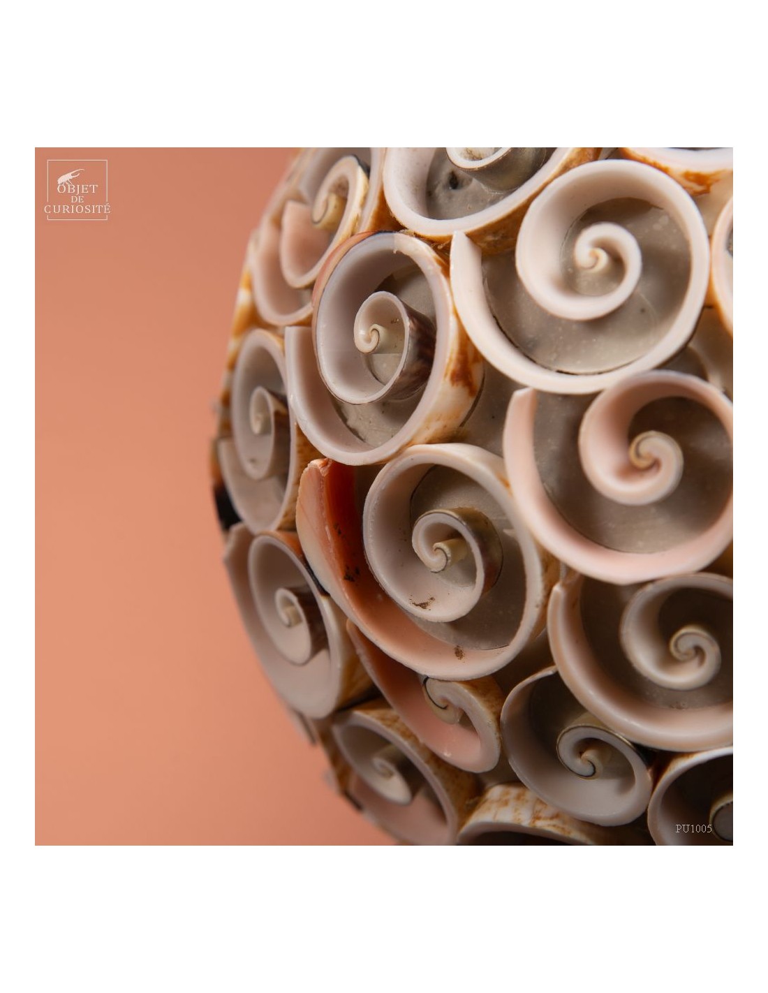 Cette jolie boule rosée est composée de tranches de la coquille d'un redoutable tueur: le Conus Géoraphus. Ce coquillage vivant sur les fonds de la zone Indo-Pacifique possède un dard puissament empoisonné avec lequel il paralyse ses proies (poissons et autres mollusques) avant de les dévorer. Mais il est aussi le seul coquillage mortel pour l'homme! Sous cette forme de sphere sur base en bois noir, il est surtout redoutablement attirant!