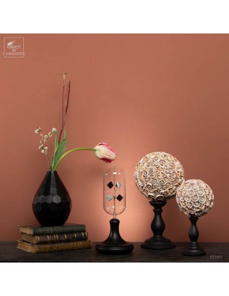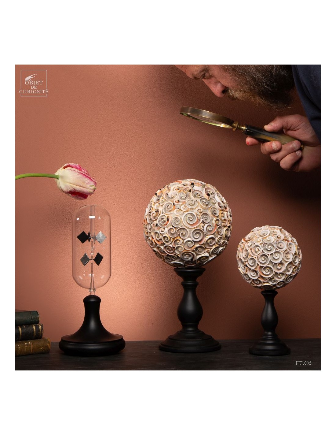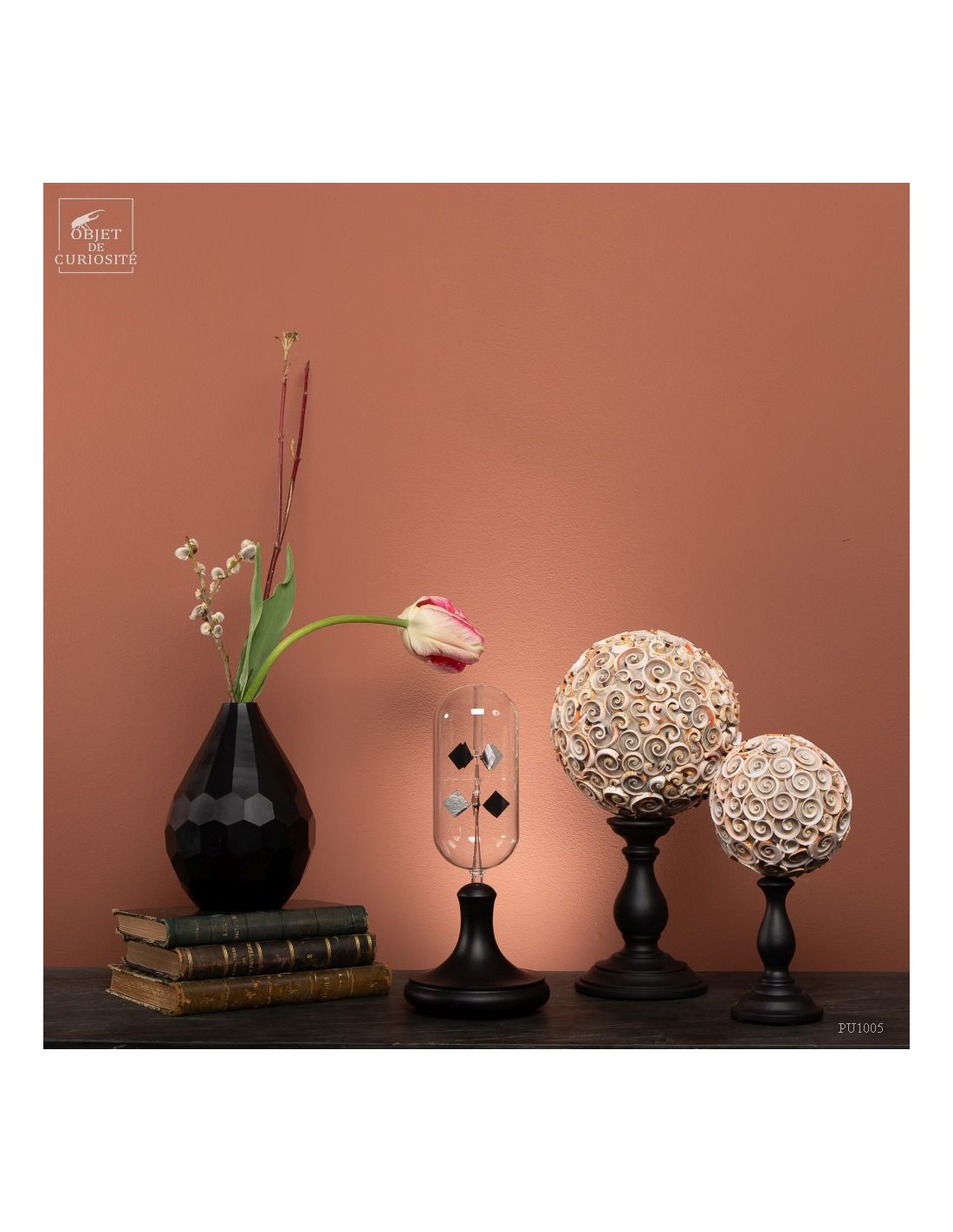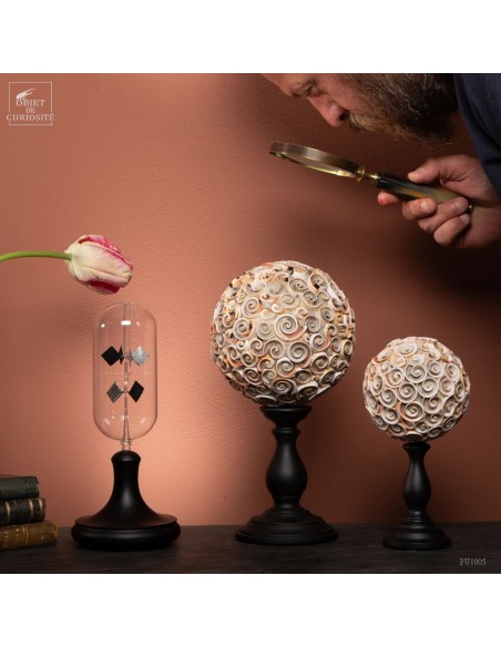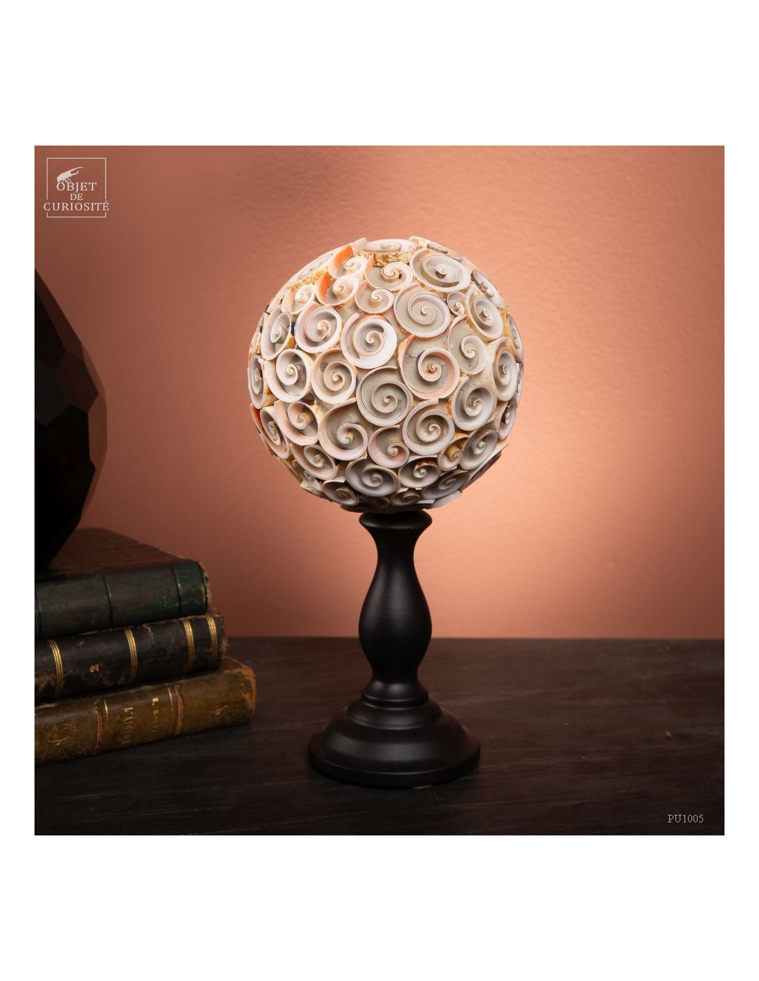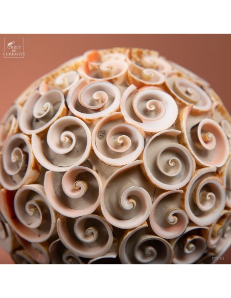 Cette jolie boule rosée est composée de tranches de la coquille d'un redoutable tueur: le Conus Géoraphus. Ce coquillage vivant sur les fonds de la zone Indo-Pacifique possède un dard puissament empoisonné avec lequel il paralyse ses proies (poissons et autres mollusques) avant de les dévorer. Mais il est aussi le seul coquillage mortel pour l'homme! Sous cette forme de sphere sur base en bois noir, il est surtout redoutablement attirant!