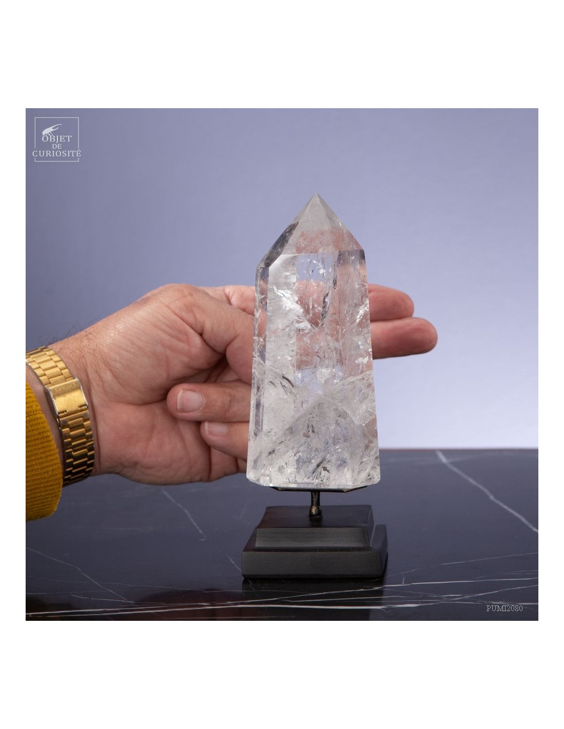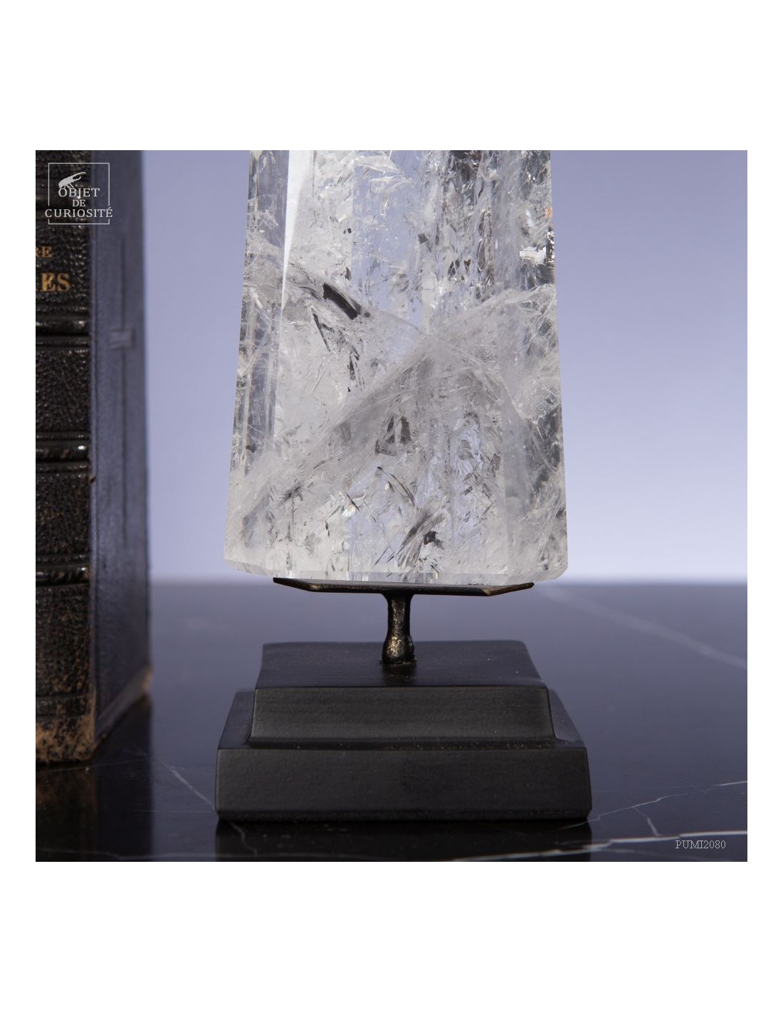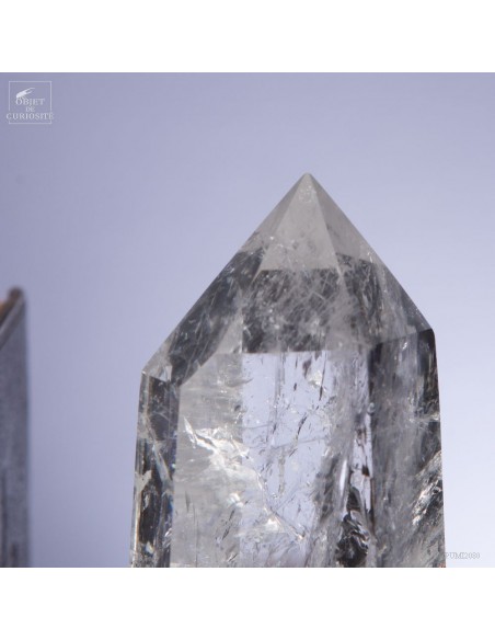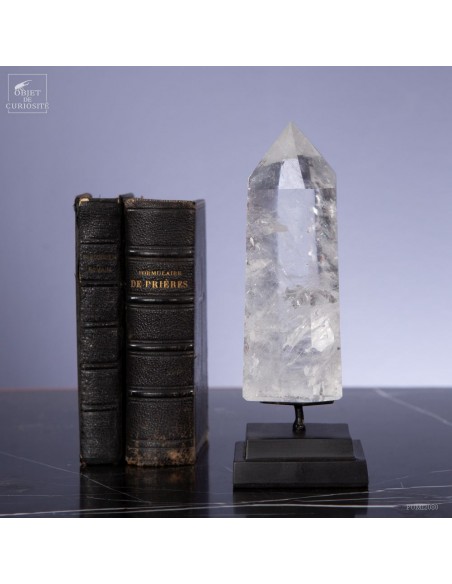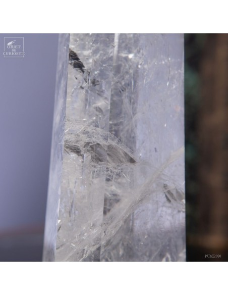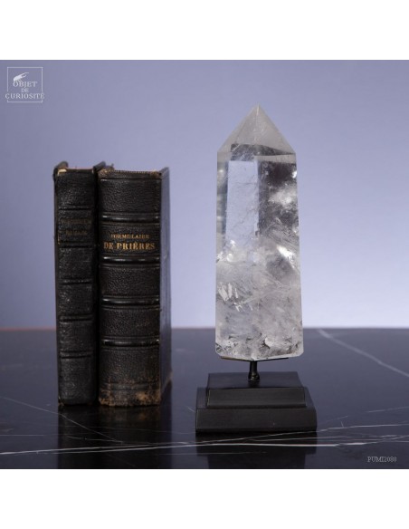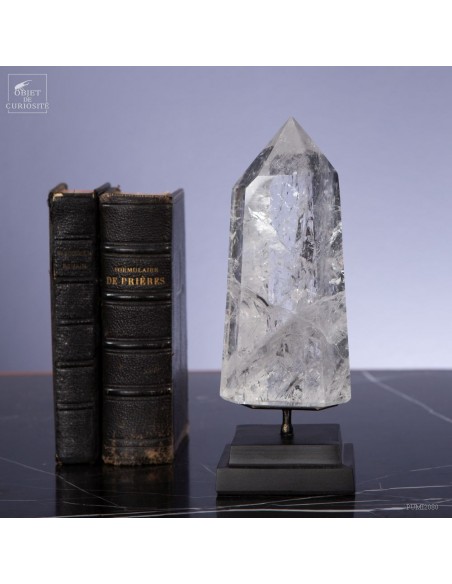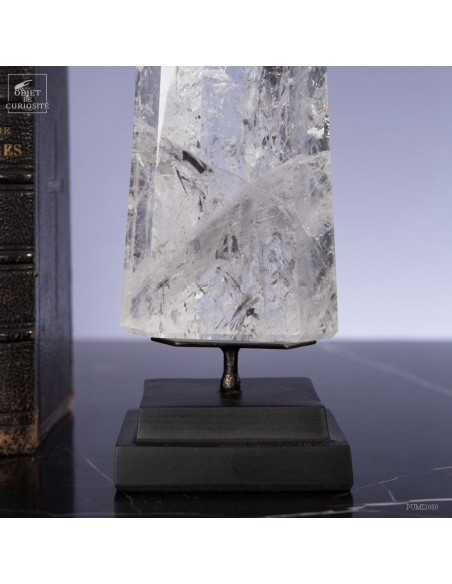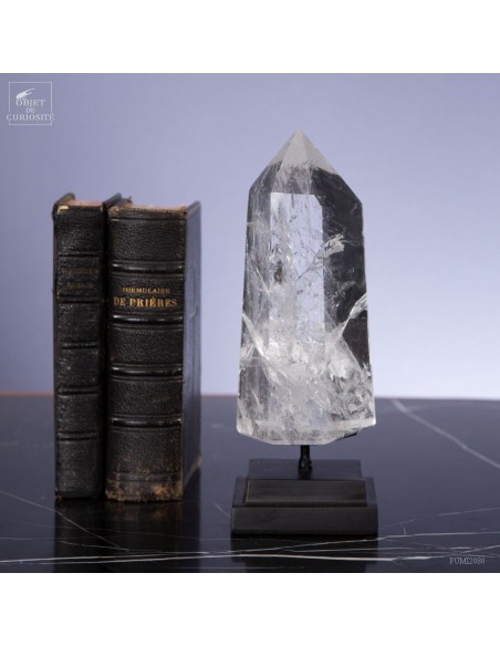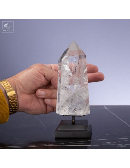 Cette pointe de cristal vient de Madagascar de 525gr est présentée sur une base noire. C'est un cristal très transparent, mais il semble qu'il contienne des voiles de mystère... En fait il est le résultat d'un mélange imparfait de la solution de minéraux qui le composent (dioxyde de Silicium+selenite, antimonite...) lors de sa croissance il y a plusieurs millions d'années. Un mélange imparfait, mais qui constitue le "jardin" de ce cristal: sa signature unique.
