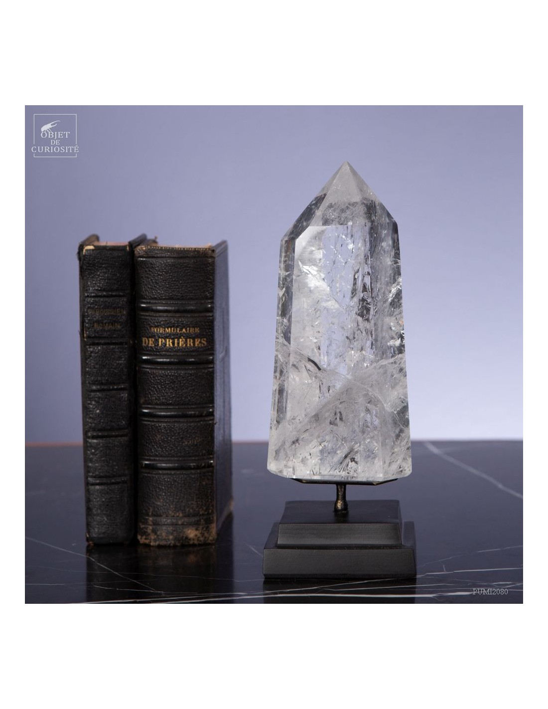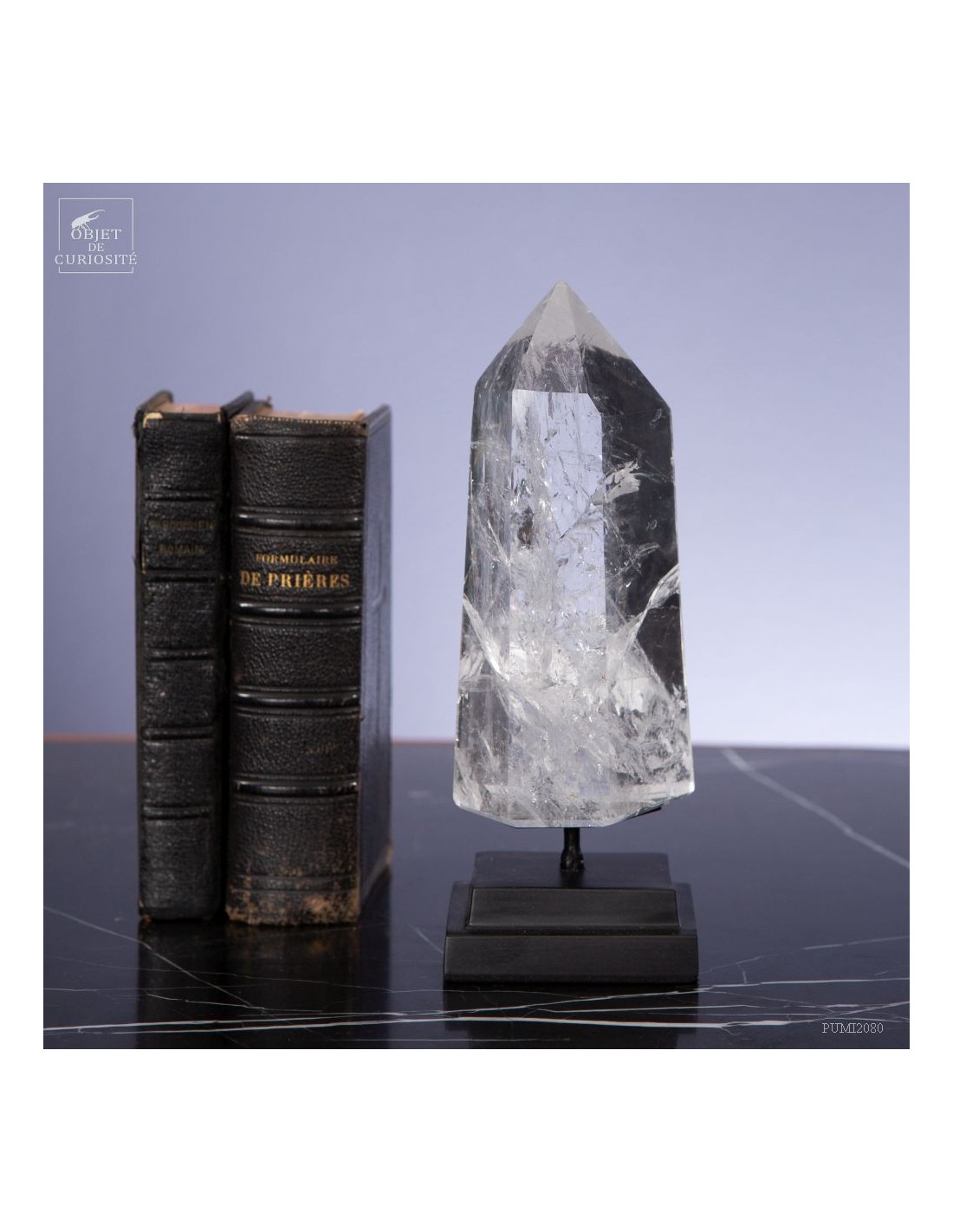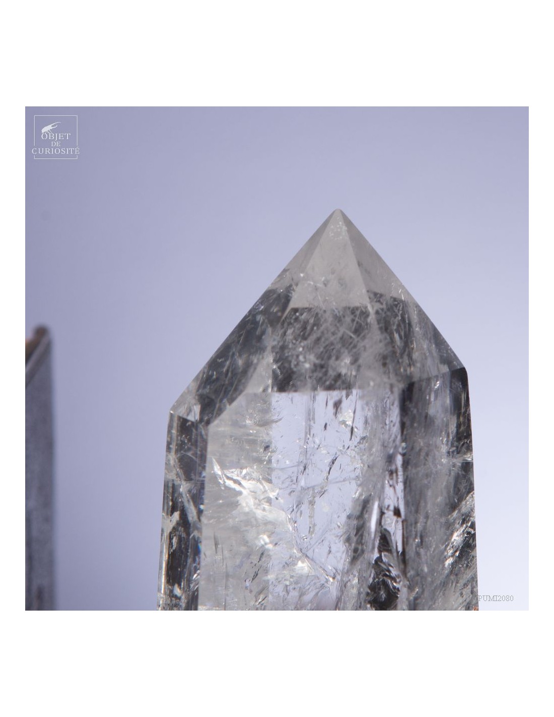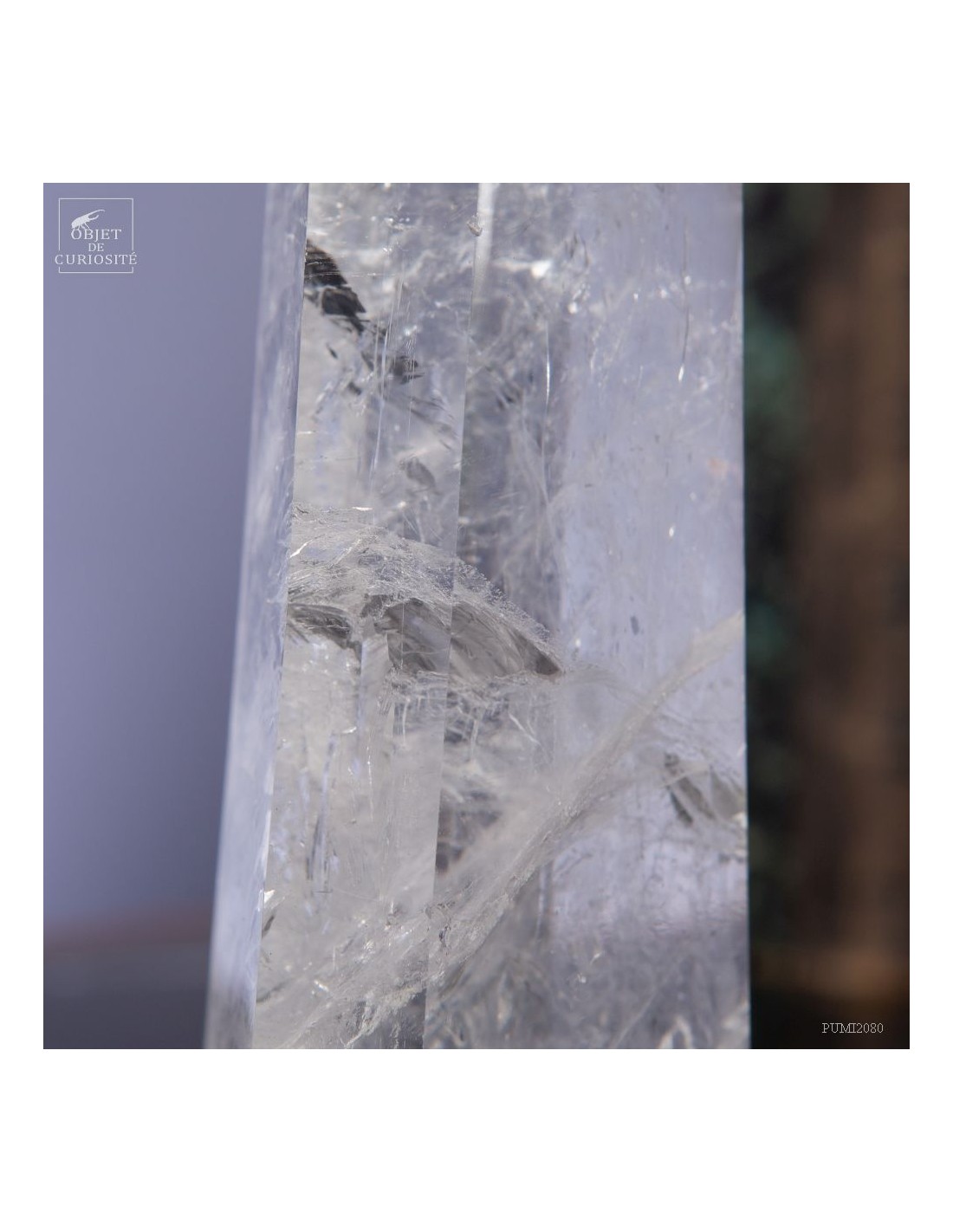 Cette pointe de cristal vient de Madagascar de 525gr est présentée sur une base noire. C'est un cristal très transparent, mais il semble qu'il contienne des voiles de mystère... En fait il est le résultat d'un mélange imparfait de la solution de minéraux qui le composent (dioxyde de Silicium+selenite, antimonite...) lors de sa croissance il y a plusieurs millions d'années. Un mélange imparfait, mais qui constitue le "jardin" de ce cristal: sa signature unique.
