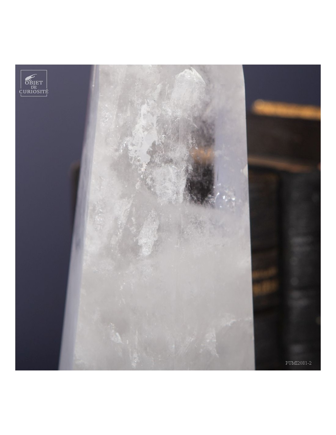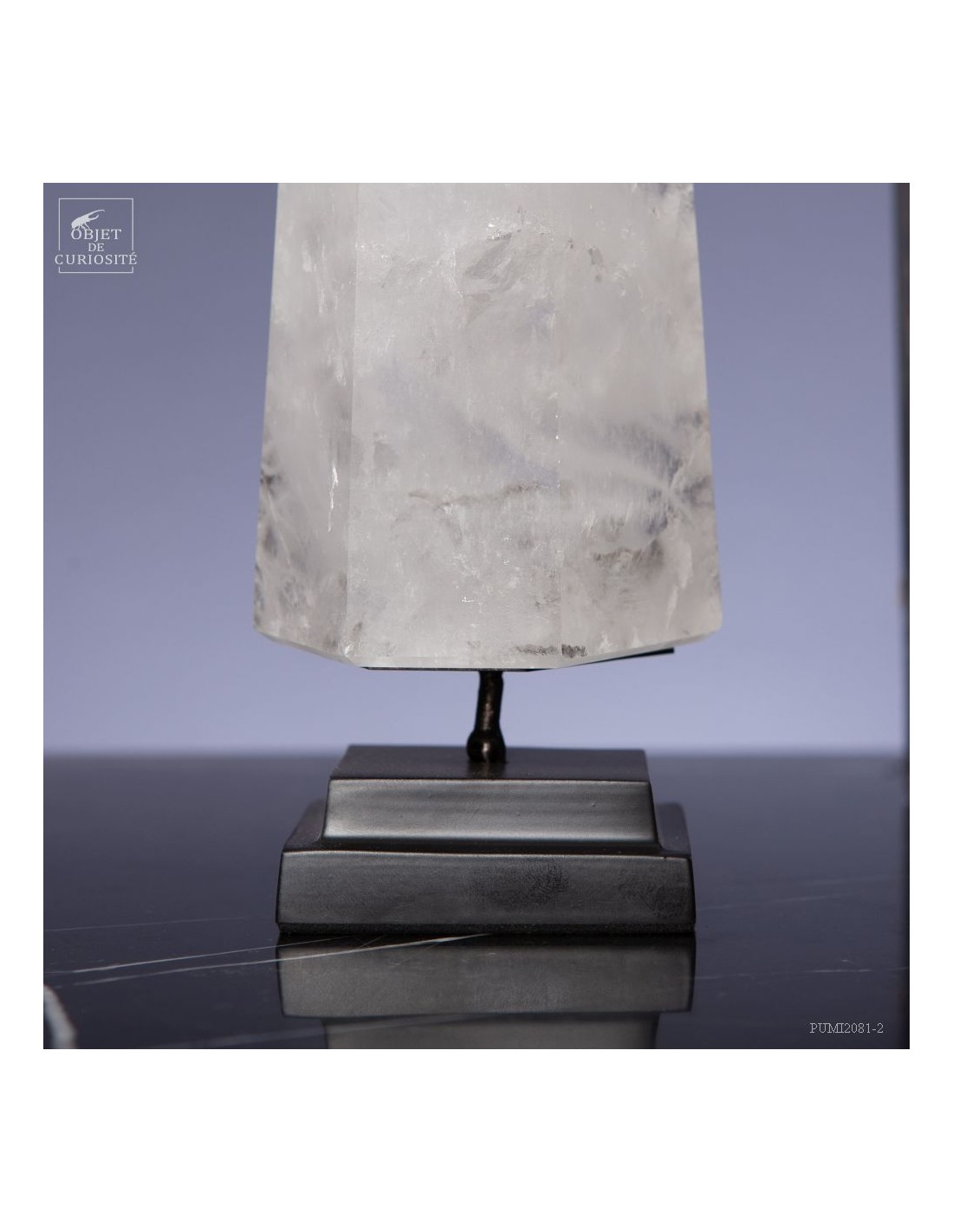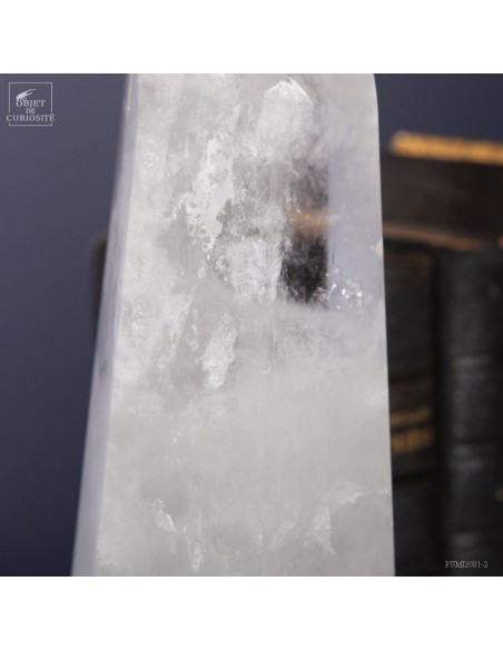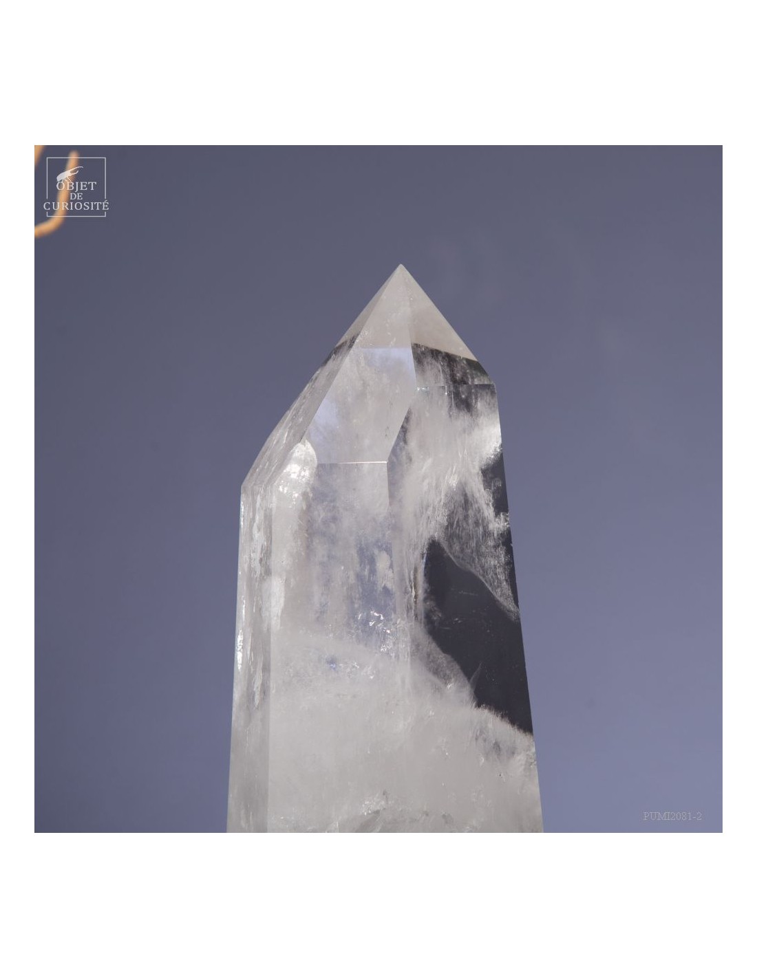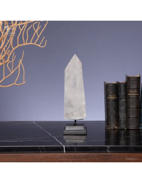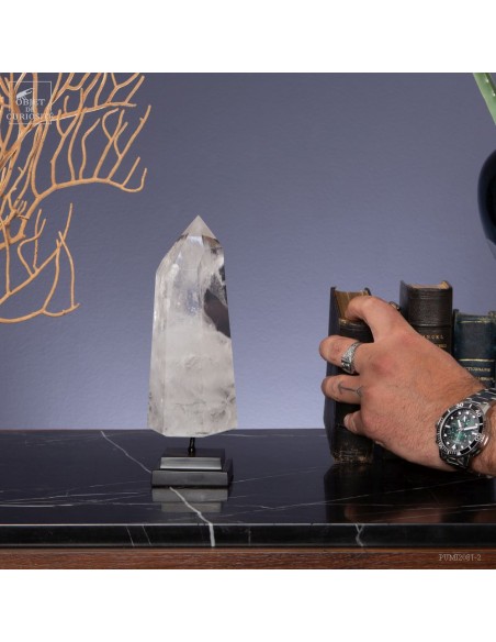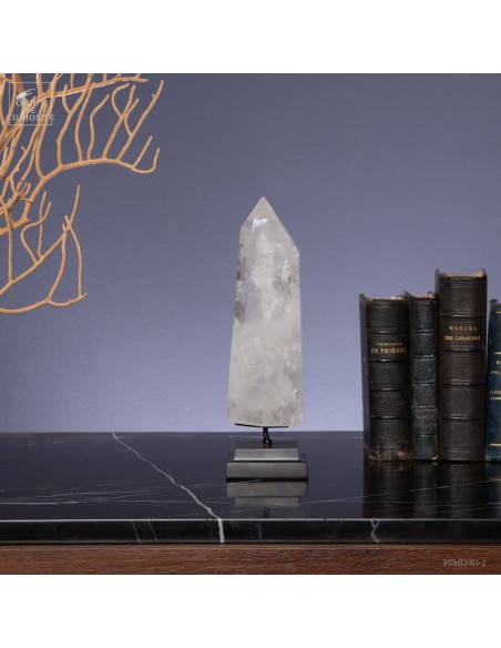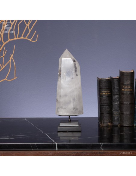 Cette pointe de cristal de 1 Kg vient de Madagascar et est présentée sur une base noire. C'est un cristal très transparent, mais il semble qu'il contienne des voiles de mystère... En fait il est le résultat d'un mélange imparfait de la solution de minéraux qui le composent (dioxyde de Silicium+selenite, antimonite...) lors de sa croissance il y a plusieurs millions d'années. Un mélange imparfait, mais qui constitue le "jardin" de ce cristal: sa signature unique.