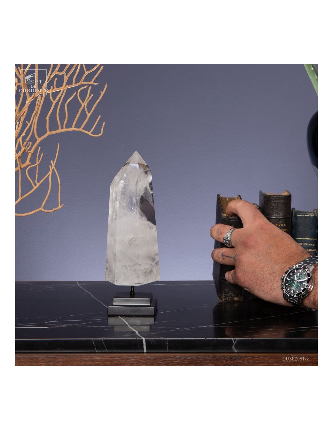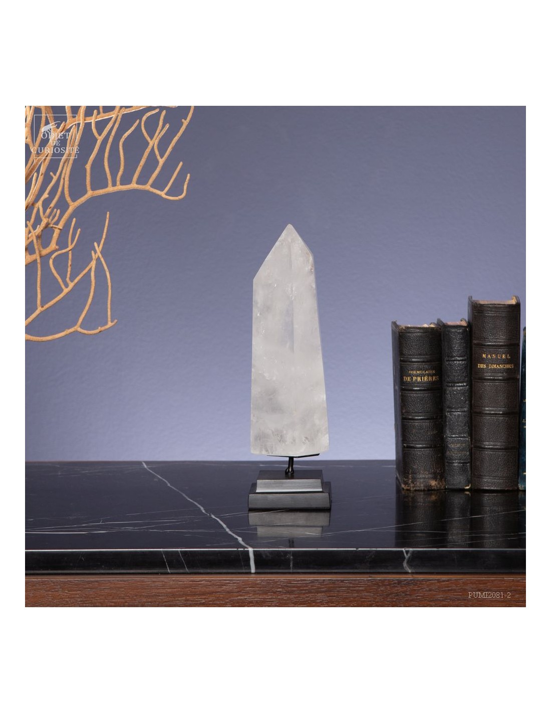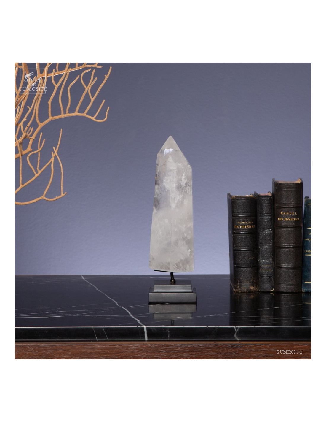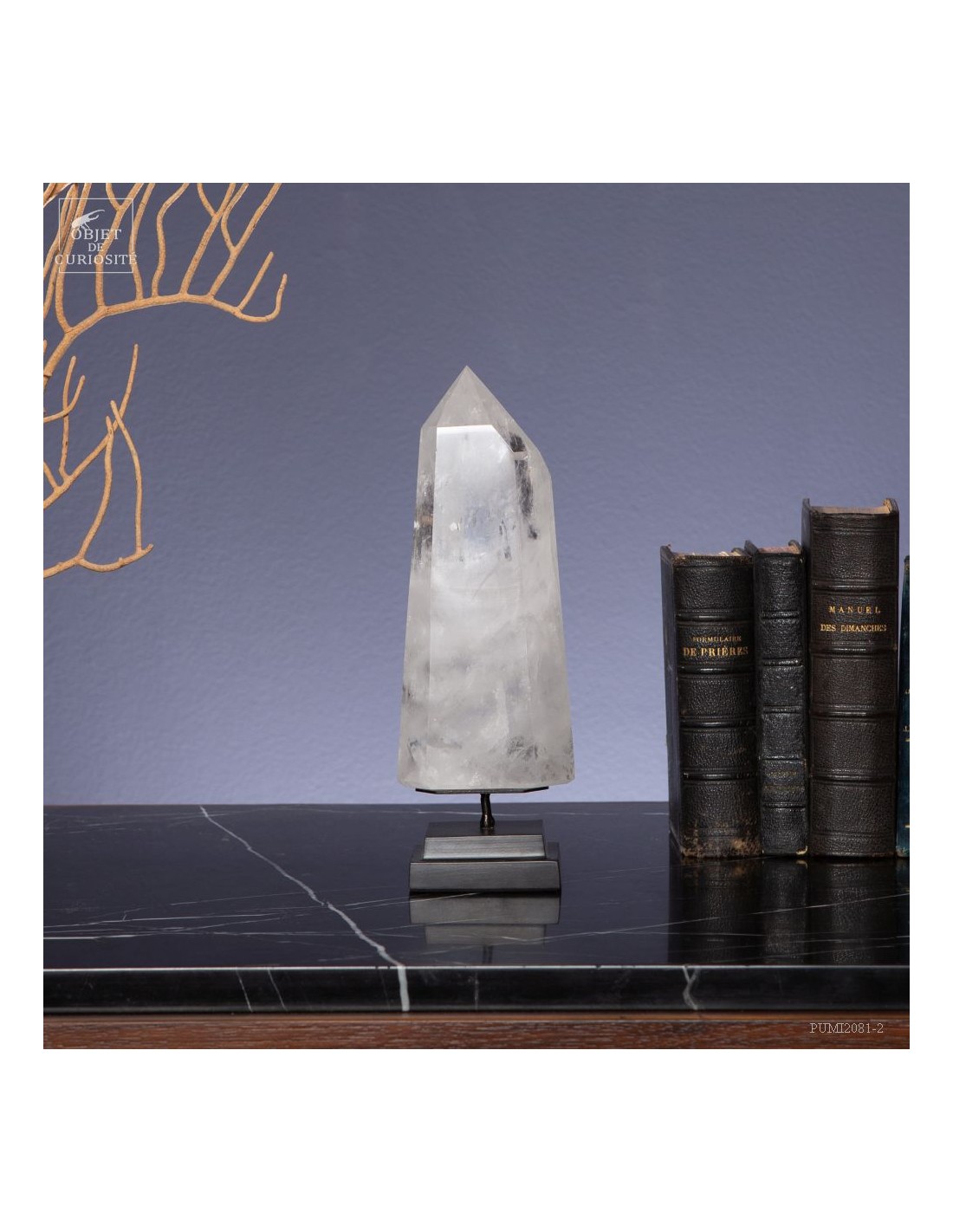 Cette pointe de cristal de 1 Kg vient de Madagascar et est présentée sur une base noire. C'est un cristal très transparent, mais il semble qu'il contienne des voiles de mystère... En fait il est le résultat d'un mélange imparfait de la solution de minéraux qui le composent (dioxyde de Silicium+selenite, antimonite...) lors de sa croissance il y a plusieurs millions d'années. Un mélange imparfait, mais qui constitue le "jardin" de ce cristal: sa signature unique.