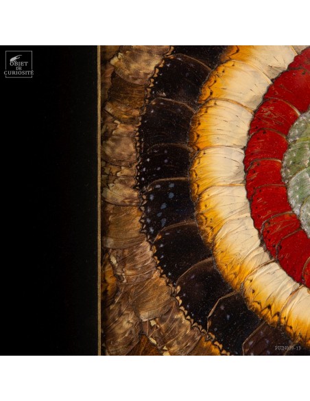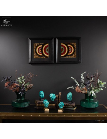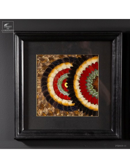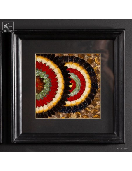 Deux tableaux composés uniquement d'ailes de papillons de Tanzanie. Une paire symétrique qui peut être accrochée dans 2 sens. Le contraste entre les Cimothoe Sangaris rouges, et les Piérides du cassier, jaunes, est très réussi. Le cadre est en Manguier massif. L'ensemble est unique.