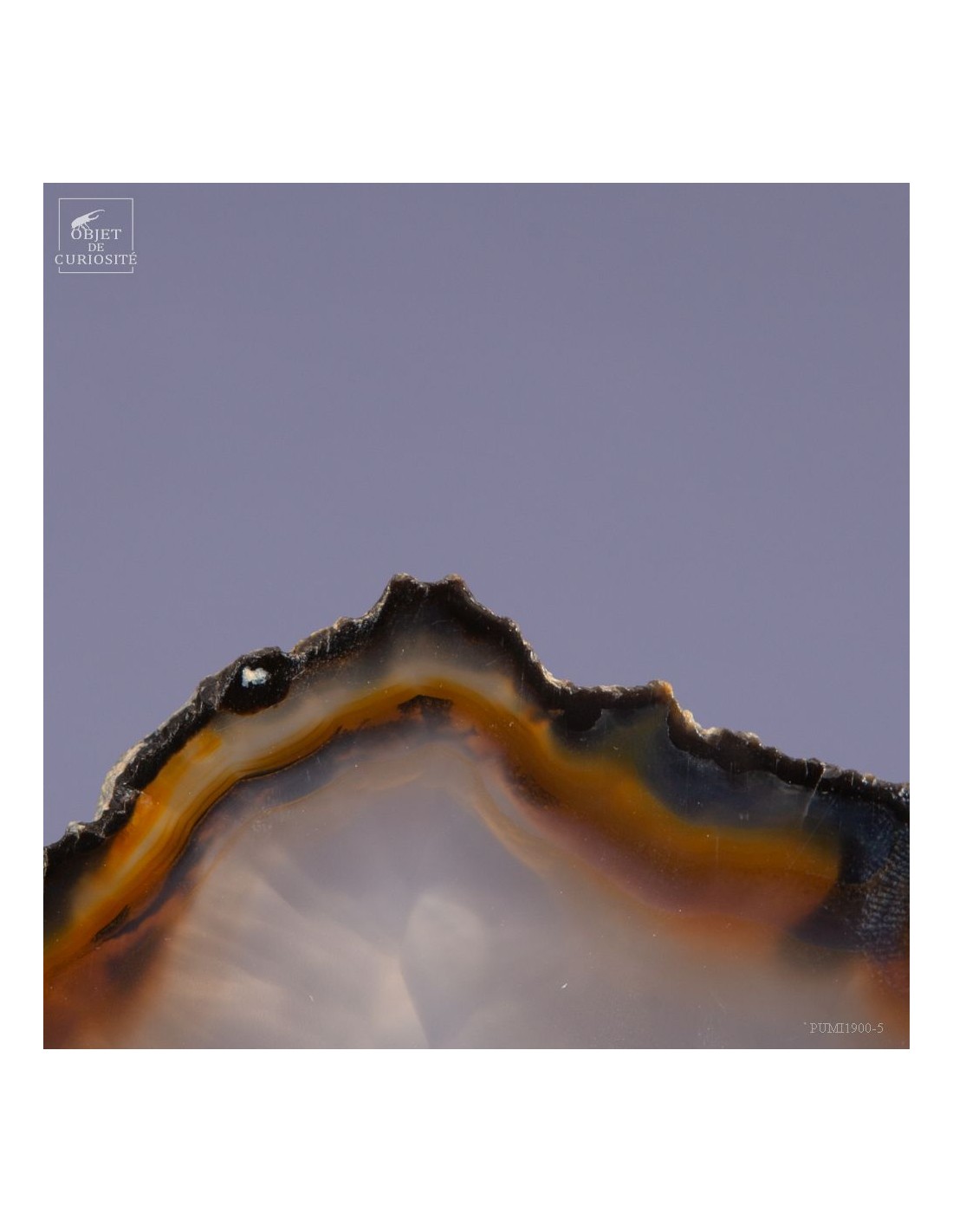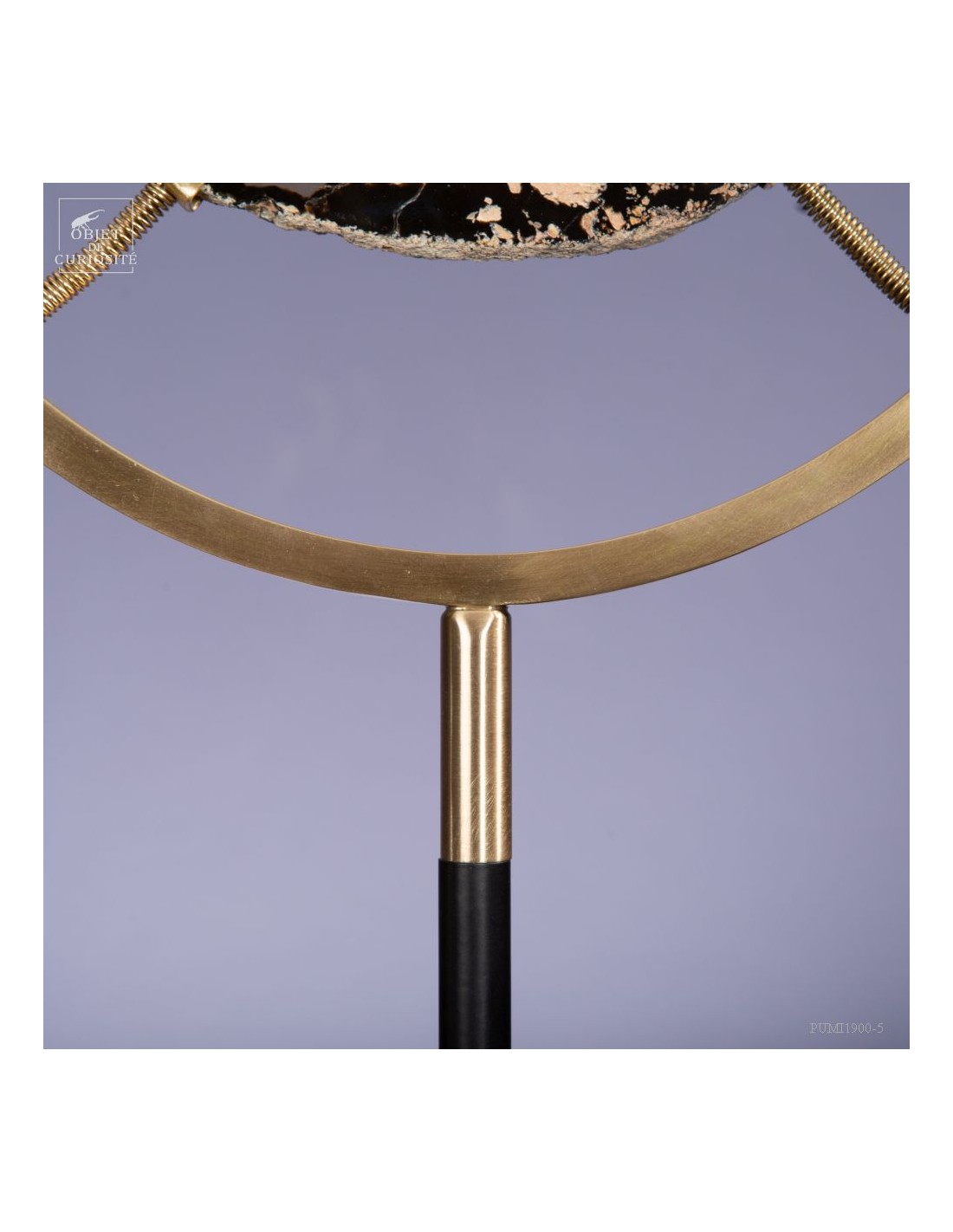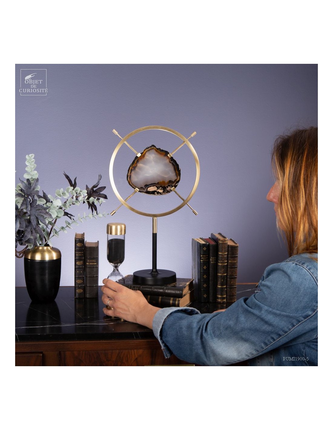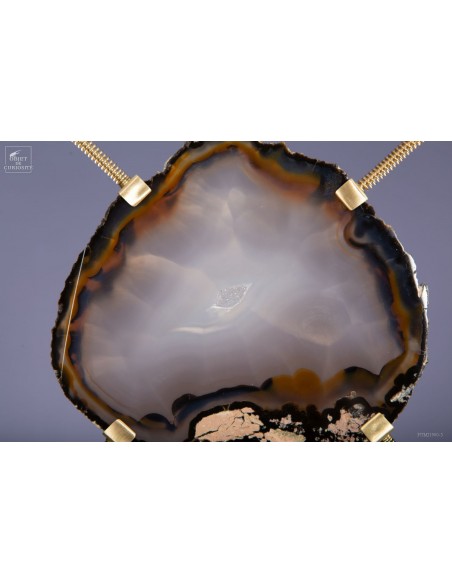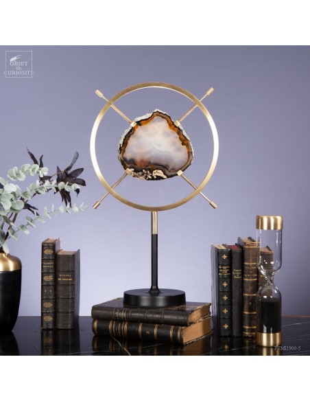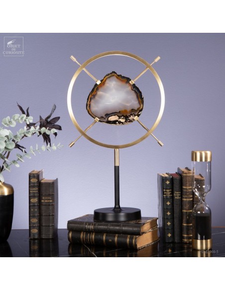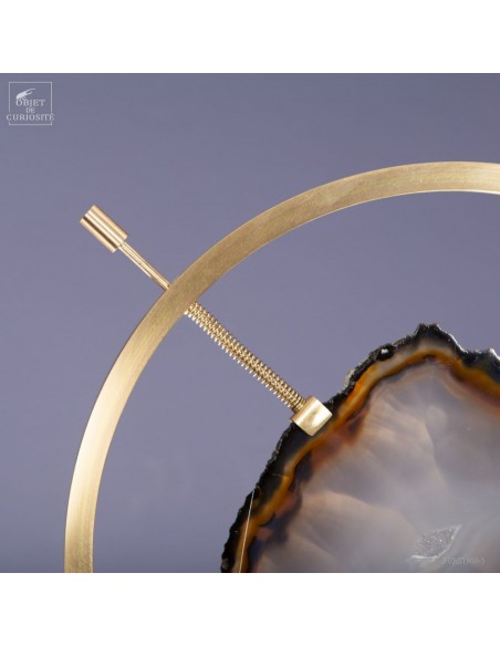 Tranche d'Agate naturelle provenant du Brésil, sur un élégant présentoir noir et laiton satiné. Et avant d'être cette pierre, c'était une bulle d'air dans la lave refroidie d'un volcan. La lave est devenue du basalte: une roche poreuse, et cette chambre a été successivement remplie, sur des millénaires, par de l'eau avec des minéraux dissous. Comme de l'oxyde de Manganèse qui a donné ces lignes noires tout autour. Chaque inondation a apporté une couche de densité et couleur différente...