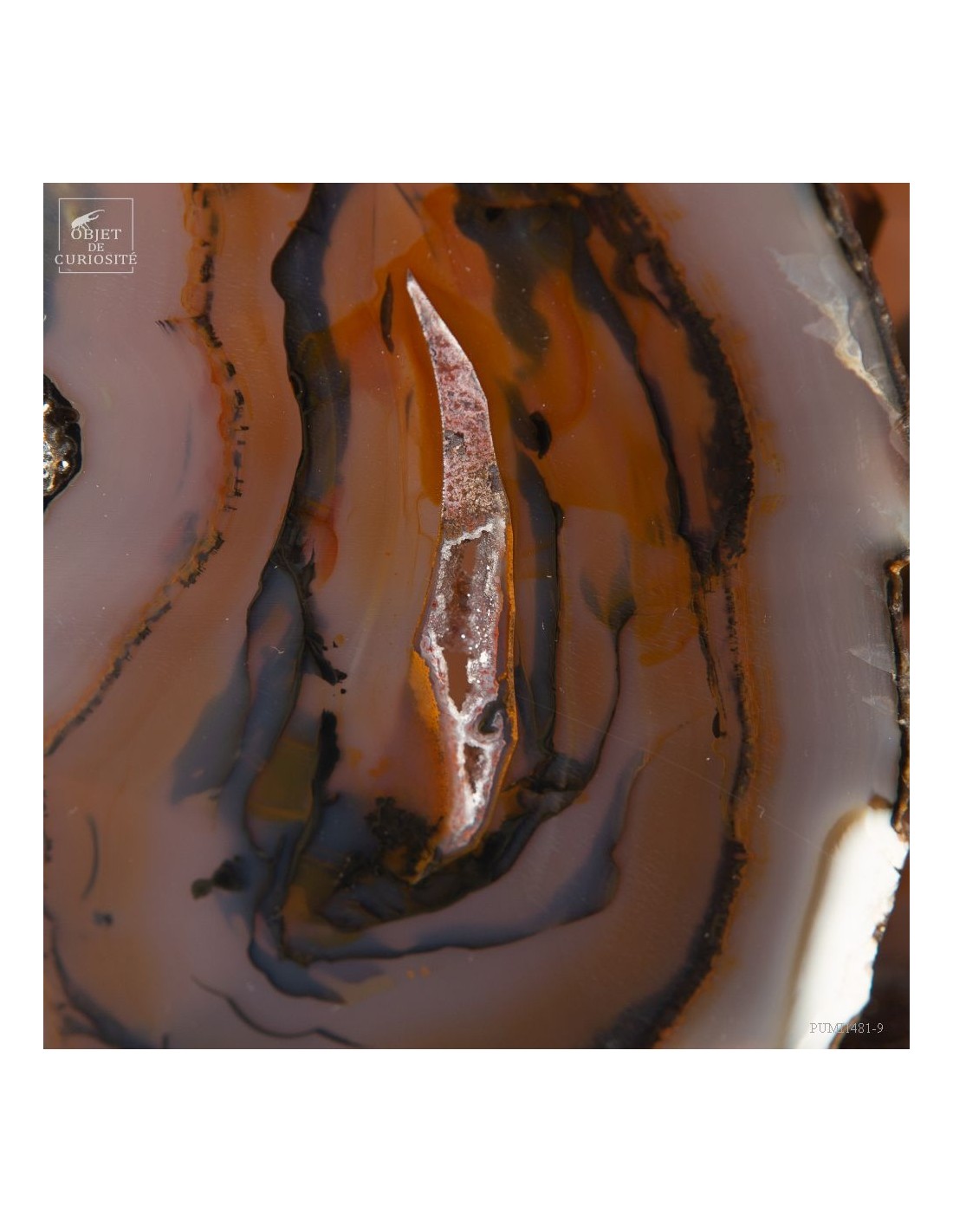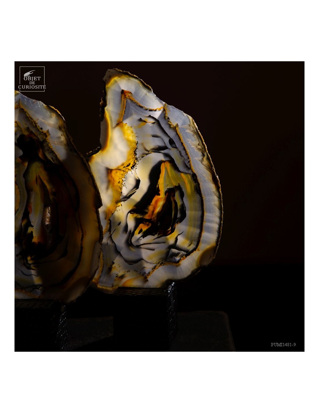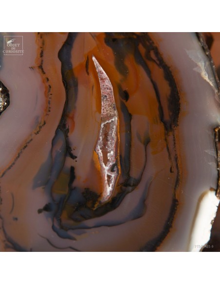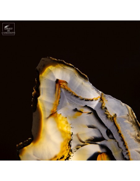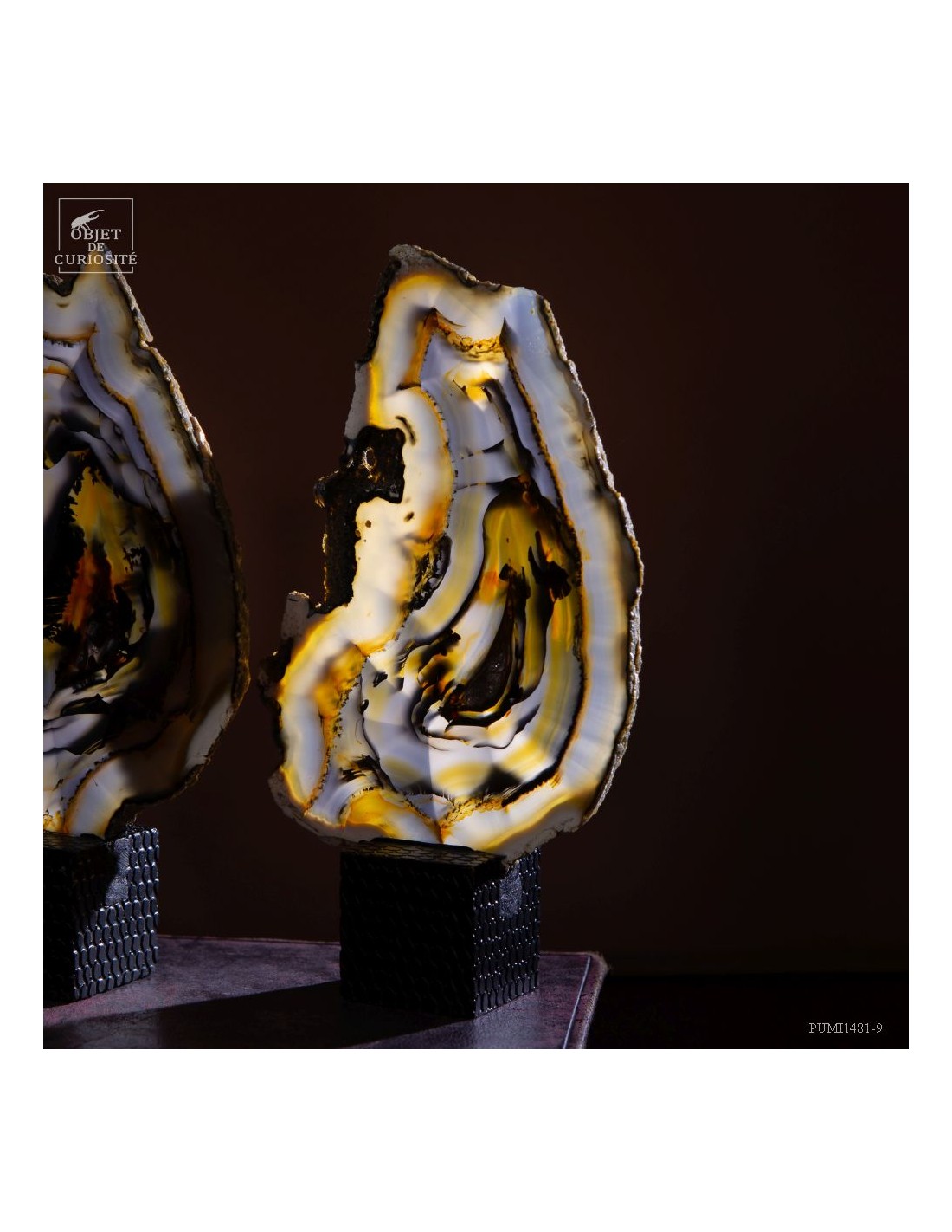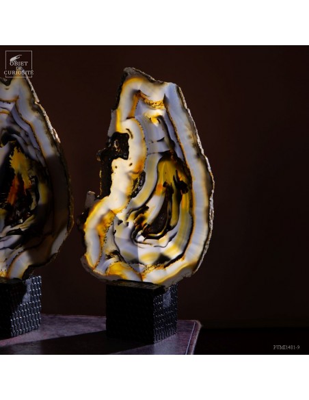 Cette étrange sculpture est en fait une géode d'agate coupée en tranches successives. Ces fines tranches sont encore plus belles lorsqu'elles sont traversées par la lumière. Toutes ensembles elles reconstituent les motifs de cette magnifique pierre du Brésil, un galet en fait.