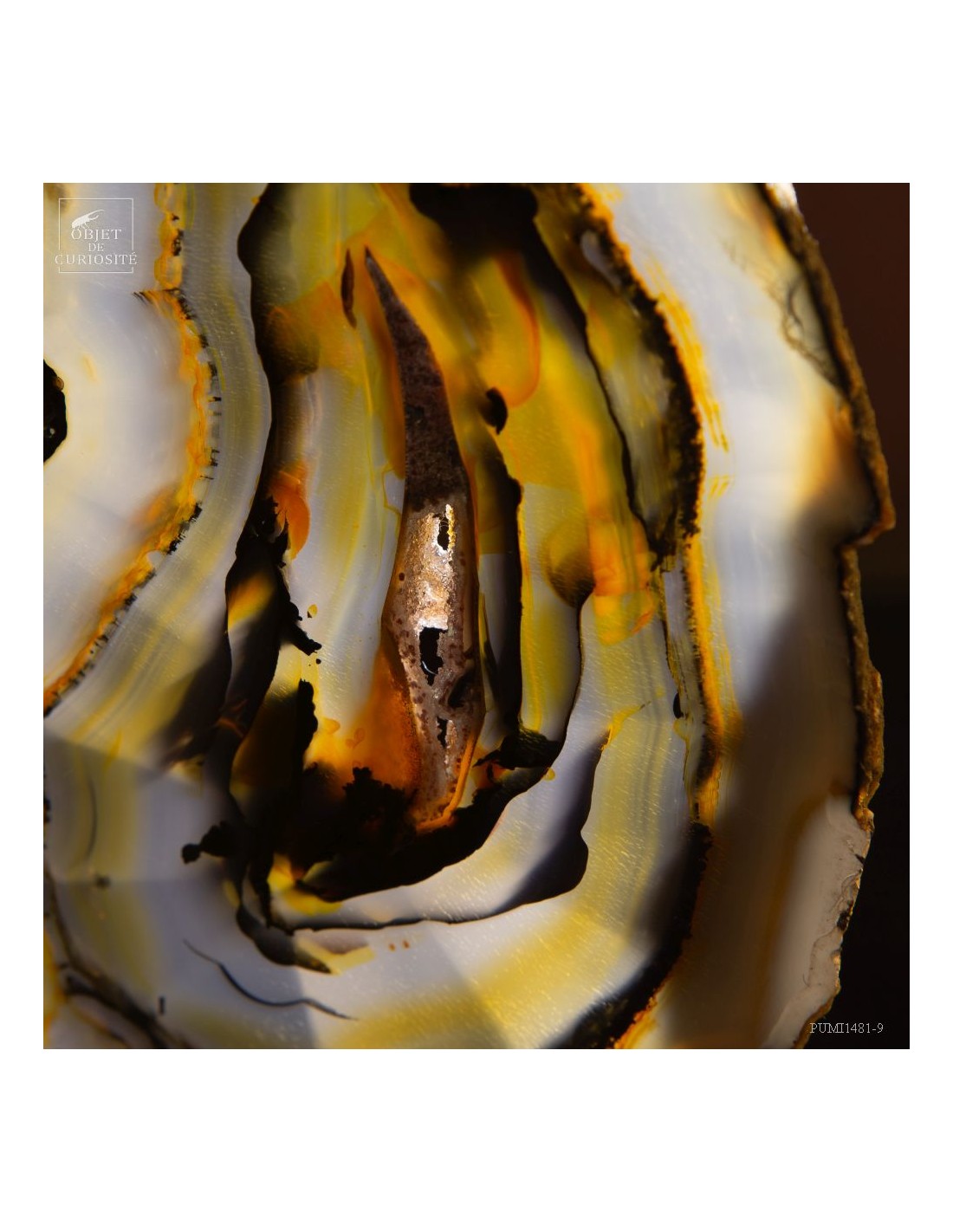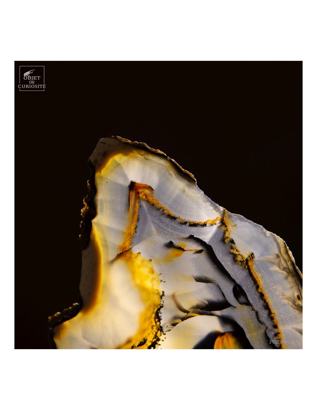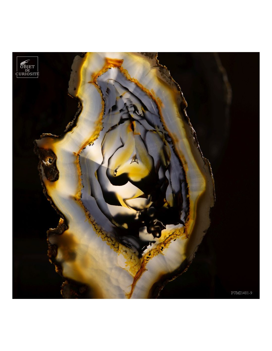 Cette étrange sculpture est en fait une géode d'agate coupée en tranches successives. Ces fines tranches sont encore plus belles lorsqu'elles sont traversées par la lumière. Toutes ensembles elles reconstituent les motifs de cette magnifique pierre du Brésil, un galet en fait.