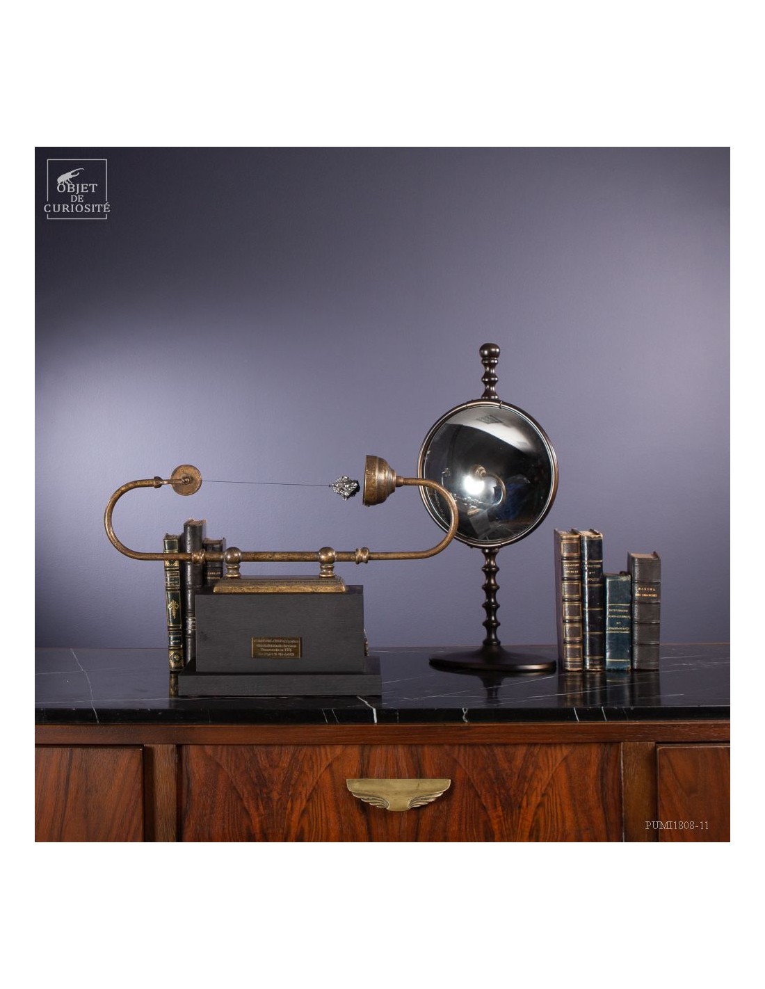 Cette pierre grise a une histoire incroyable. Elle a été découverte en Argentine, mais elle vient de l'espace! C'est une sidérite -une météorite composée de fer et de nickel- Elle provient du noyau d'un astéroïde, mais on ignore encore sa provenance exacte. Cette météorite a été citée pour la première fois par les conquistadores Espagnoles lors de l'invasion de l'Argentine en 1576. Mais après avoir daté, au Carbone 14, les arbres qui étaient écrasés sous la météorite, il apparaît qu'elle est tombée sur terre il y a plus de 4000 ans. Avec ce mécanisme en laiton, vous pouvez posséder sur votre bureau une partie de l'histoire du monde. Et elle vole toujours!