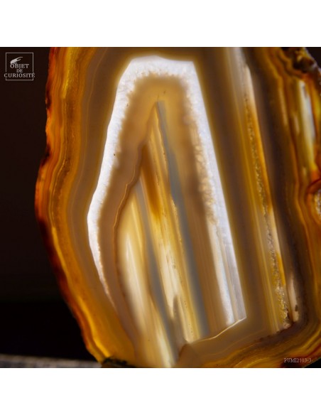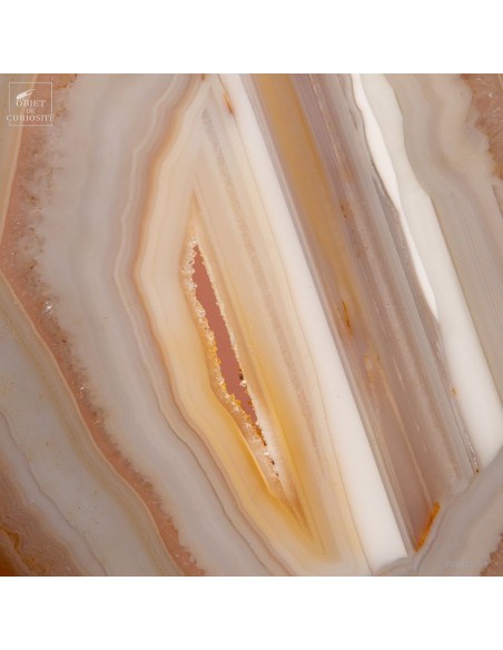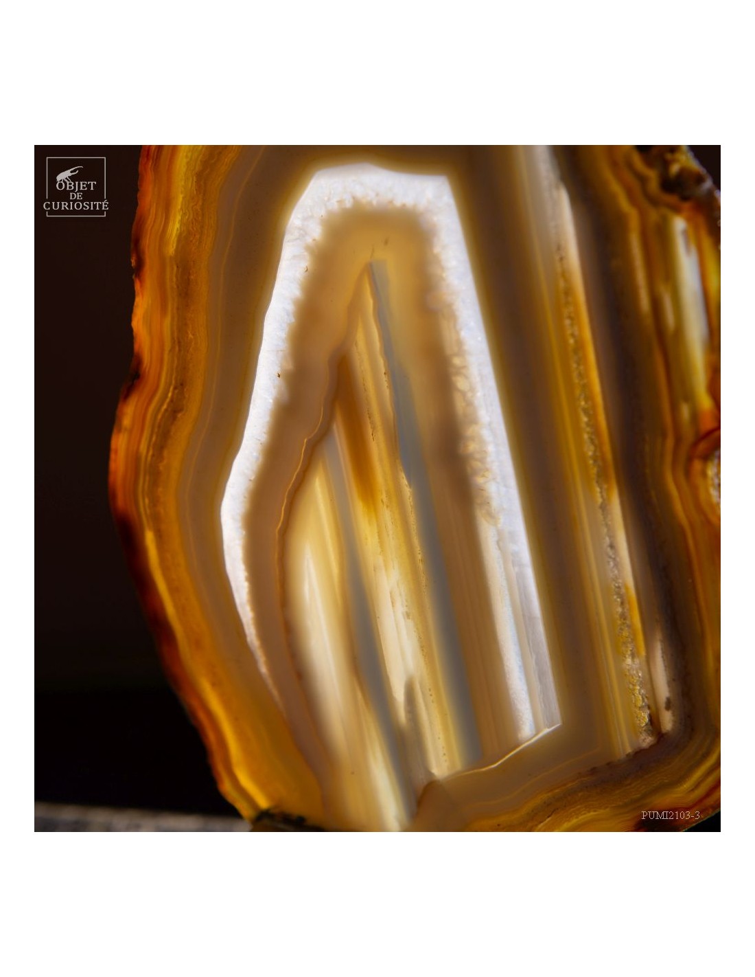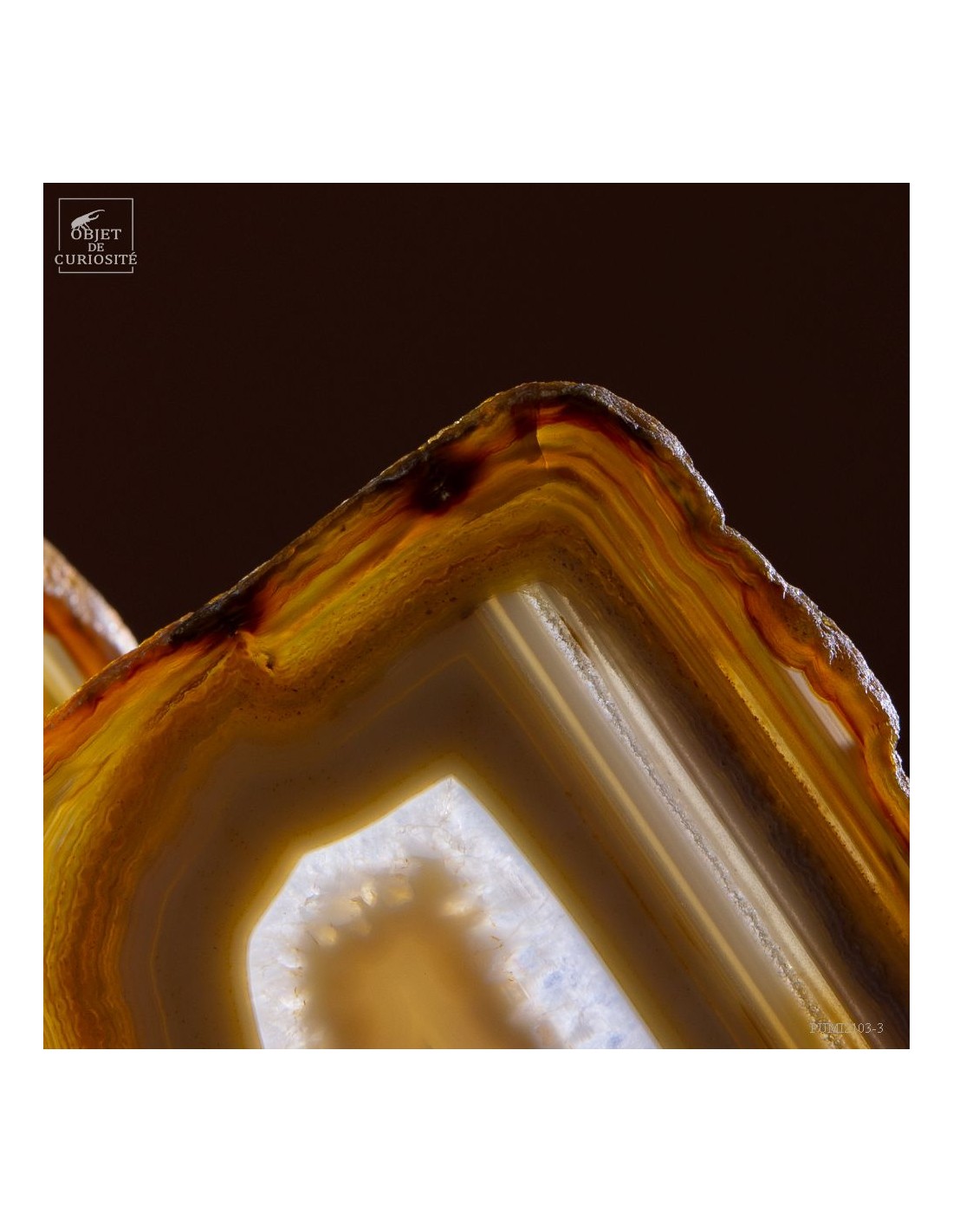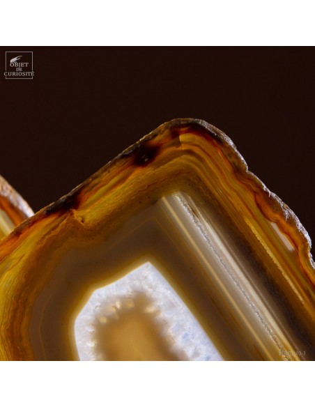 Cette étrange sculpture est en fait une géode d'agate coupée en tranches successives. Ces fines tranches sont encore plus belles lorsqu'elles sont traversées par la lumière. Toutes ensembles elles reconstituent les motifs de cette magnifique pierre du Brésil, un galet en fait.