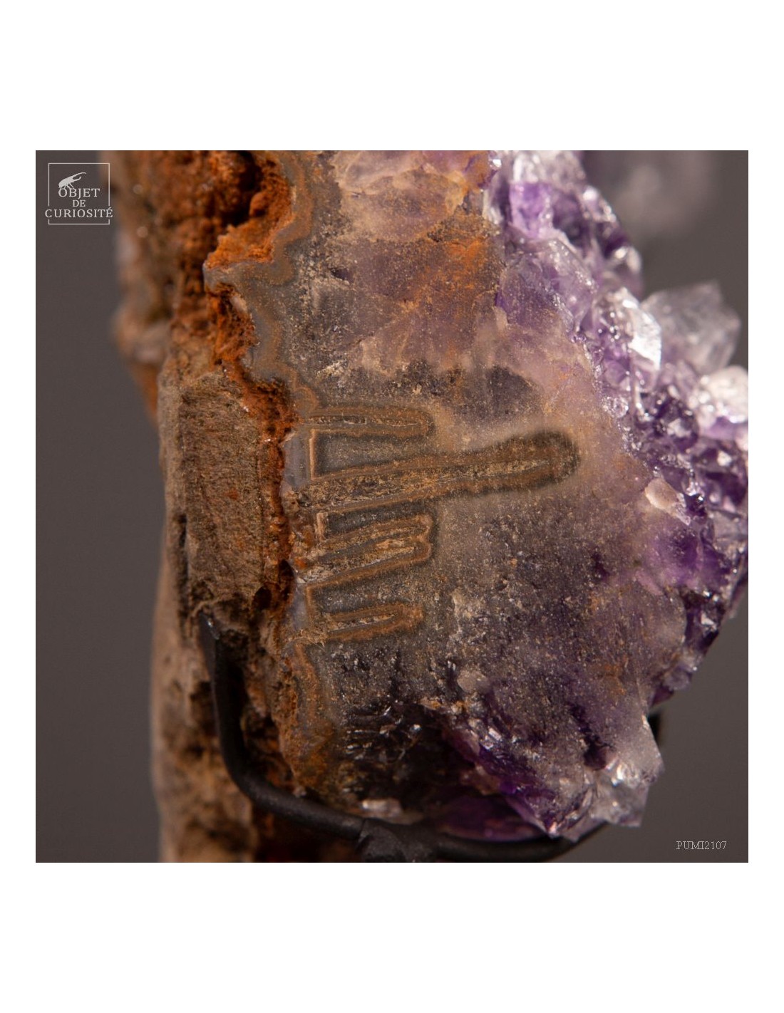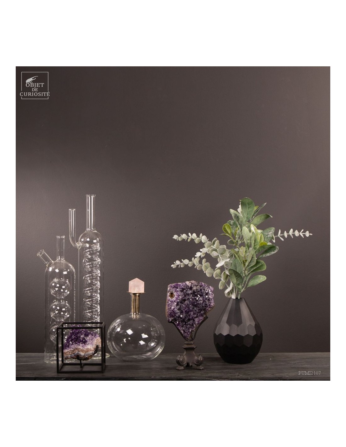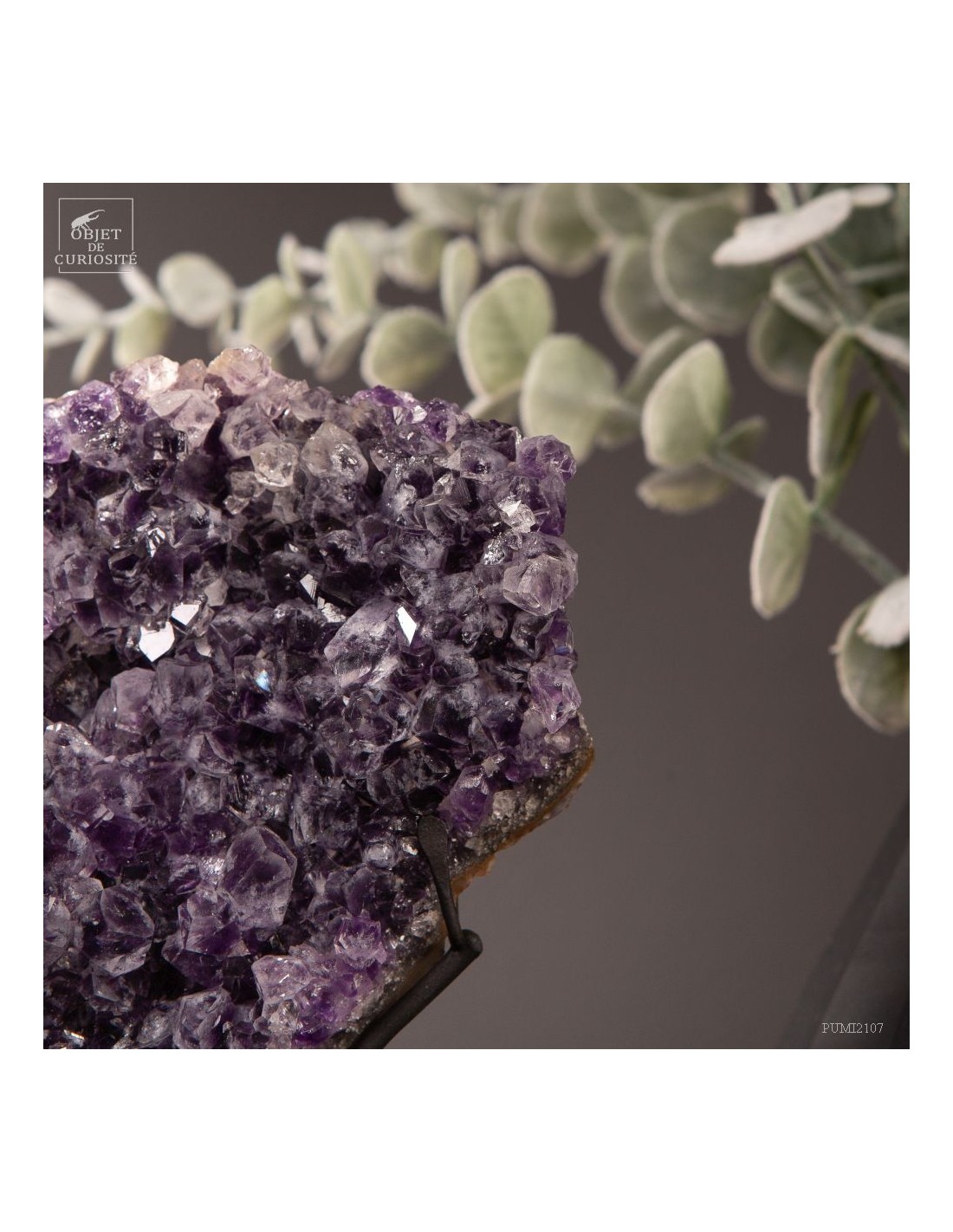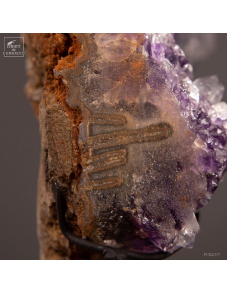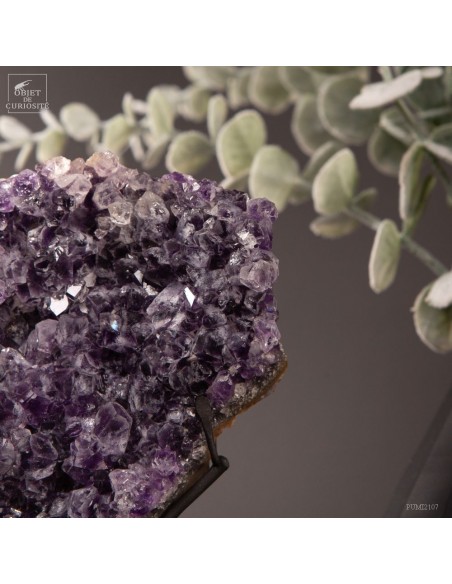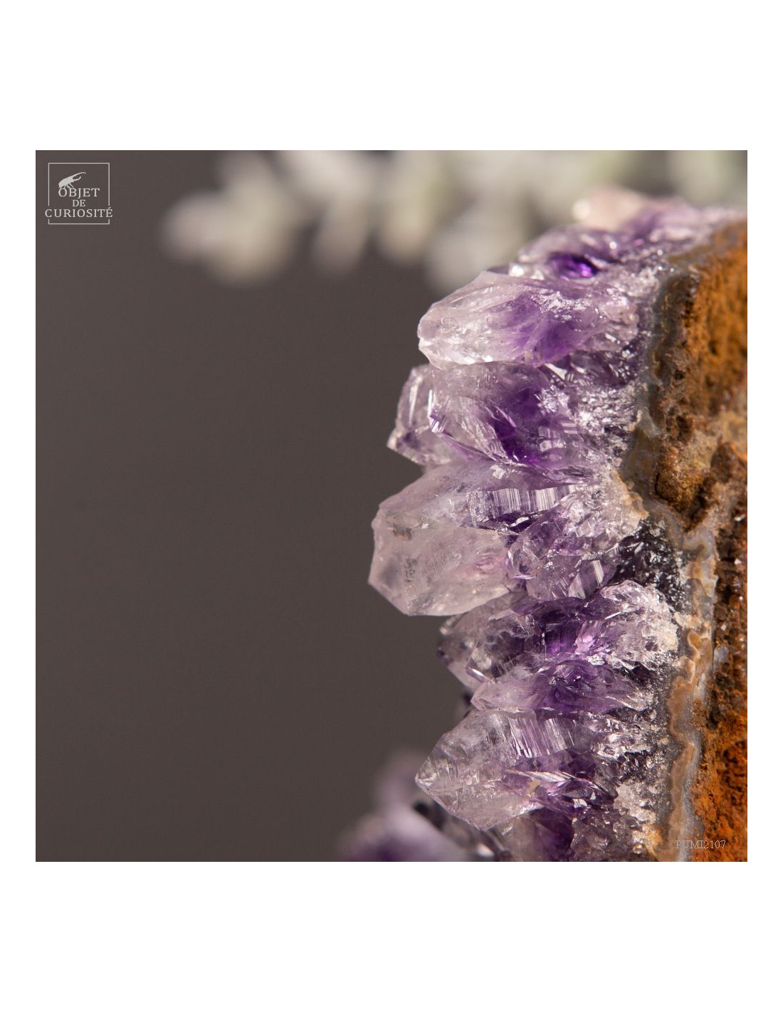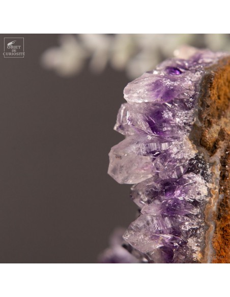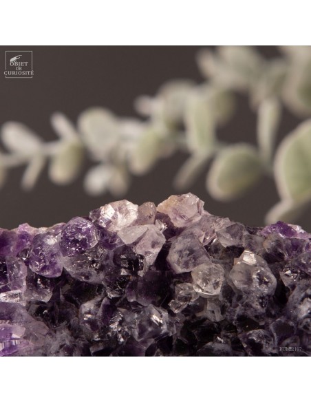 L’améthyste est un type de quartz violet, d’origine magmatique. On la trouve dans des cavités formées il y a des millions d’années par d’anciennes bulles de gaz figées dans la lave, dans lesquelles a circulé une eau très chaude concentrée en silice et en minéraux de fer. C’est la quantité plus ou moins importante de minéraux de fer ainsi que leur type, qui va déterminer la coloration de ces sublimes cristaux. ici une dernière cristallisation s'est faite avec moins d'oxydes de fer, donc des cristaux plus transparents par dessus les violets intense.