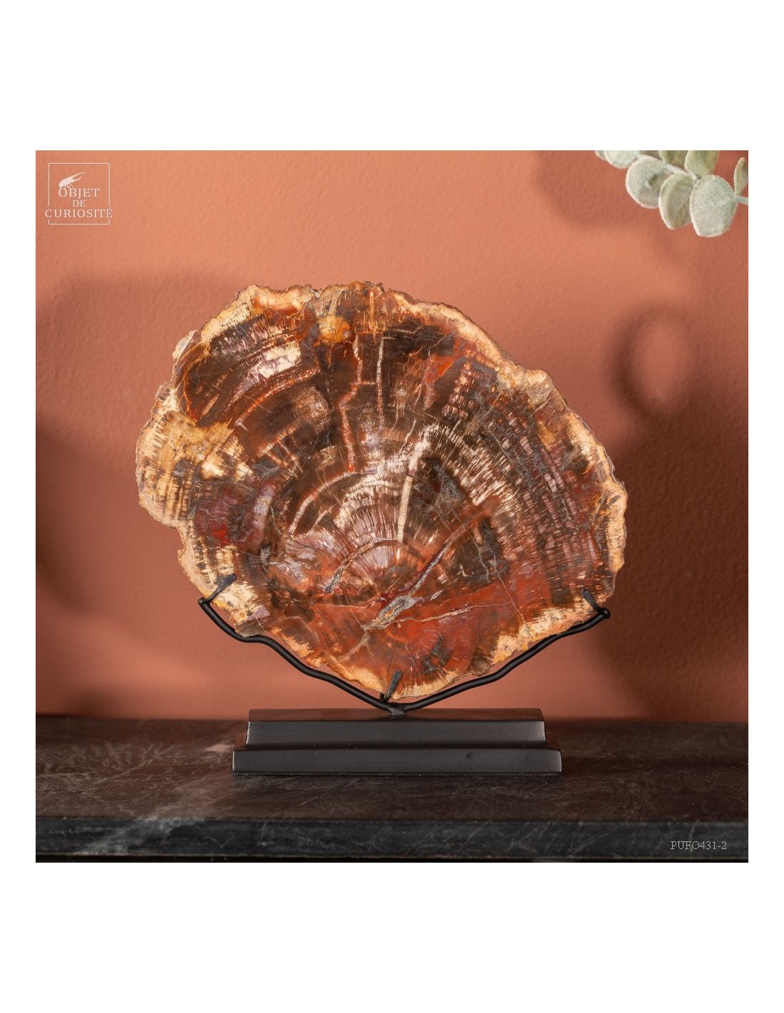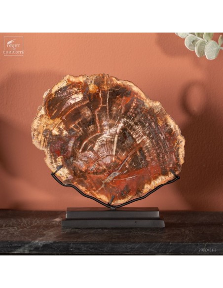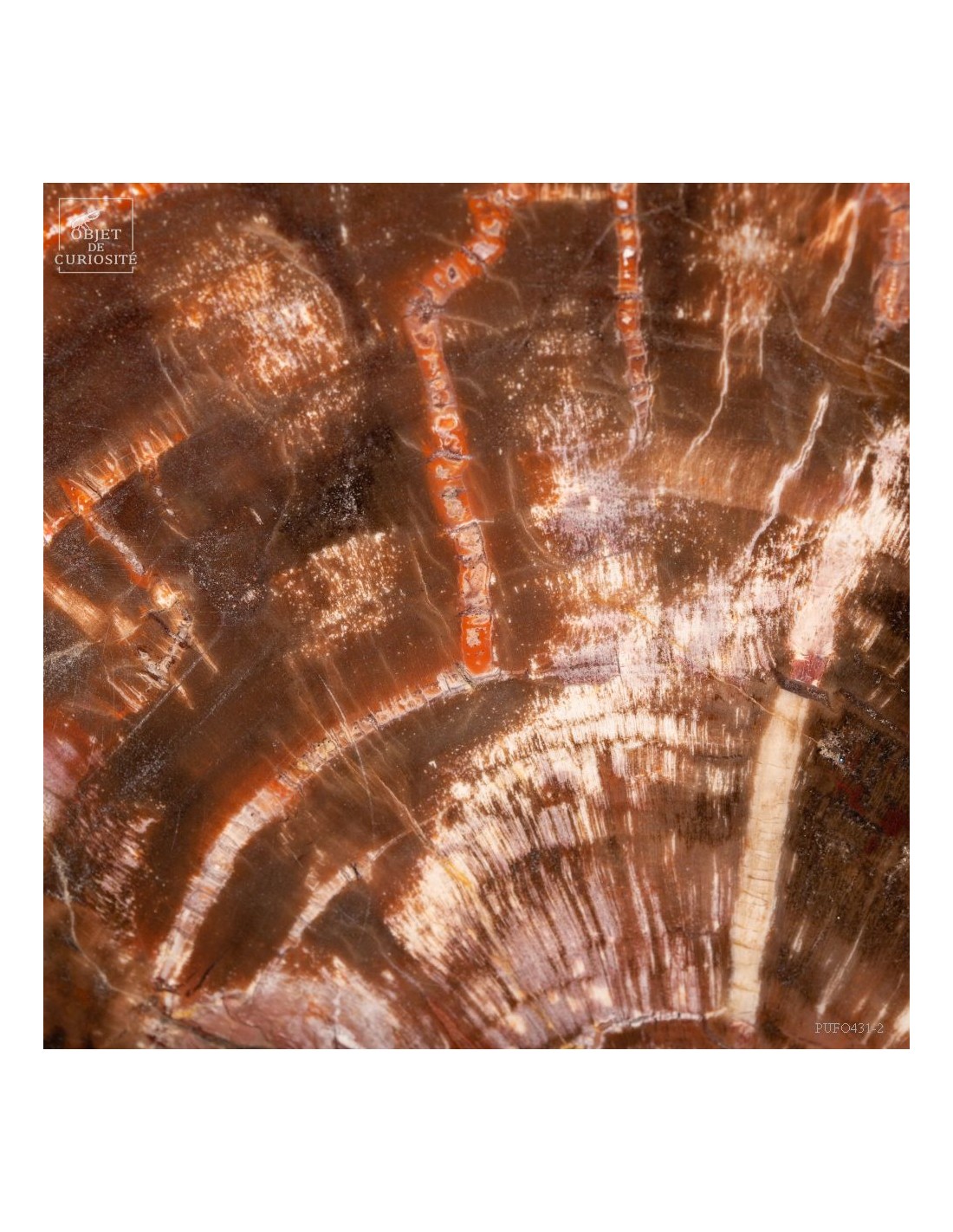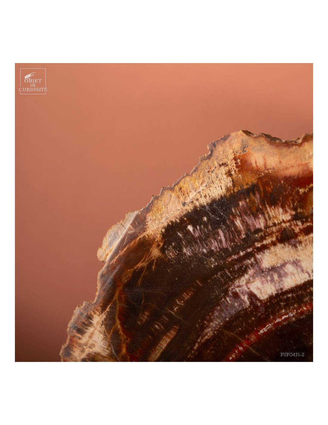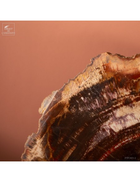 Nous avons scié et poli cette tranche de bois fossilisée afin de révéler les cernes de croissance ainsi que ces élégants tons brun / rouge.