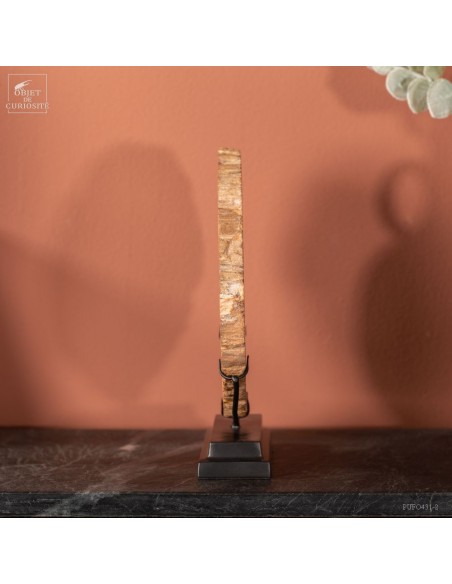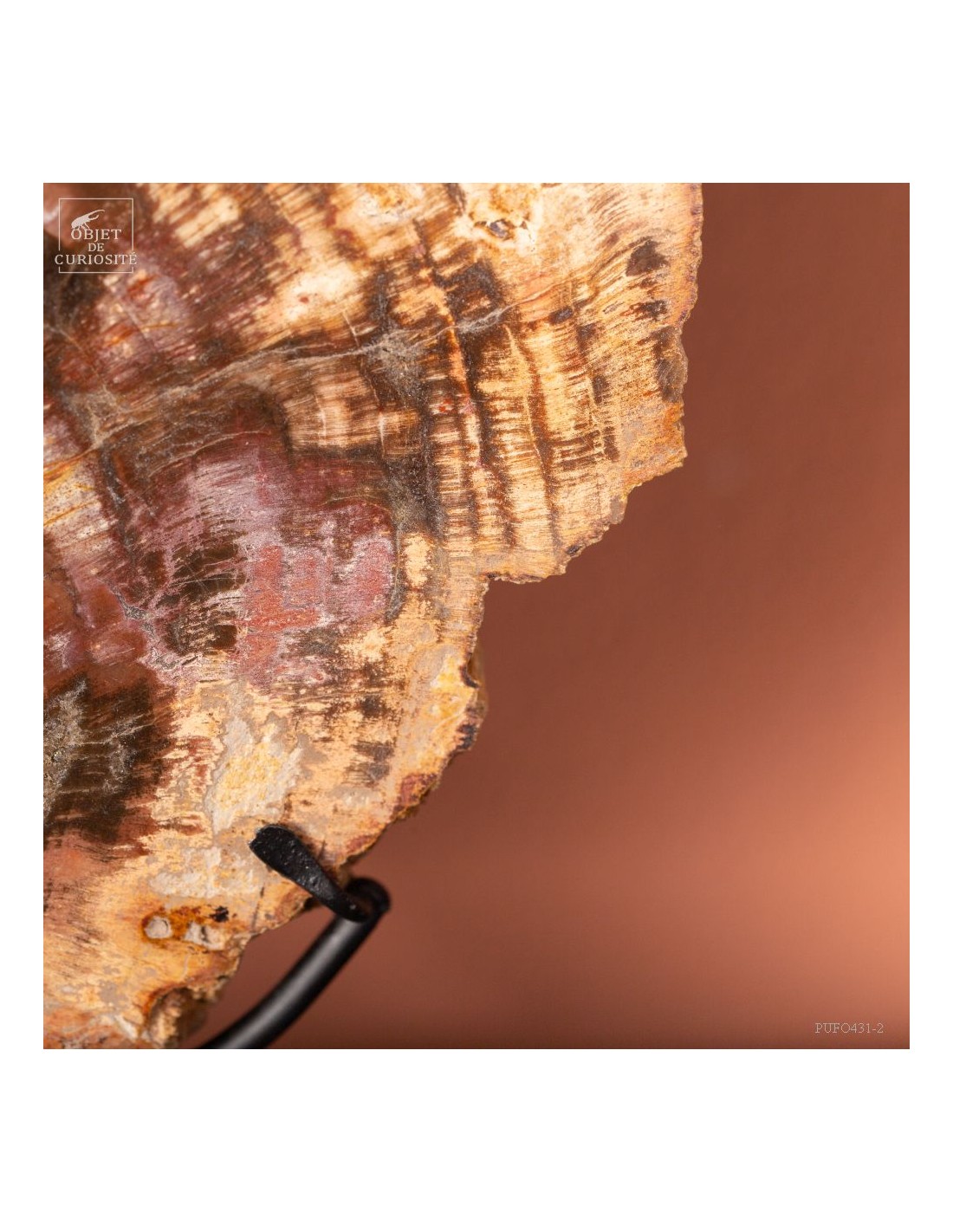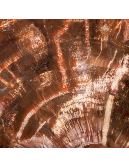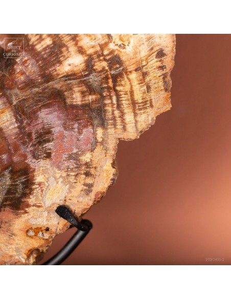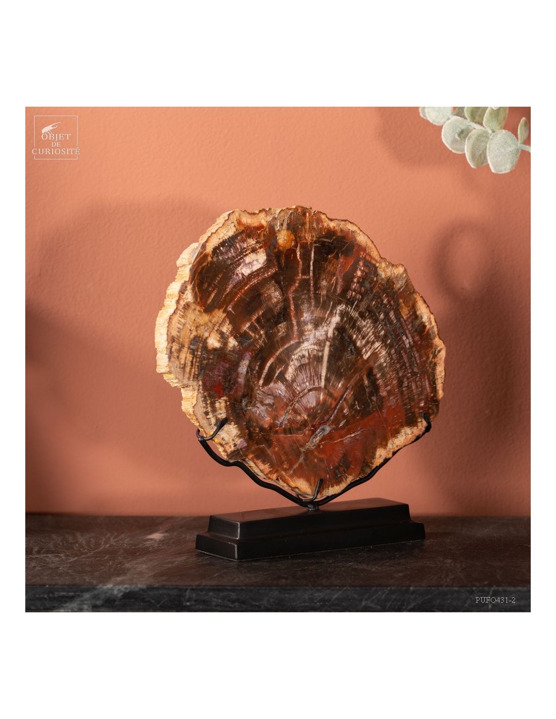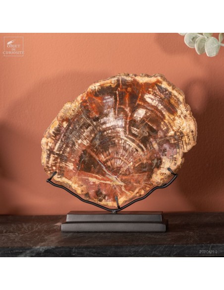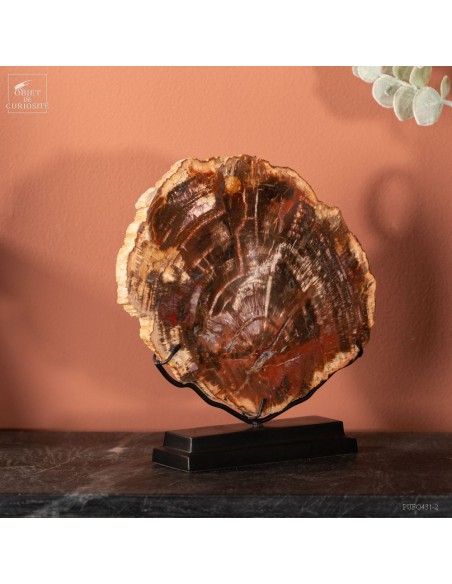 Nous avons scié et poli cette tranche de bois fossilisée afin de révéler les cernes de croissance ainsi que ces élégants tons brun / rouge.