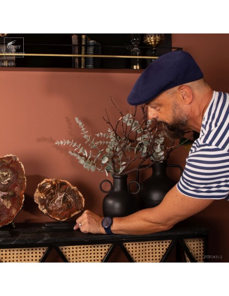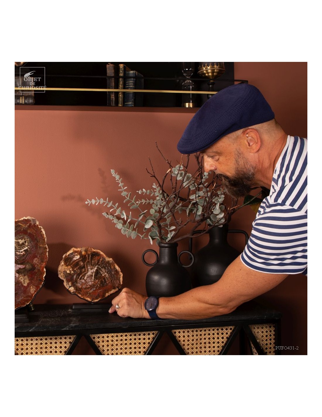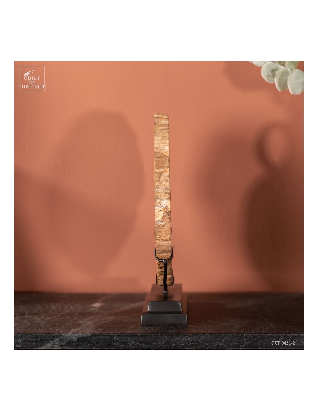 Agé d’environ 220 millions d’années, cet Araucaria (conifère) pétrifié de Madagascar a traversé le temps pour, de végétal, devenir minéral. Ce long processus a débuté lorsque transporté par les fleuves, le tronc d’arbre a été enseveli sous des dépôts sédimentaires, puis petit à petit, la silice a remplacé le carbone de bois (on appelle ce principe l’épigénisation).